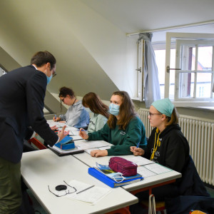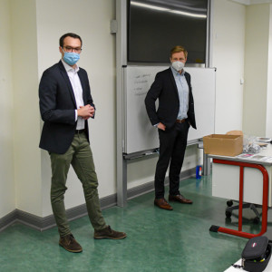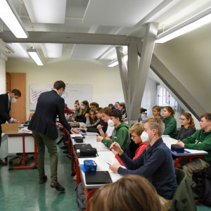 Zwei Schüler stehen an der Tafel und beenden gerade ein Referat, als zwei Männer in Anzügen zur Tür herein kommen. Sie gehören zu den Wirtschaftsjunioren, einem Netzwerk aus Unternehmer:innen von 18 bis 40 Jahren, deren Ziel es ist, junge Menschen für die Wirtschaft zu begeistern. Sie bezeichnen sich selbst als führendes Netzwerk für junge Unternehmer:innen und Führungskräfte in Lübeck.