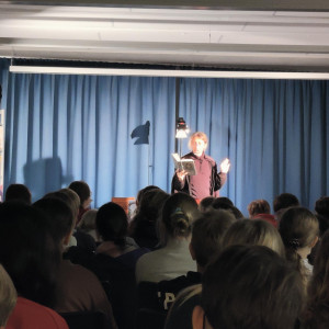 Doch lange dauert die Pause nicht: Nun mit Umhang statt Kordel um der Hüfte geht es mit Bartimäus weiter. Das ist ein jahrtausendealter Dschinn, der von einem Jungen beschworen wurde und nun ihm gehorchen soll. Doch klappt das wirklich? Zwei spannende Szenen wurden uns vorgelesen. Viele Dschinns, Zauberer und andere Fabelwesen schienen mit Herrn Rudloff durch die Bücherei zu fliegen. Der schwarze Umhang wirbelte durch den Raum und Herr Rudloff sprang zwischen den Rollen genauso schnell hin und her, wie der Schlagabtausch im Buch zwischen dem bösen Zauberer und dem Dschinn Bartimäus.