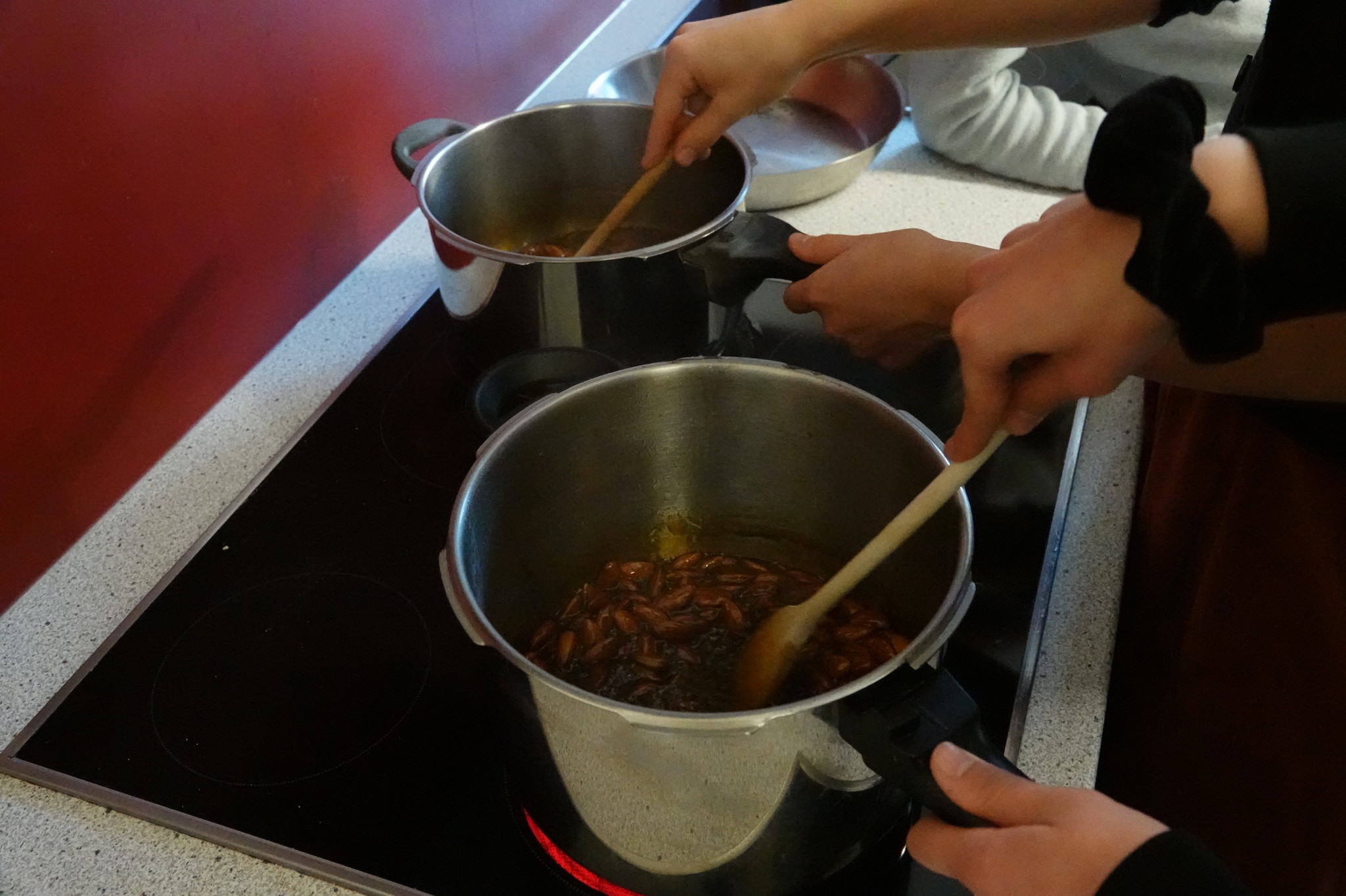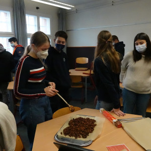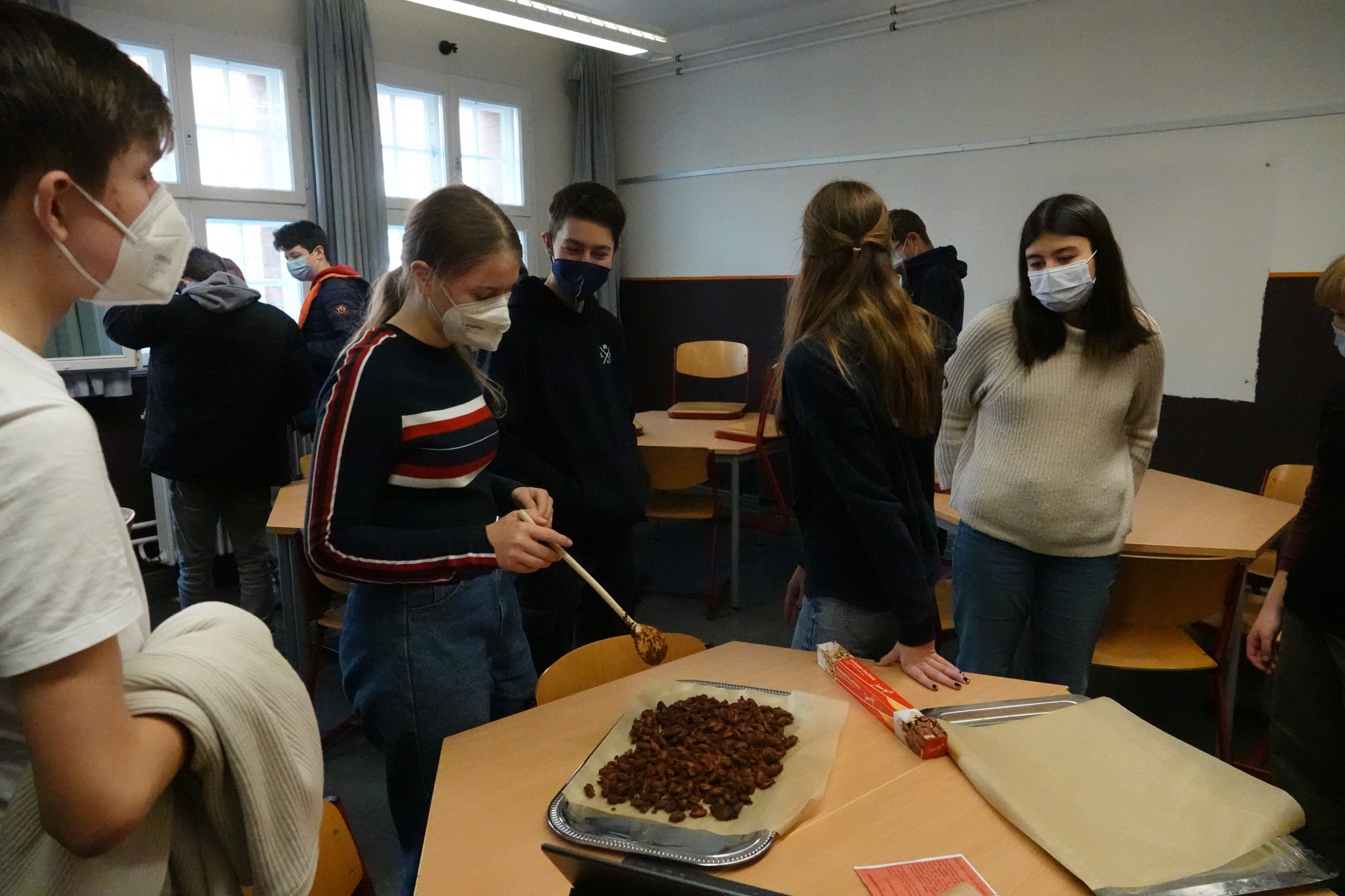 Am letzten Dienstag strömte der süße Duft von Zimt und Zucker aus der Schulküche. Dazu hörte man stimmungsvolle Weihnachtsmusik. Wir, die 9e, hatten beschlossen für den diesjährigen Adventskalender etwas wirklich Weihnachtliches vorzubereiten. Und wie kann man besser in die Adventszeit starten als mit gebrannten Mandeln? (Vor allem, nachdem wir im letzten Jahr darauf verzichten mussten).