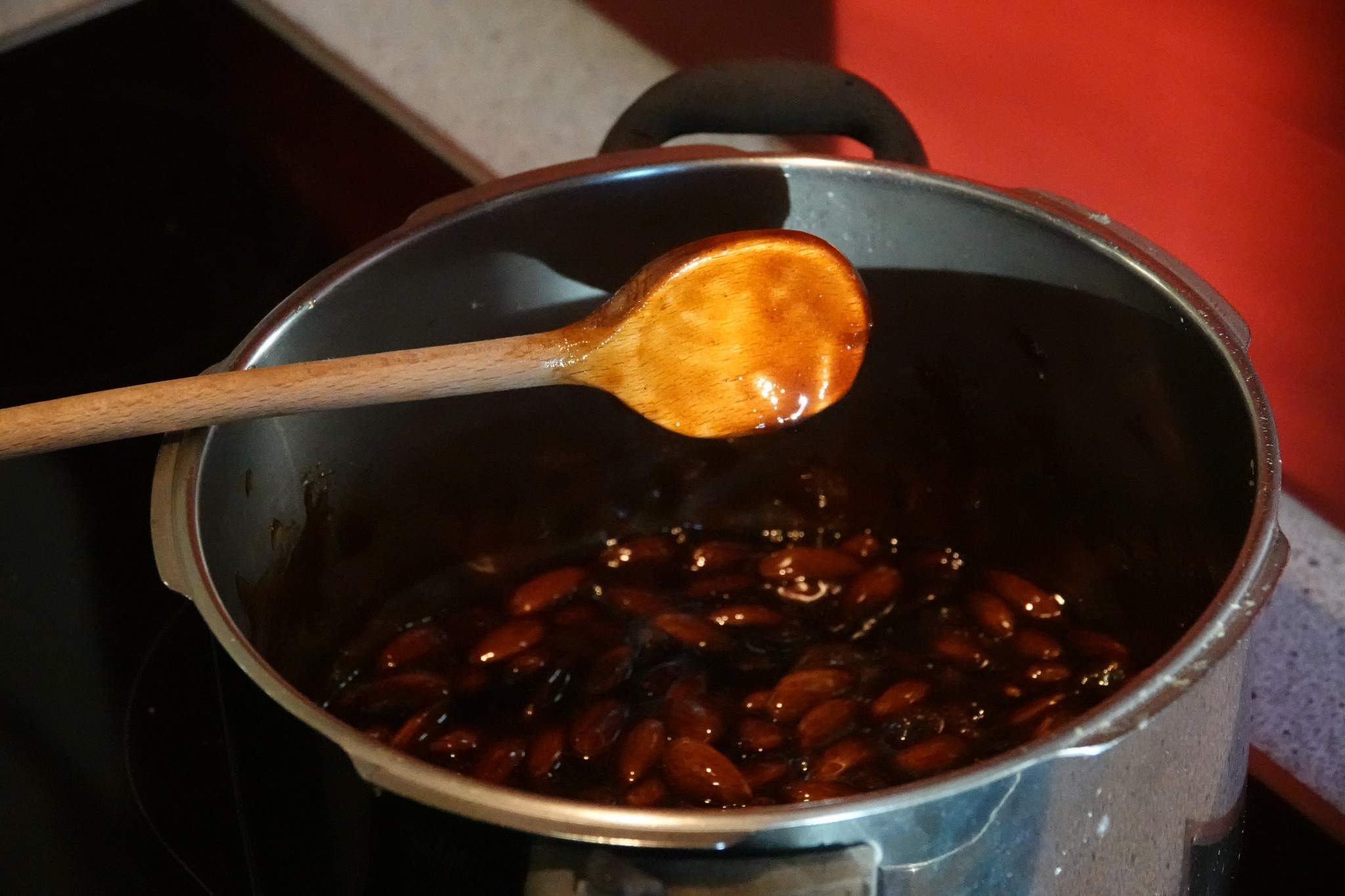 Als erstes vermischt man Zucker und Zimt und erhitzt Beides in einem Topf. Wenn der Zucker flüssig geworden ist und leicht anfängt zu blubbern, gebt ihr die Mandeln dazu. Dann heißt es immer schön umrühren. Achtung: Der Herd darf nicht zu heiß sein, weil der Zucker sonst schnell verbrennen könnte. Am besten bei kleiner Hitze kochen.