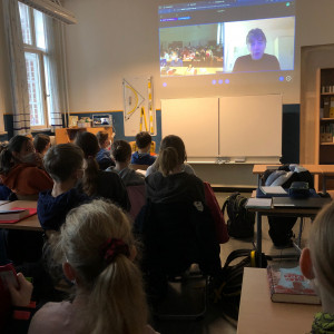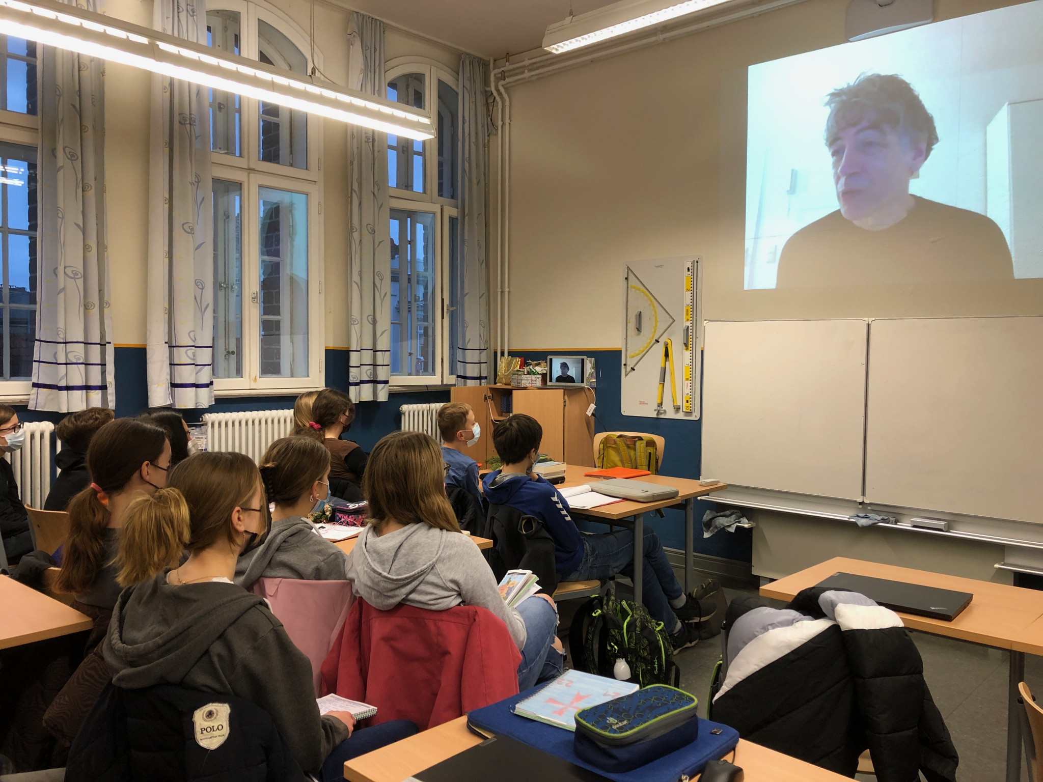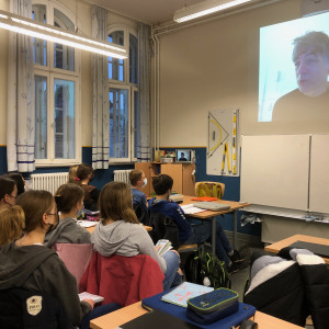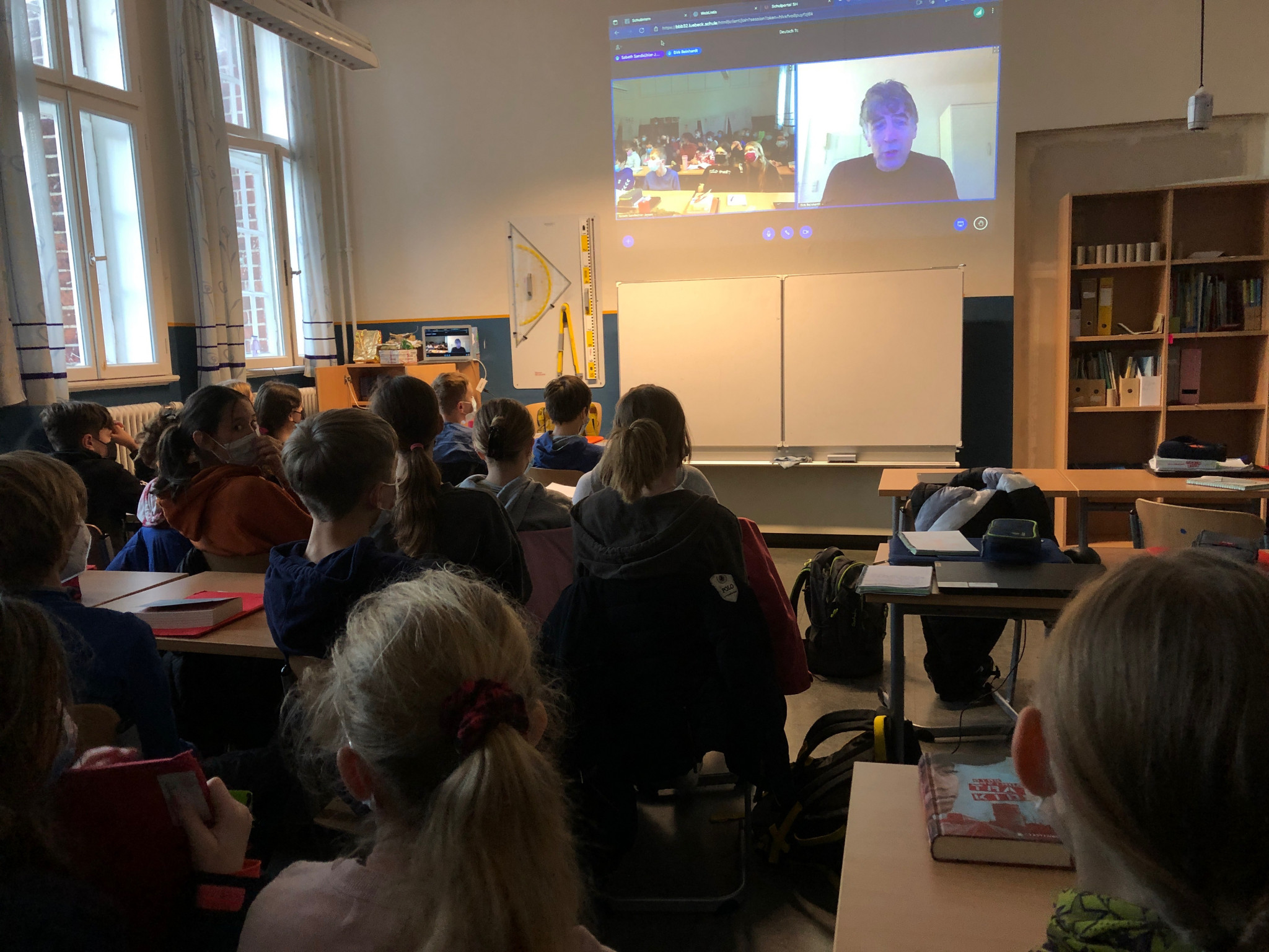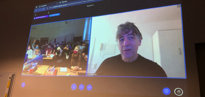 Wenn die pandemische Lage sogar Schulveranstaltungen schwierig werden lässt, ist Erfindungsgeist gefragt. So gab es für die Klasse 7c zwar keine Dichterlesung in der Aula, dafür kam der Jugendbuchautor Dirk Reinhardt direkt ins Klassenzimmer, digital zwar aus dem Münsterland und doch auf der Leinwand ganz nah. Im Deutschunterricht wurde zuvor dessen Jugendbuchroman „Train Kids“ mit Frau Sandkühler-Jensen behandelt.