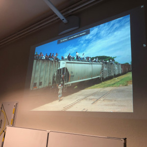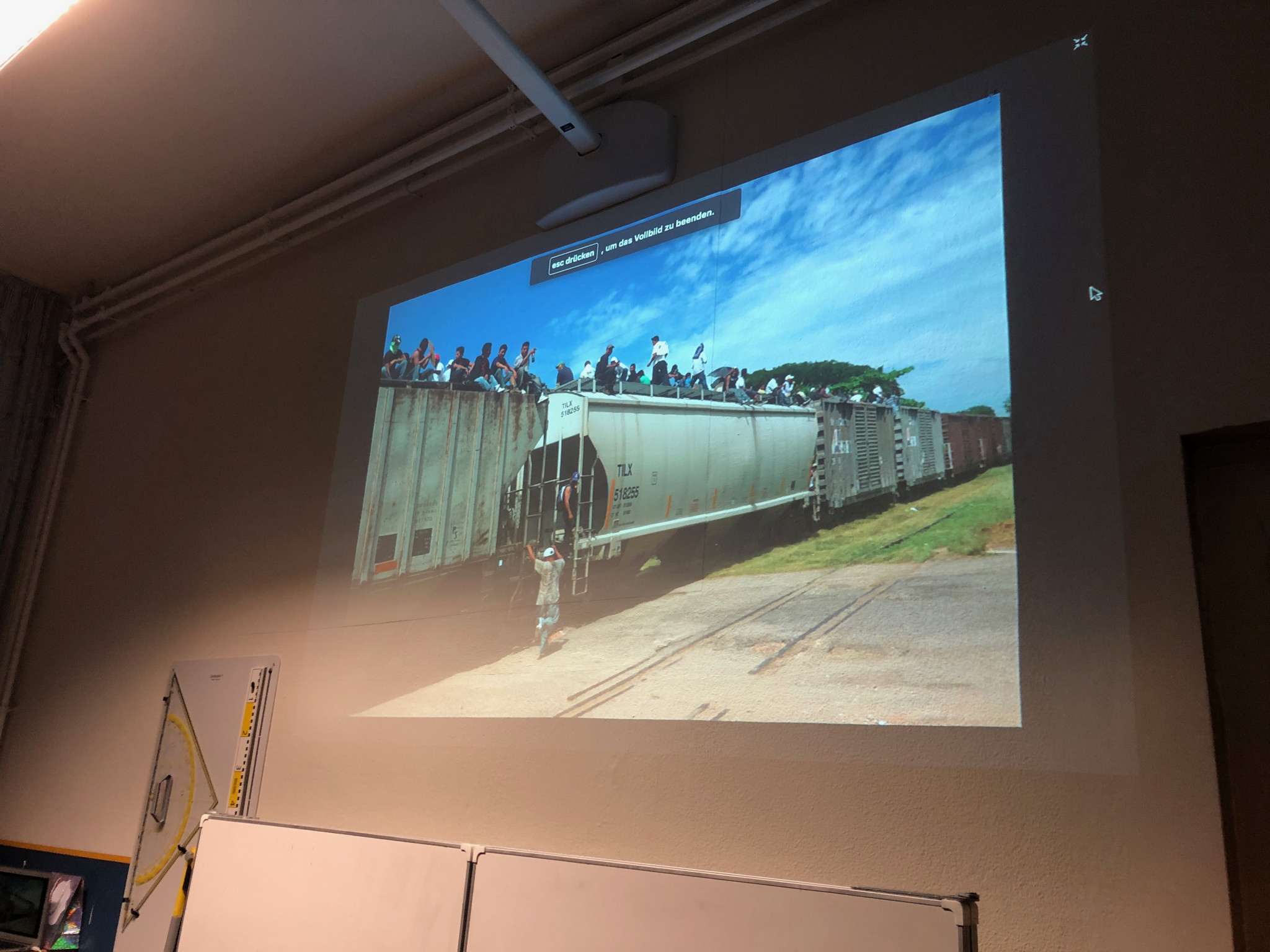 „Train Kids“, ein Flüchtlingsroman, der von fünf Jugendlichen aus lateinamerikanischen Ländern handelt, die auf eigene Faust versuchen, in die USA zu gelangen, bot genügend Stoff, um Fragen an den Autor zu stellen. Reinhardt recherchierte selbst in Mexiko und suchte den Kontakt zu den jugendlichen Flüchtlingen. Sehr bewegend zeigte er uns seine Bilder und berichtete dabei von seinen Erfahrungen, von Menschen, die er kennen gelernt hat, und deren Erzählungen. Spannend war es auch zu erfahren, wie aus diesen Begegnungen schließlich der Roman entstanden ist.