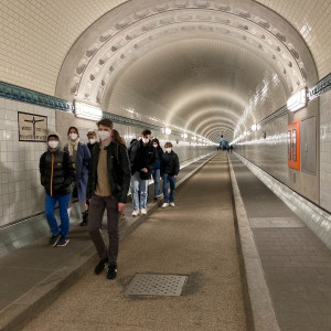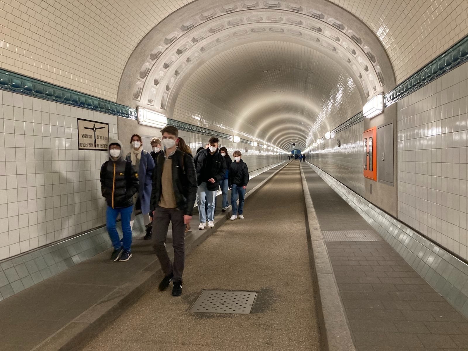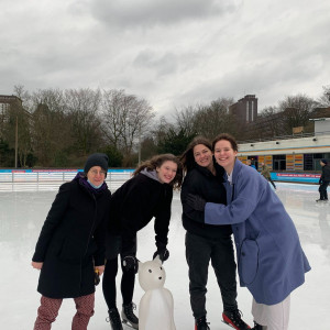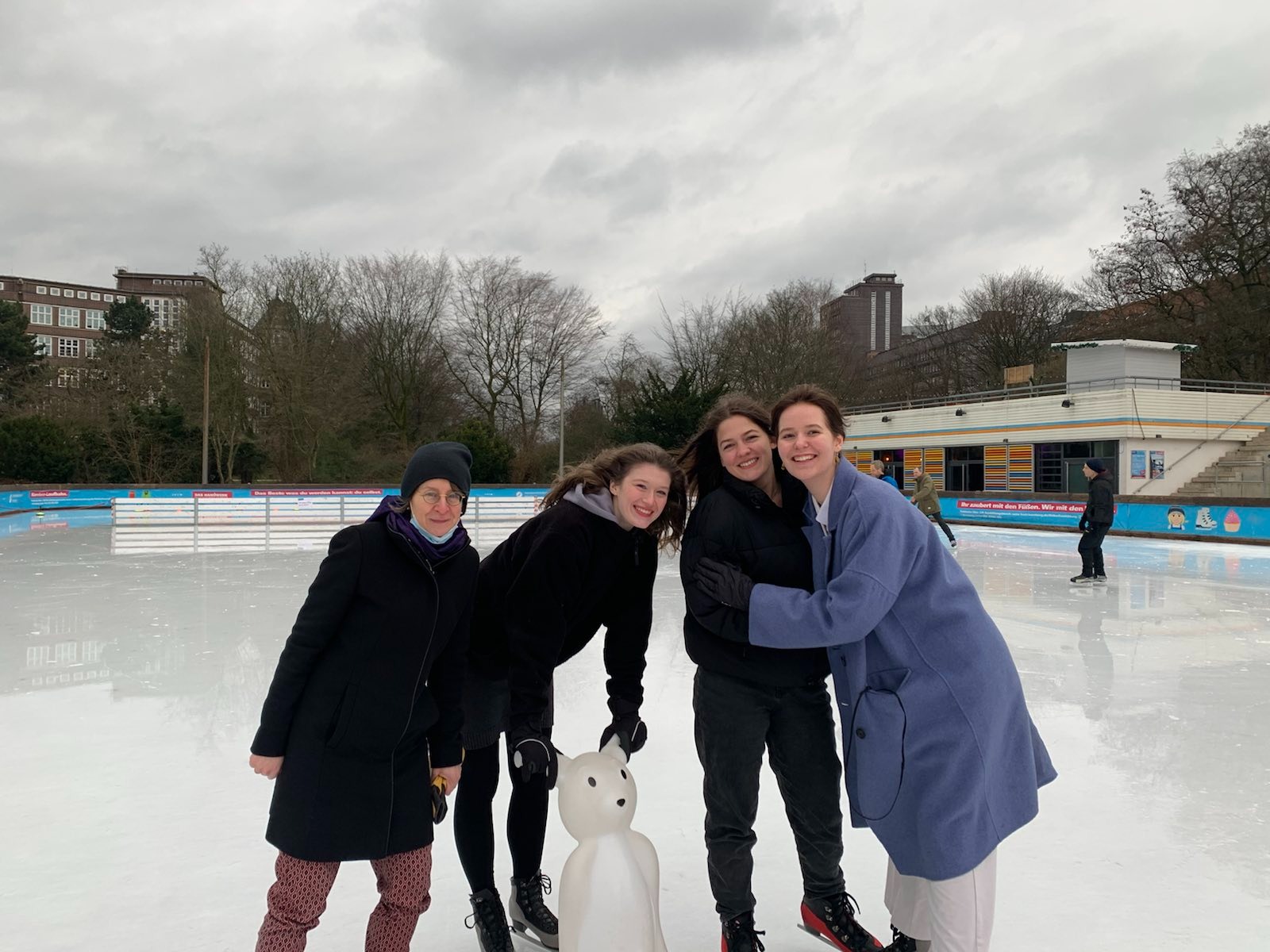 Als wir dort ankamen, gingen wir erstmal in Richtung „Alter Elbtunnel“ und liefen einmal auf die andere Seite der Elbe.Danach teilte sich die Klasse auf, die einen gingen in die Stadt, um Hamburg zu erkunden, die anderen zogen mit Frau Maetzel zum Schlittschuhlaufen auf die Eisbahn. Für die meisten von uns war das letzte Mal Eislaufen schon eine halbe Ewigkeit her, darum ging es am Anfang eher stockend voran. Doch mit der Hilfe von Eisbären und etwas Zeit glitten wir gegen Ende alle mit Grazie und Stil über die Eisfläche.