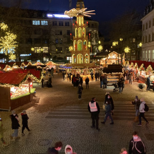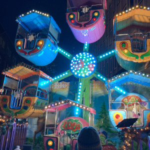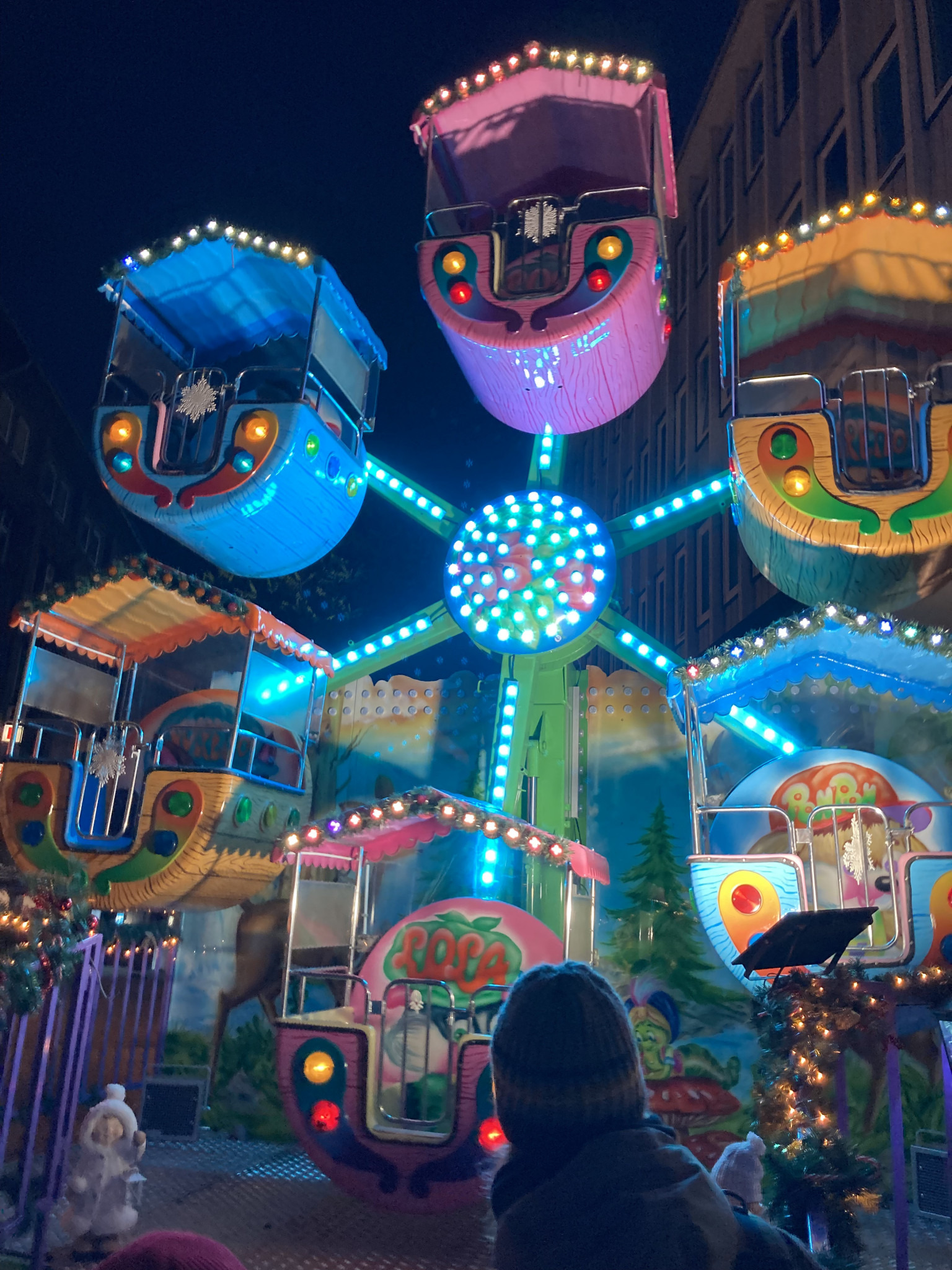 Was darf auf einem guten Weihnachtsmarkt auf gar keinen Fall fehlen? Natürlich, ein Riesenrad! Oder eher Minirad? Mitten in der Innenstadt stand ein kleines, grell blinkendes „Riesenrad“, welches geradezu danach schrie, von jemanden gefahren zu werden. Eine ganze Klasse passte natürlich nicht hinein, weshalb unsere Lehrer:innen herhalten mussten. Die Tickets wurden von uns Schüler:innen bezahlt, und mit einem breiten Grinsen drückten wir die Karten in die Hände von Frau Schiller und Herrn Jacob. Mit unglaublicher Begeisterung stellten sich beide in die Reihe und warteten bis es endlich losging. Als sie in den Gondeln drin saßen, mussten wir uns ein Lächeln verkneifen, da diese Situation doch ungewohnt war.