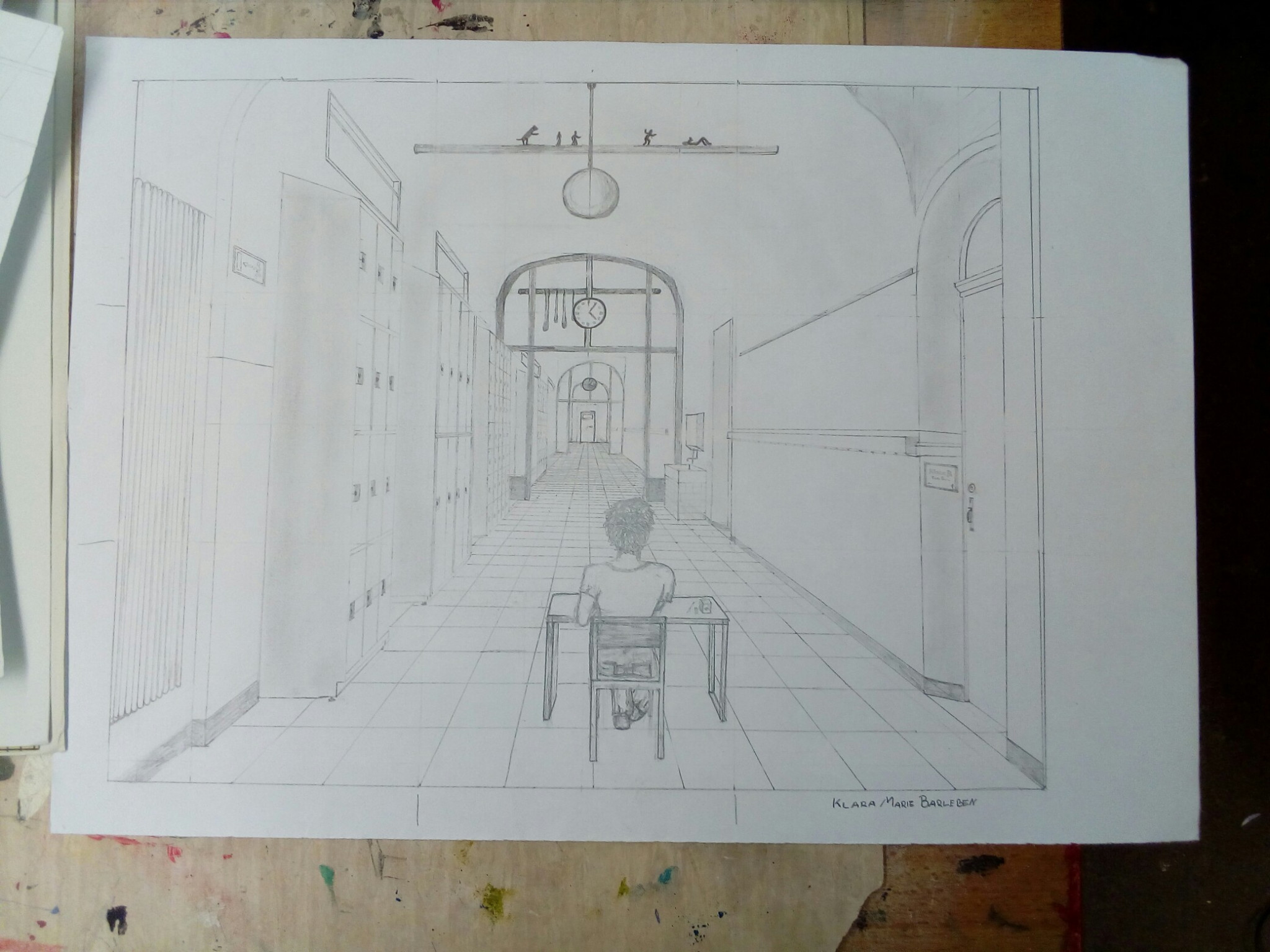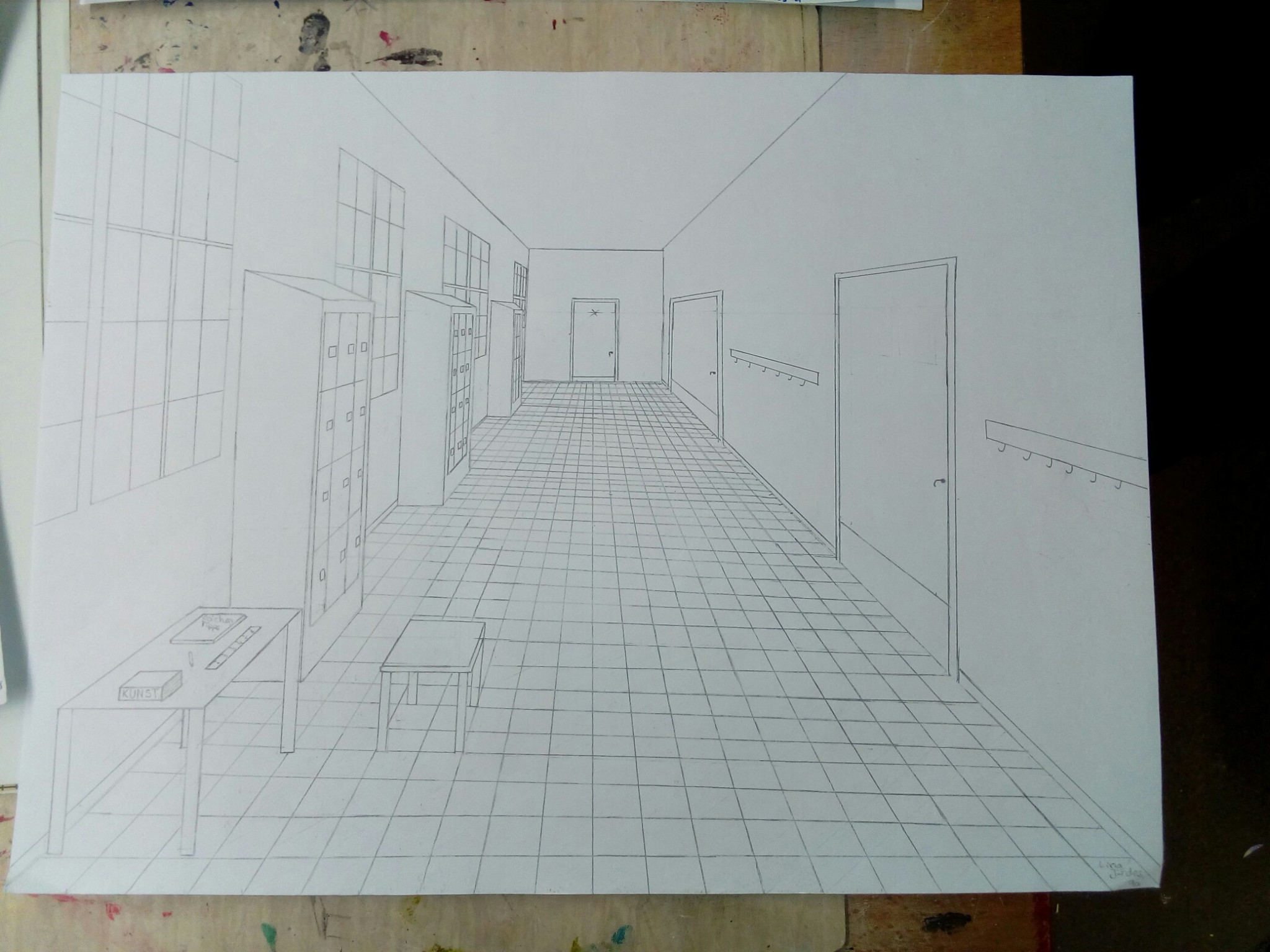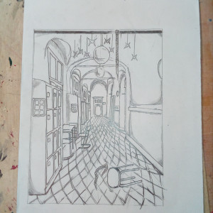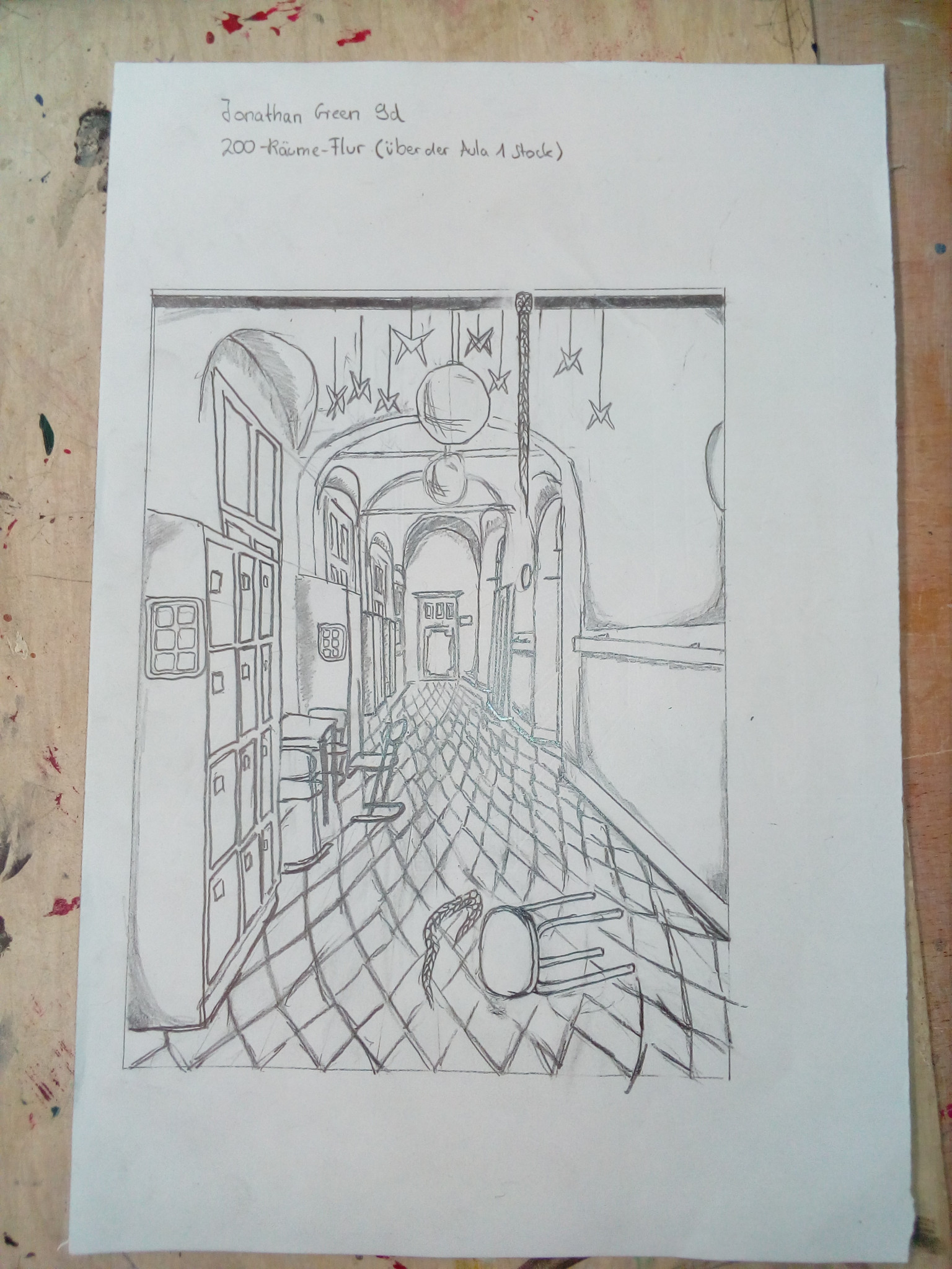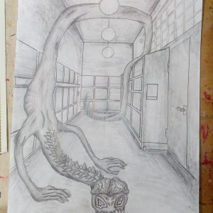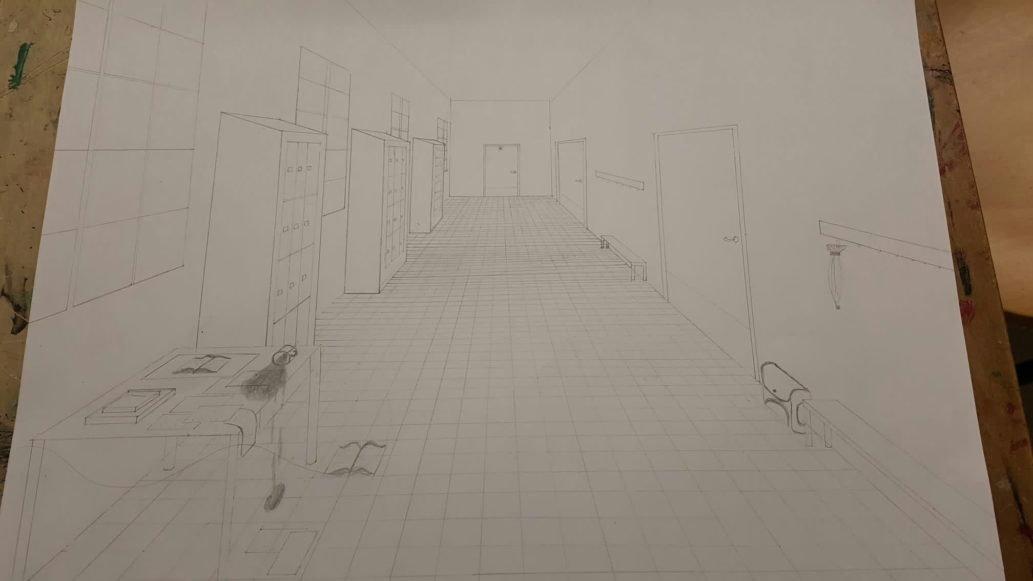 Aus der richtigen Perspektive hat der Wahlpflichtkurs Kunst der neunten Klassen die Schulflure zum Leben erweckt. Vom Fluchtpunkt aus hierher, diese Linie dorthin. Anfangs war es gar nicht so einfach, die Flure hier am Johanneum zu zeichnen, aber mit ein bisschen Übung haben wir es dann geschafft. Um etwas mehr Spannung in unsere Zeichnungen zu bekommen, haben wir uns unterschiedliche Motive ausgedacht, aber seht selbst. Vielleicht erkennt ihr ja einige der Orte und könnt hier fleißig mit raten!