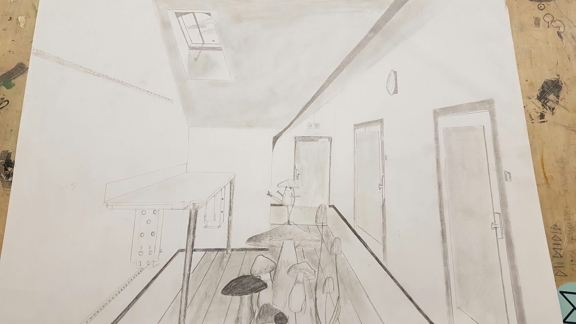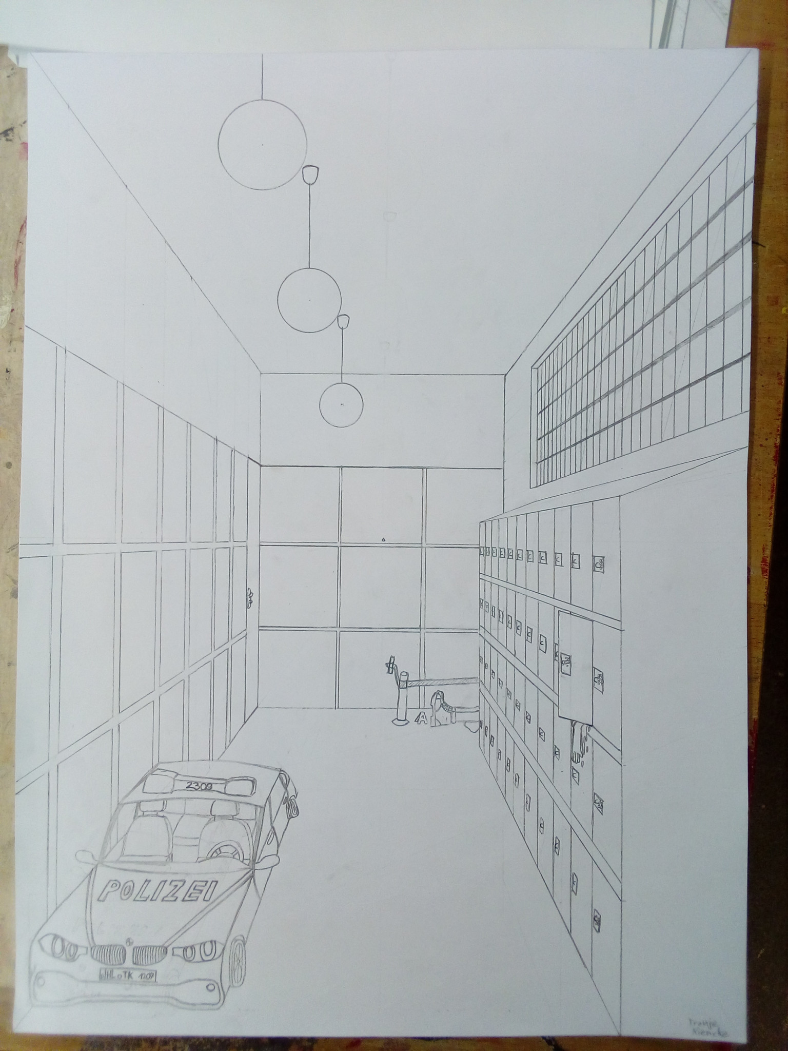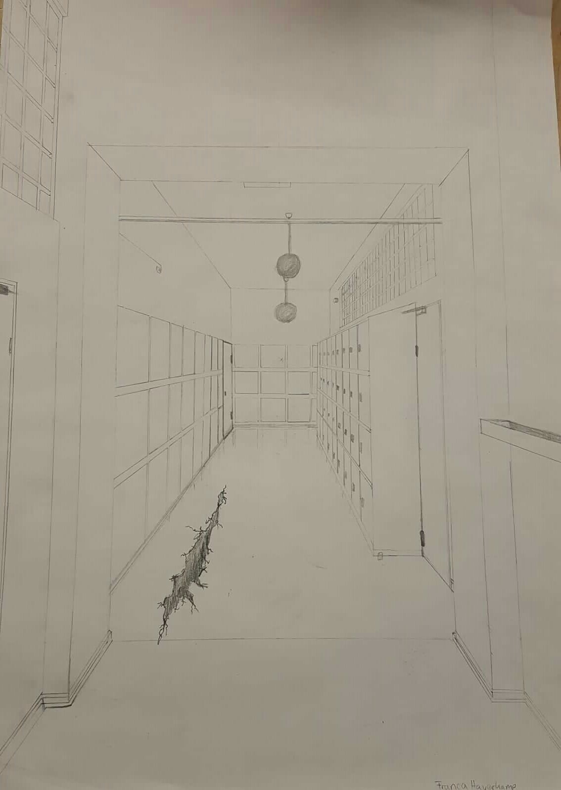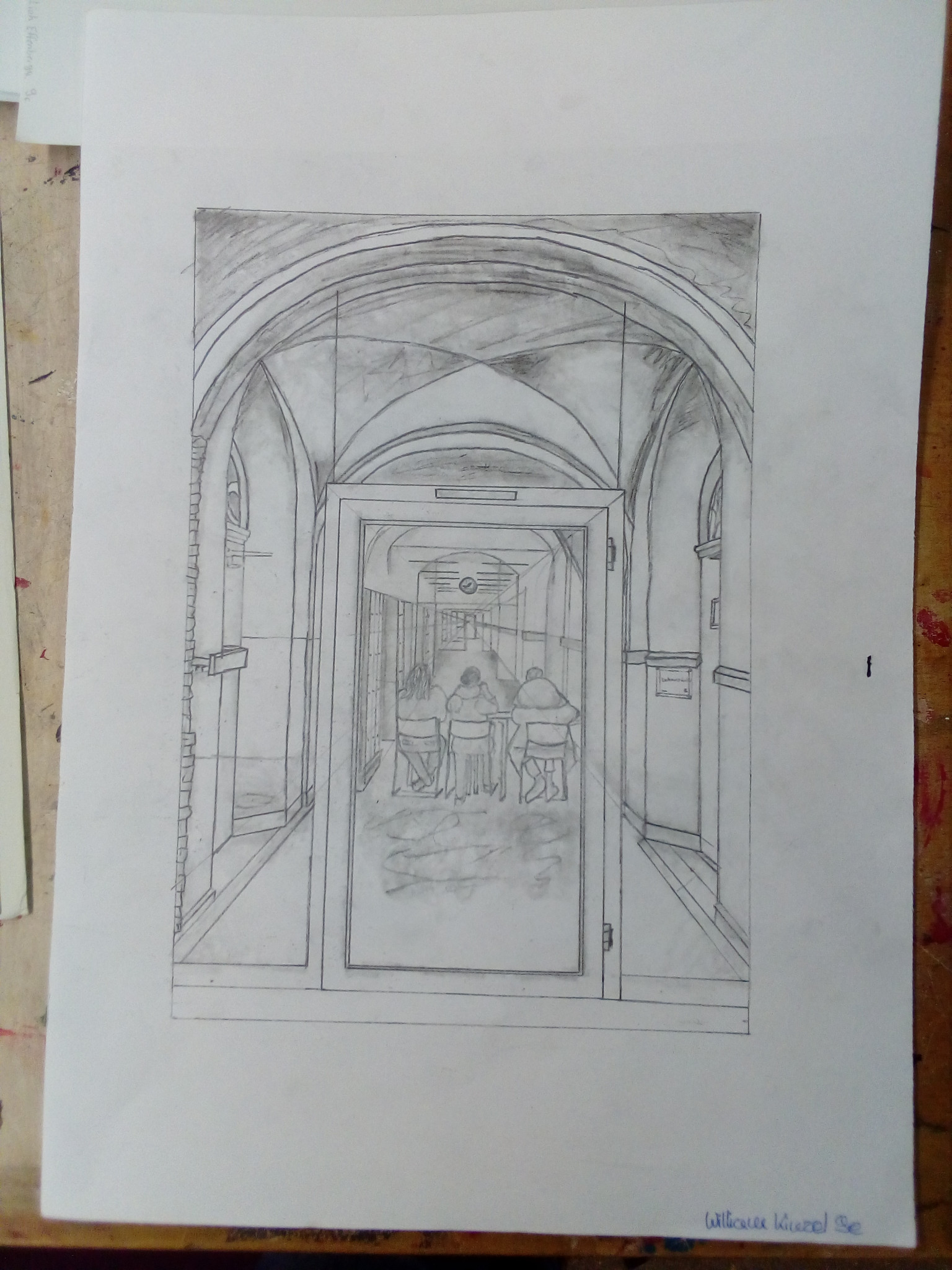 Aus der richtigen Perspektive hat der Wahlpflichtkurs Kunst der neunten Klassen die Schulflure zum Leben erweckt. Vom Fluchtpunkt aus hierher, diese Linie dorthin. Anfangs war es gar nicht so einfach, die Flure hier am Johanneum zu zeichnen, aber mit ein bisschen Übung haben wir es dann geschafft. Um etwas mehr Spannung in unsere Zeichnungen zu bekommen, haben wir uns unterschiedliche Motive ausgedacht, aber seht selbst. Vielleicht erkennt ihr ja einige der Orte und könnt hier fleißig mit raten!