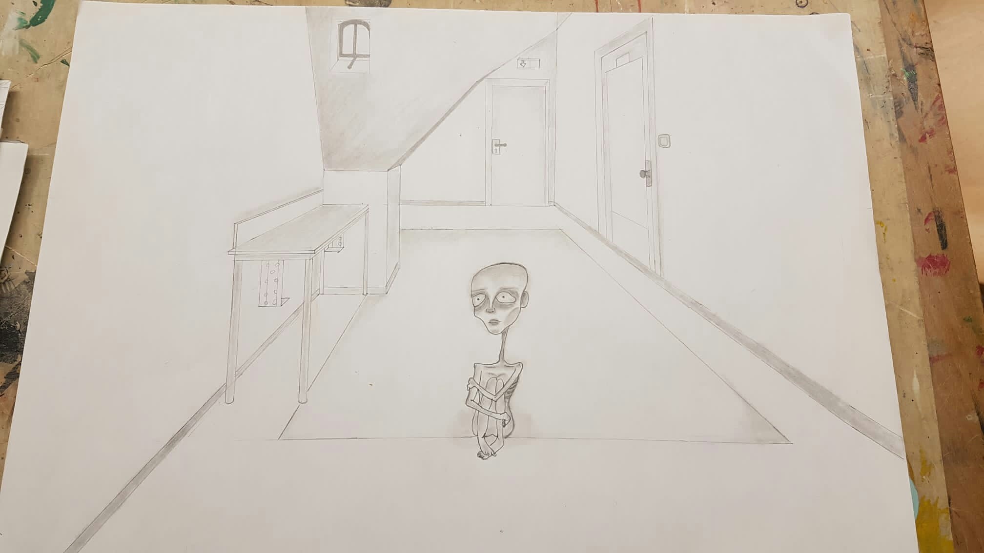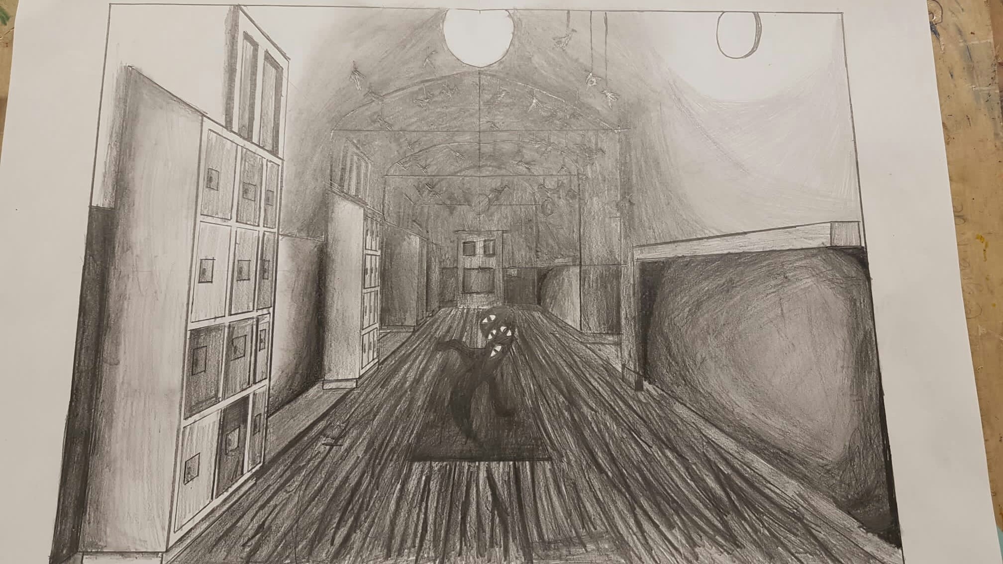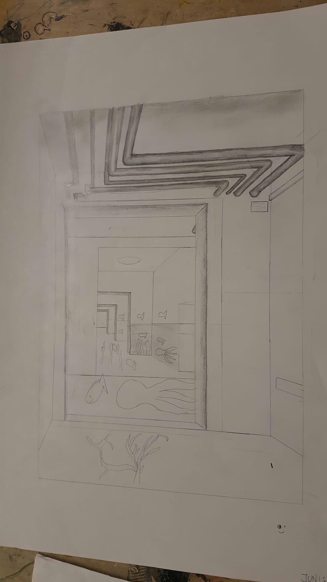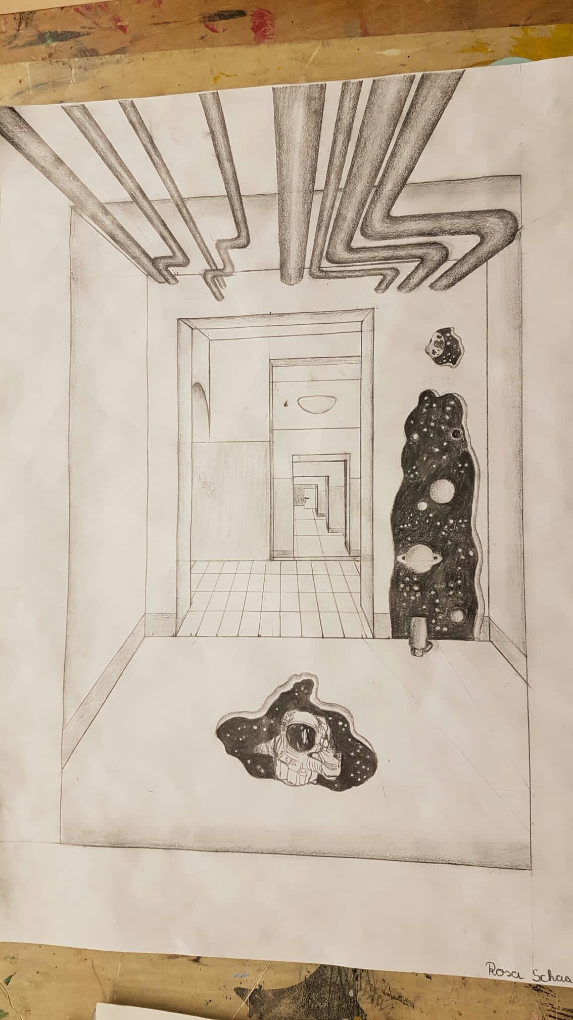 Aus der richtigen Perspektive hat der Wahlpflichtkurs Kunst der neunten Klassen die Schulflure zum Leben erweckt. Vom Fluchtpunkt aus hierher, diese Linie dorthin. Anfangs war es gar nicht so einfach, die Flure hier am Johanneum zu zeichnen, aber mit ein bisschen Übung haben wir es dann geschafft. Um etwas mehr Spannung in unsere Zeichnungen zu bekommen, haben wir uns unterschiedliche Motive ausgedacht, aber seht selbst. Vielleicht erkennt ihr ja einige der Orte und könnt hier fleißig mit raten!