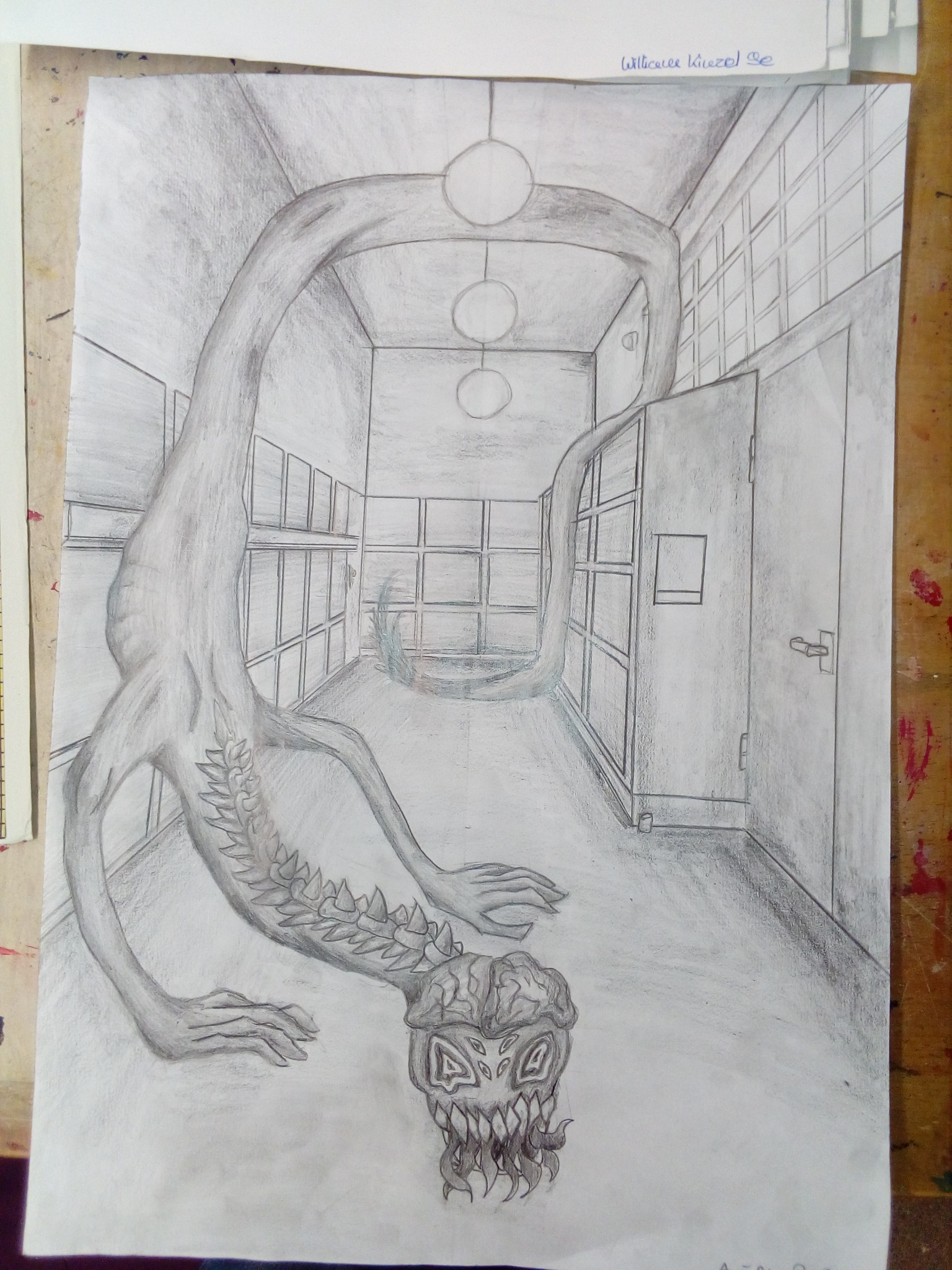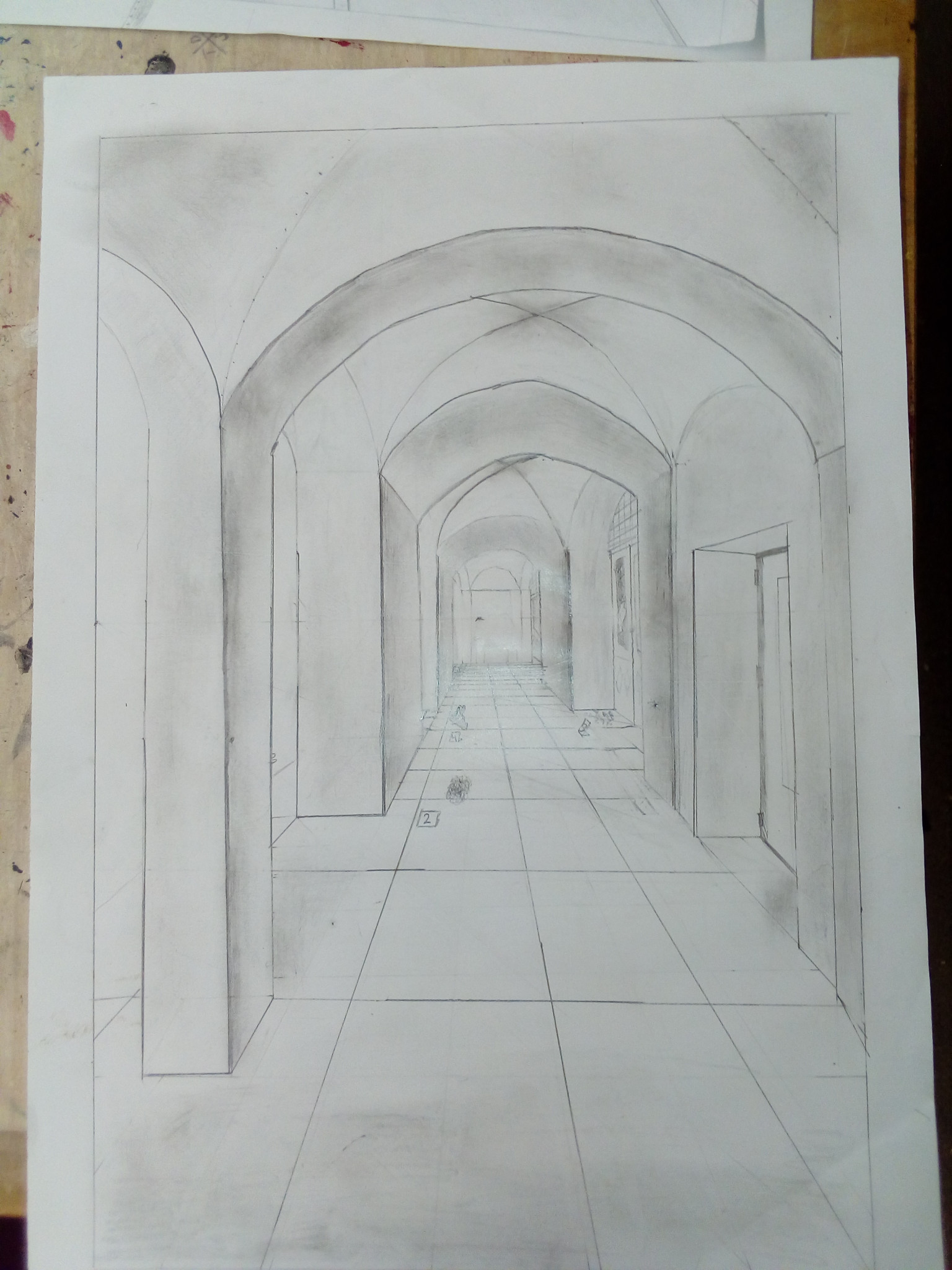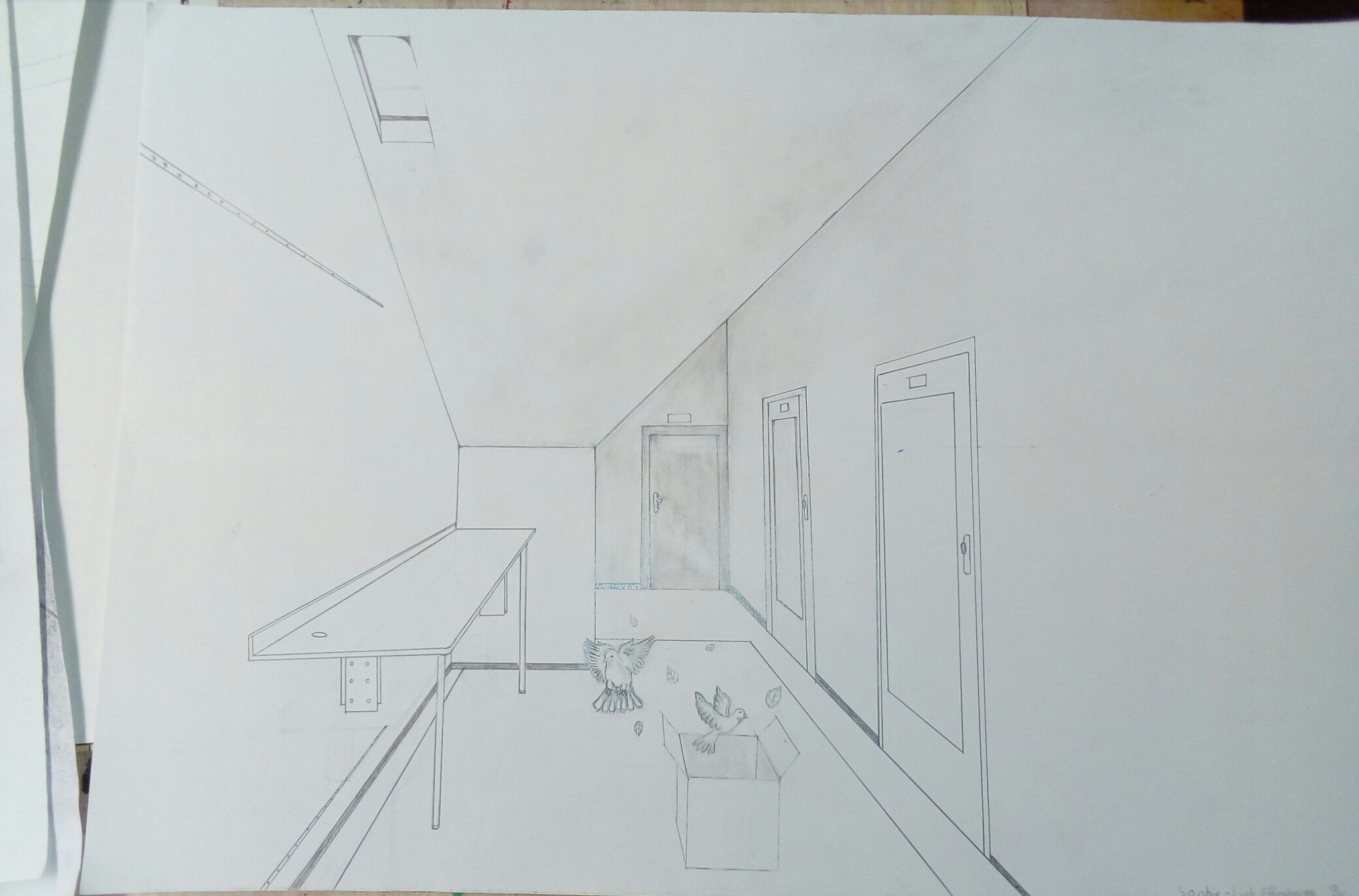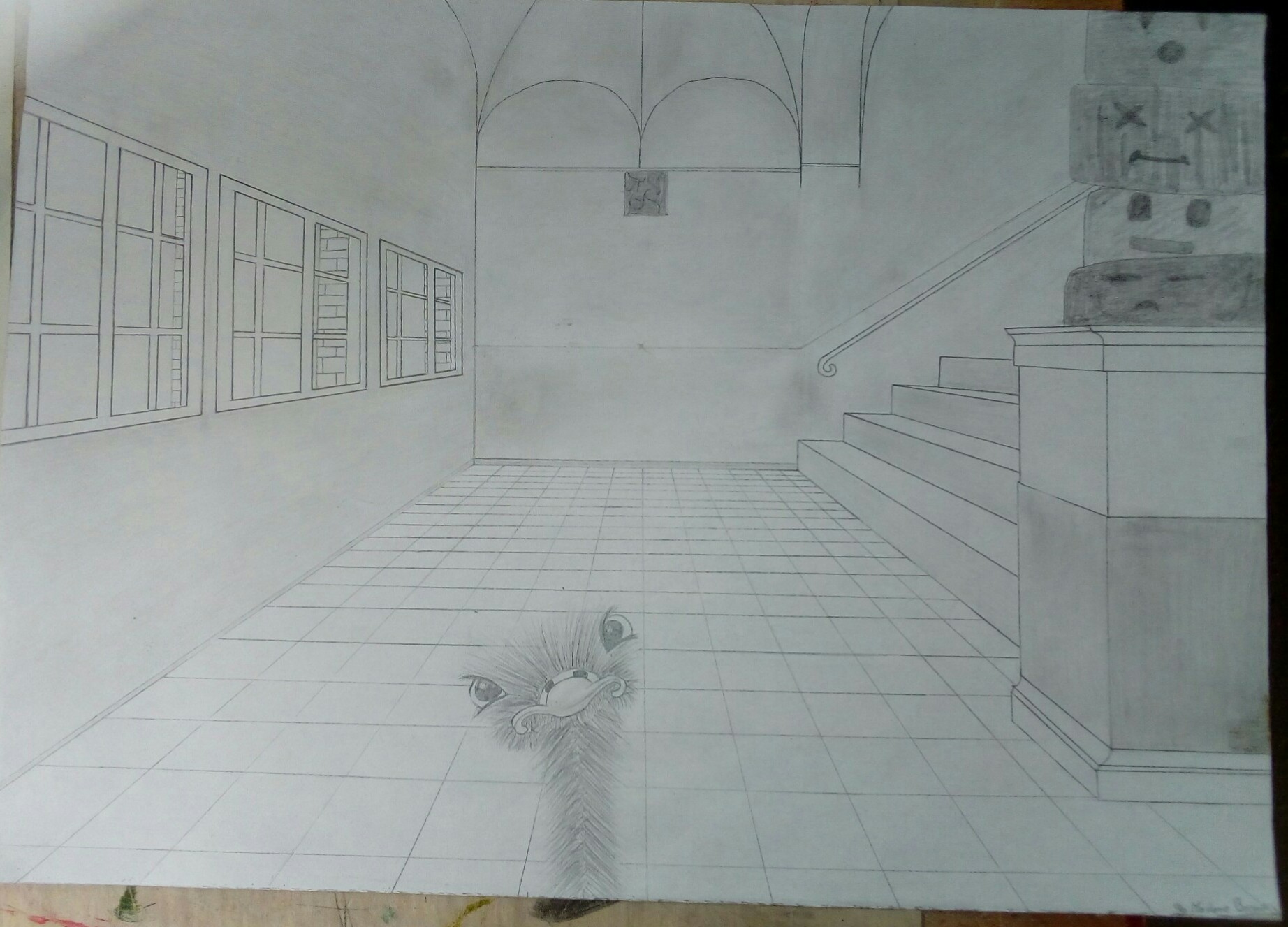 Aus der richtigen Perspektive hat der Wahlpflichtkurs Kunst der neunten Klassen die Schulflure zum Leben erweckt. Vom Fluchtpunkt aus hierher, diese Linie dorthin. Anfangs war es gar nicht so einfach, die Flure hier am Johanneum zu zeichnen, aber mit ein bisschen Übung haben wir es dann geschafft. Um etwas mehr Spannung in unsere Zeichnungen zu bekommen, haben wir uns unterschiedliche Motive ausgedacht, aber seht selbst. Vielleicht erkennt ihr ja einige der Orte und könnt hier fleißig mit raten!