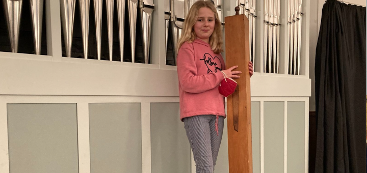 Sofie aus der 6b! Herzlichen Glückwunsch! Aus insgesamt sechs Einsendungen mit den richtigen Antworten zum Orgelquiz („Orgel erklärt 12“) wurde Sofie ausgelost. Nun gehört ihr eine der Holzpfeifen aus der alten Johanneumsorgel.