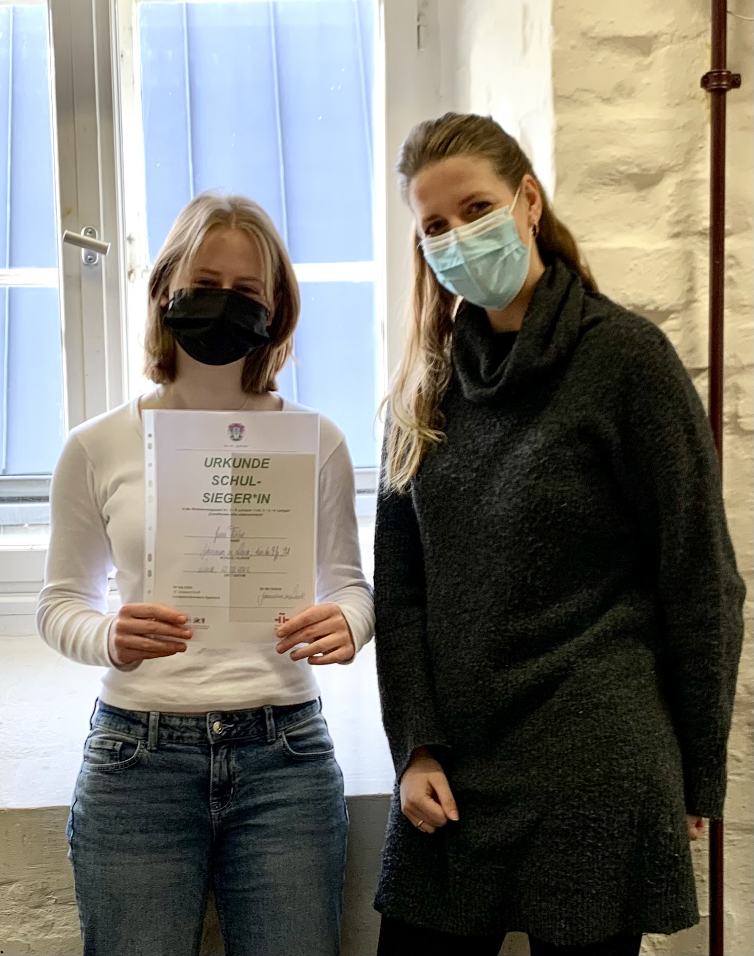 Unsere beiden Schulsiegerinnen, welche bereits jeweils Gutscheine der Bücherpiraten für ihren Schulsieg erhielten, werden am 17. März 2022 gemeinsam mit Frau Felten und Frau David zum Landesfinale nach Hamburg fahren. – In diesem Sinne: „Gano, gano – ¡que ganéis!“