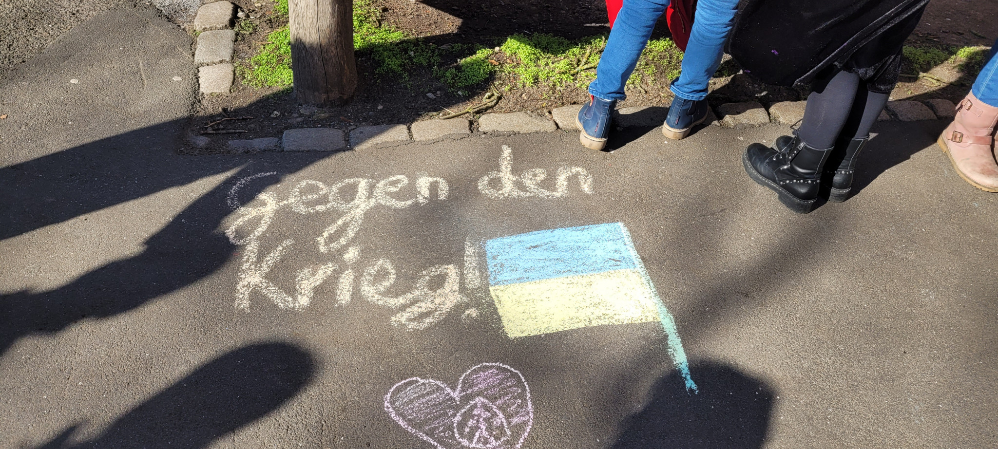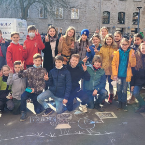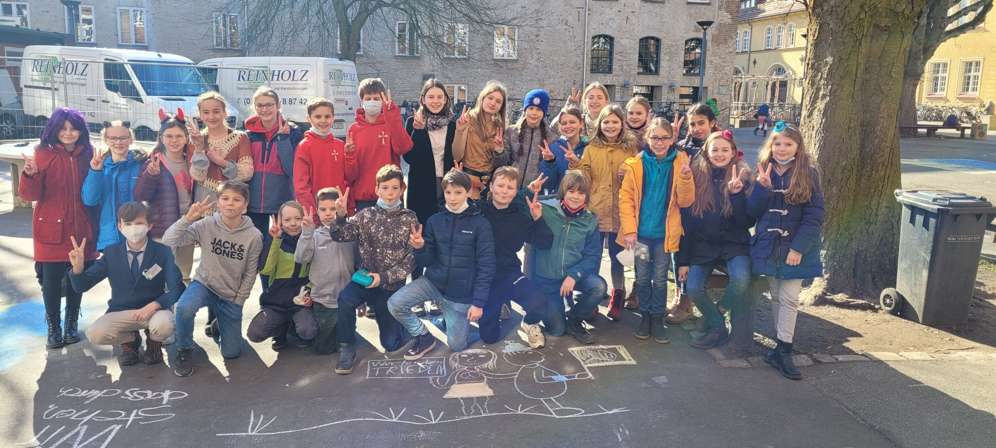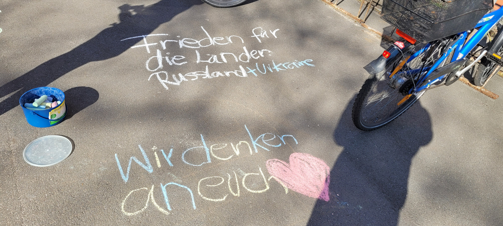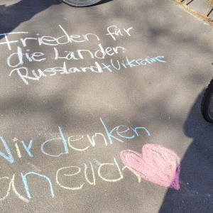 Am 28. Februar war Rosenmontag und unsere Klasse, die 5d, hatte beschlossen ein bisschen Fasching zu feiern. In der letzten Stunde haben wir deshalb mit Süßigkeiten geschmissen und viel gelacht, ein paar von uns waren sogar verkleidet. Aber natürlich haben wir auch an die Menschen in der Ukraine gedacht, die momentan ja leider nicht so froh und munter feiern können wie wir. Für sie haben wir zunächst eine Schweigeminute eingelegt und dabei an die Opfer des Krieges gedacht. Als Zeichen unserer Unterstützung haben wir anschließend mit Kreide auf den Schulhof Sprüche wie z.B. „Wir für den Frieden“ geschrieben und ukrainische Flaggen oder auch Herzen und Peace-Zeichen gemalt. Vielleicht habt ihr das ja gesehen?