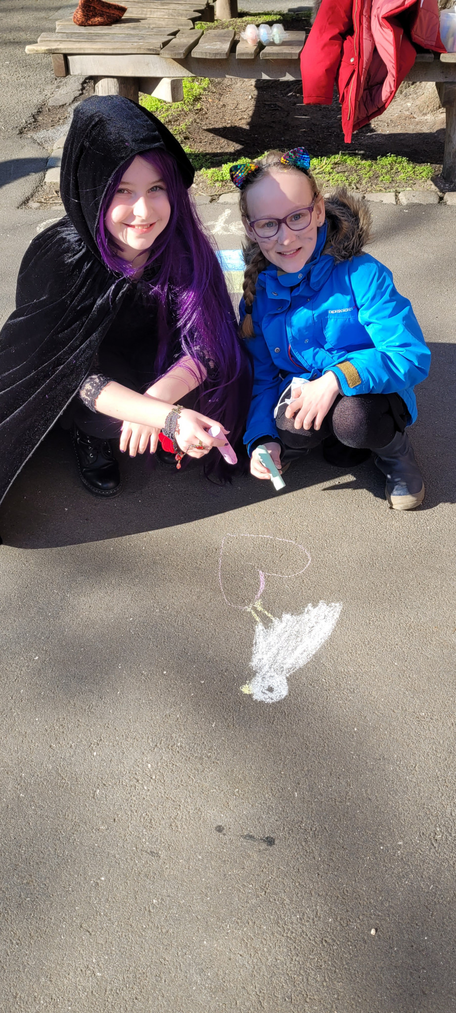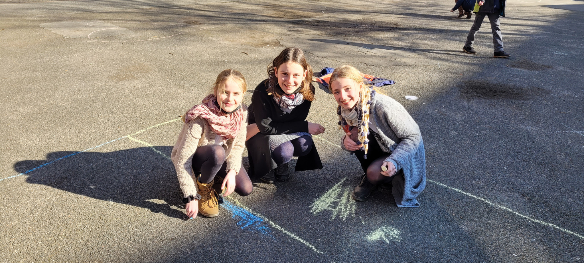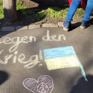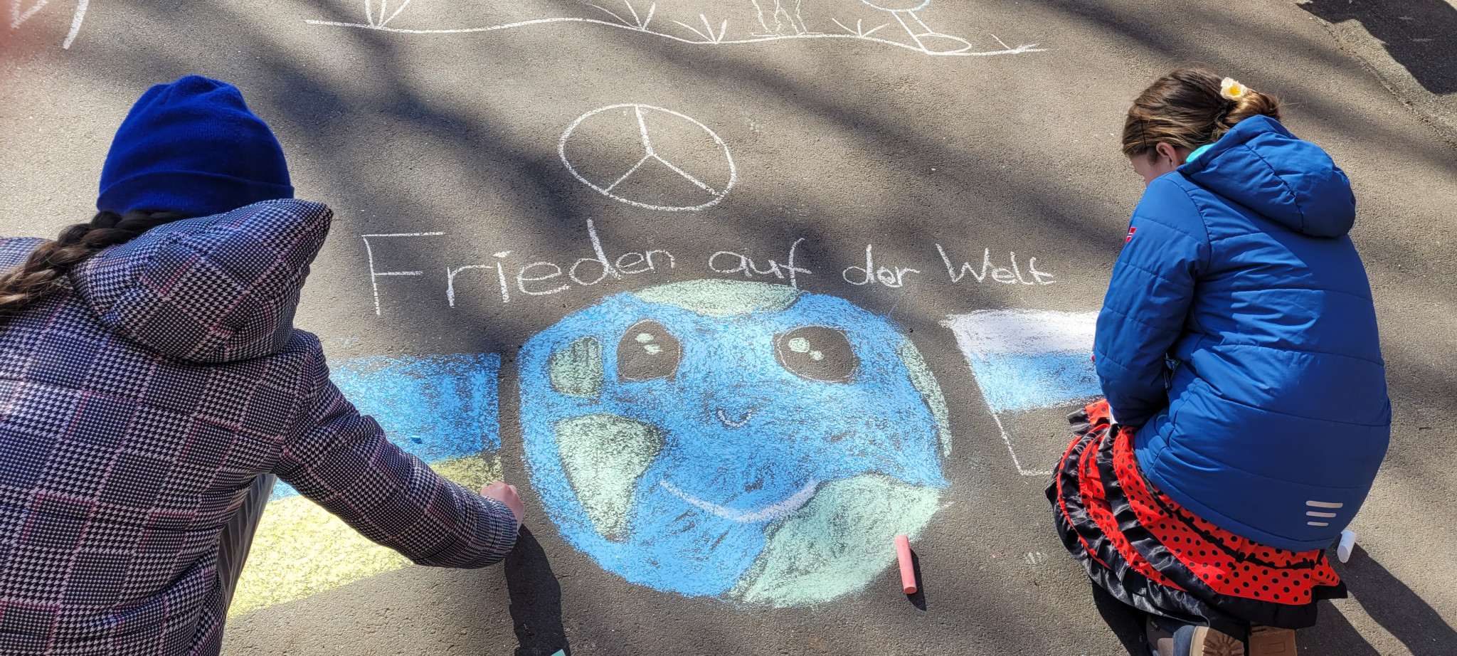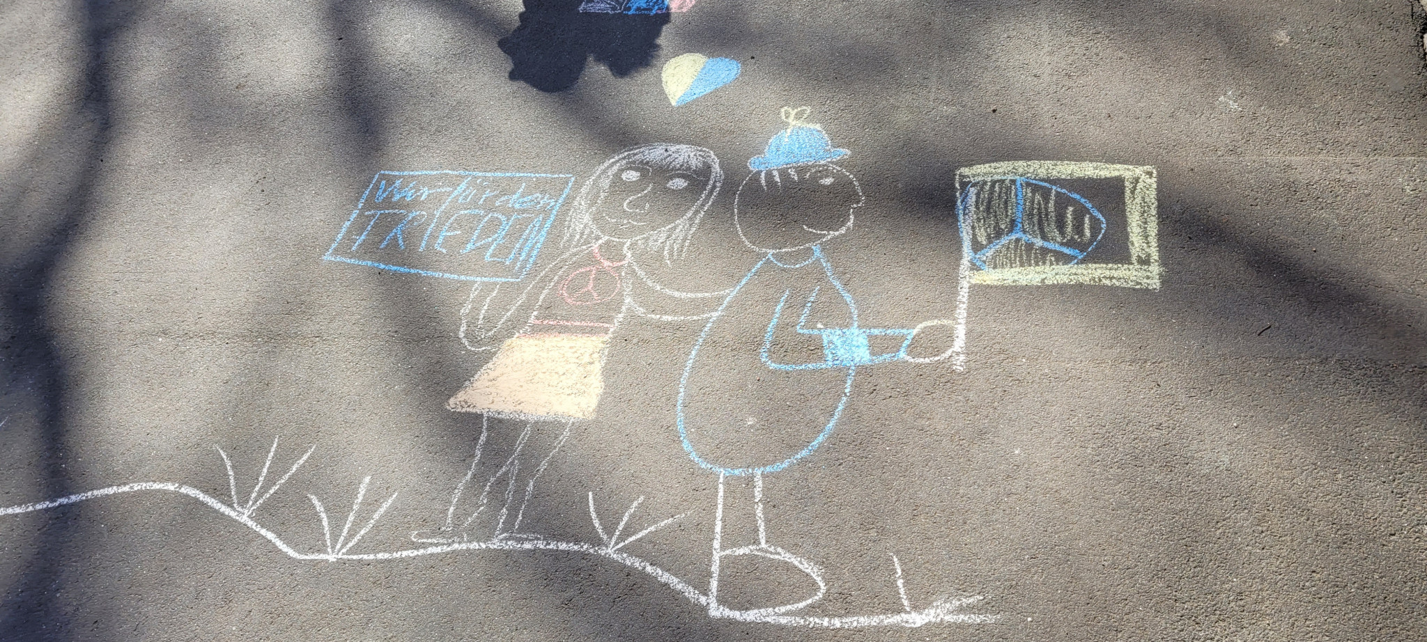 Am 28. Februar war Rosenmontag und unsere Klasse, die 5d, hatte beschlossen ein bisschen Fasching zu feiern. In der letzten Stunde haben wir deshalb mit Süßigkeiten geschmissen und viel gelacht, ein paar von uns waren sogar verkleidet. Aber natürlich haben wir auch an die Menschen in der Ukraine gedacht, die momentan ja leider nicht so froh und munter feiern können wie wir. Für sie haben wir zunächst eine Schweigeminute eingelegt und dabei an die Opfer des Krieges gedacht. Als Zeichen unserer Unterstützung haben wir anschließend mit Kreide auf den Schulhof Sprüche wie z.B. „Wir für den Frieden“ geschrieben und ukrainische Flaggen oder auch Herzen und Peace-Zeichen gemalt. Vielleicht habt ihr das ja gesehen?
