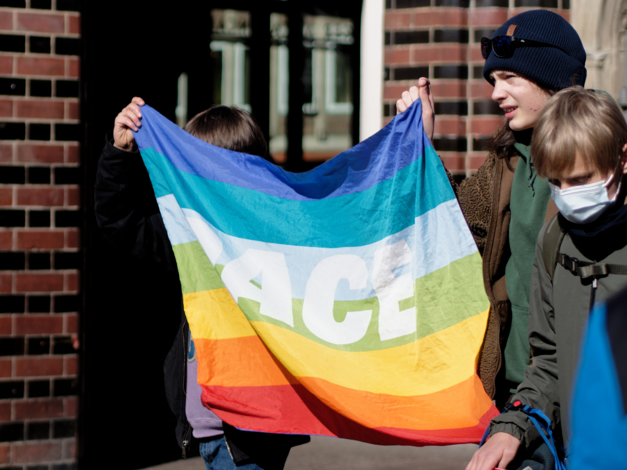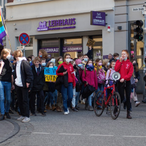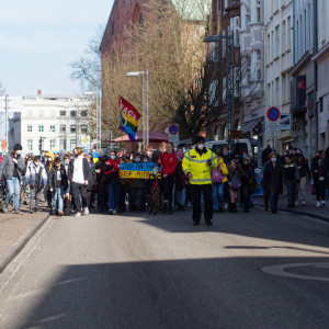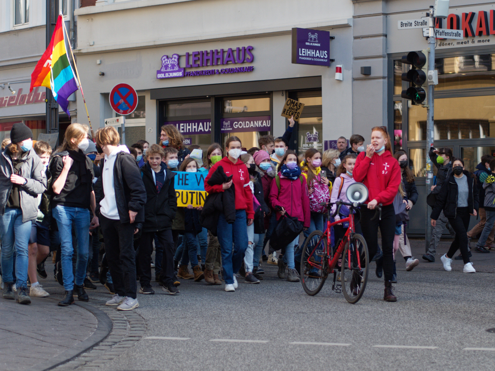 Am Donnerstag, den 10. März, haben wir Lübecker Schulen uns um 12.00 am Klingenberg getroffen um für den Frieden in der Ukraine zu demonstrieren. Dabei waren ganze 2500 Schüler:innen, mit denen wir durch unsere Innenstadt bis zum Holstentor gelaufen sind. Wir haben gemeinsam Sprüche wie „Hoch die internationale Solidarität“ und „Frieden schaffen ohne Waffen“ gerufen. Wir haben Kundgebungen gehört und zusammen auf ein schnelles Ende des Krieges gehofft.