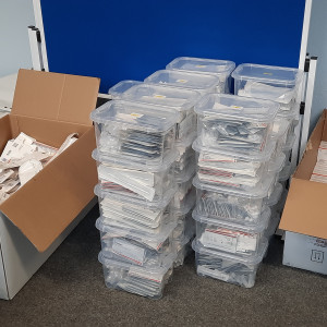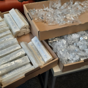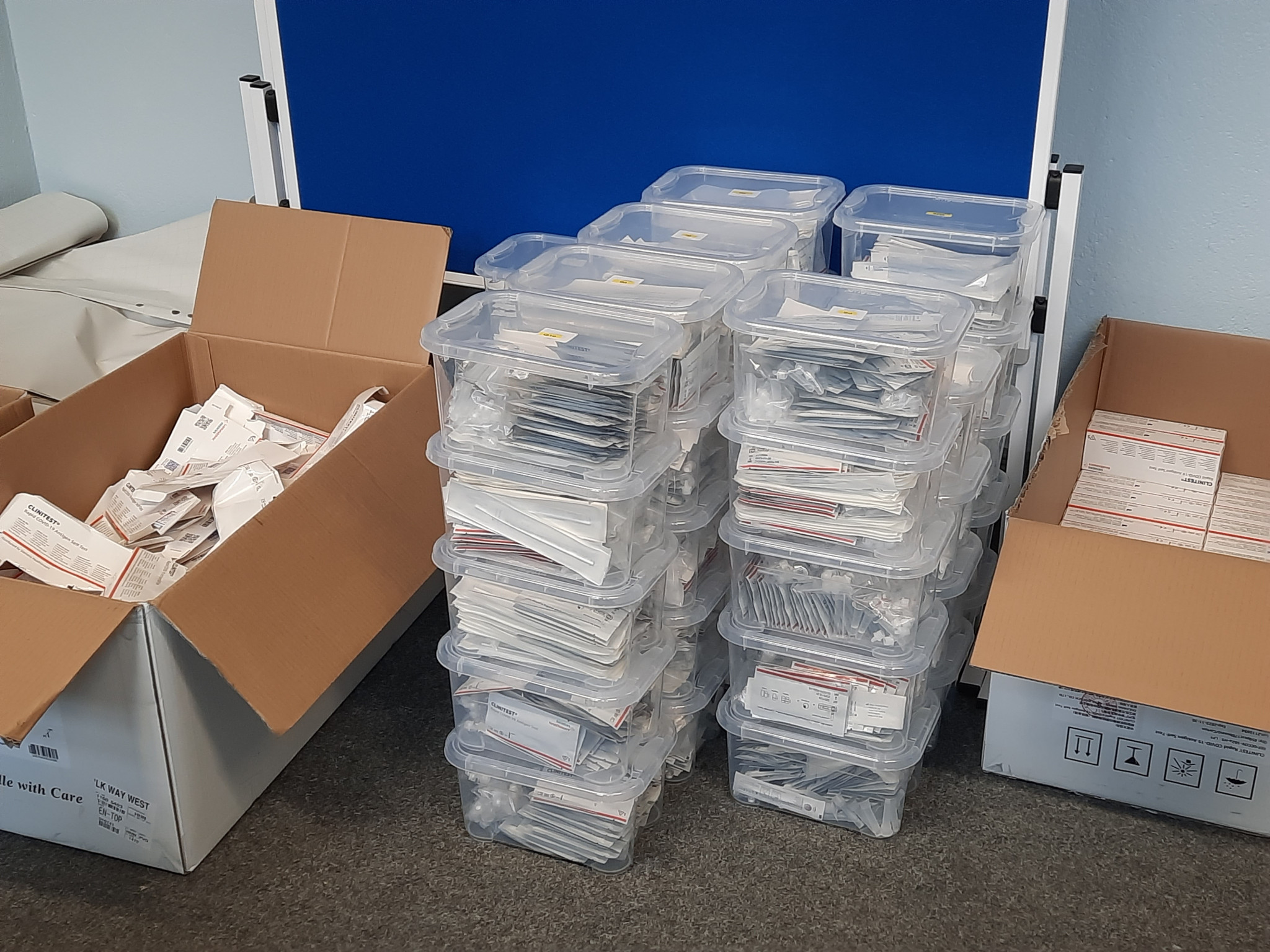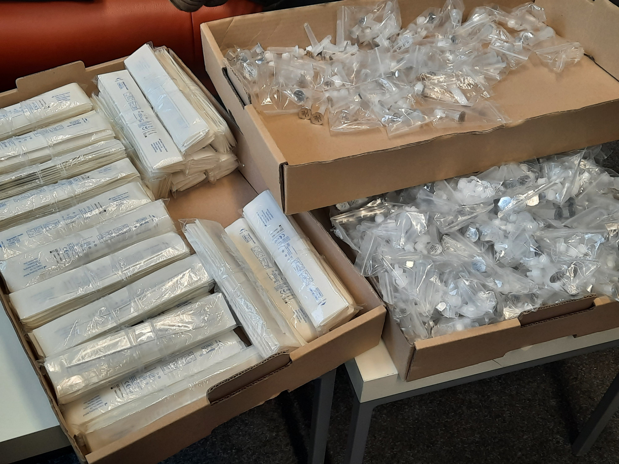 Und genau an dieser Stelle kommt Herr Krimpenfort ins Spiel. Vielleicht haben ihn einige von euch schon mal gesehen, denn er ist bei uns der Mann für alle Fälle. Seine Hauptaufgabe war es jetzt mehrere Wochen lang, Tests zu zählen und in Kisten zu packen, um Frau Strauß und Frau Niebuhr zu entlasten, die das monatelang getan hatten. Daneben hat er Vertretungsstunden gegeben.