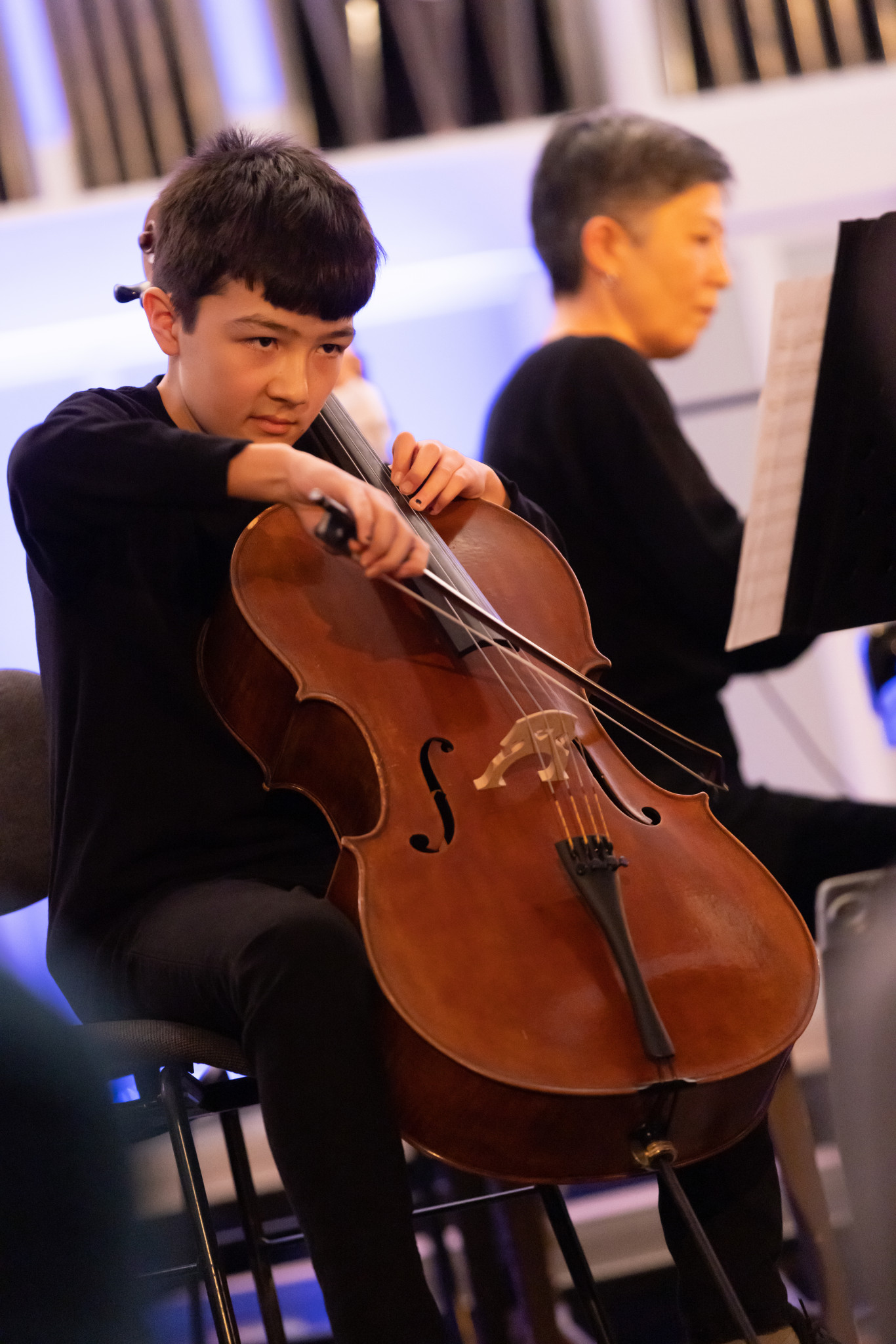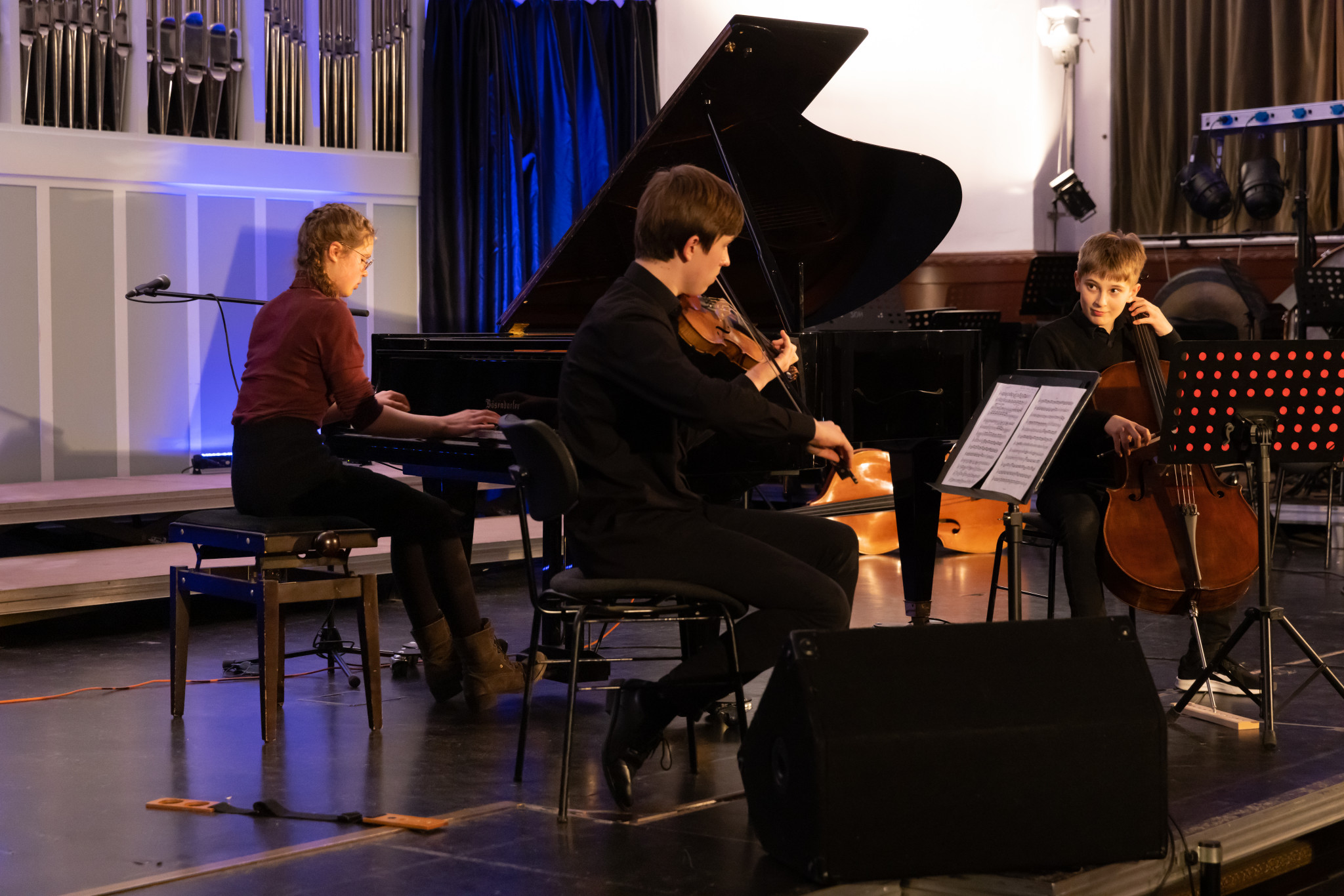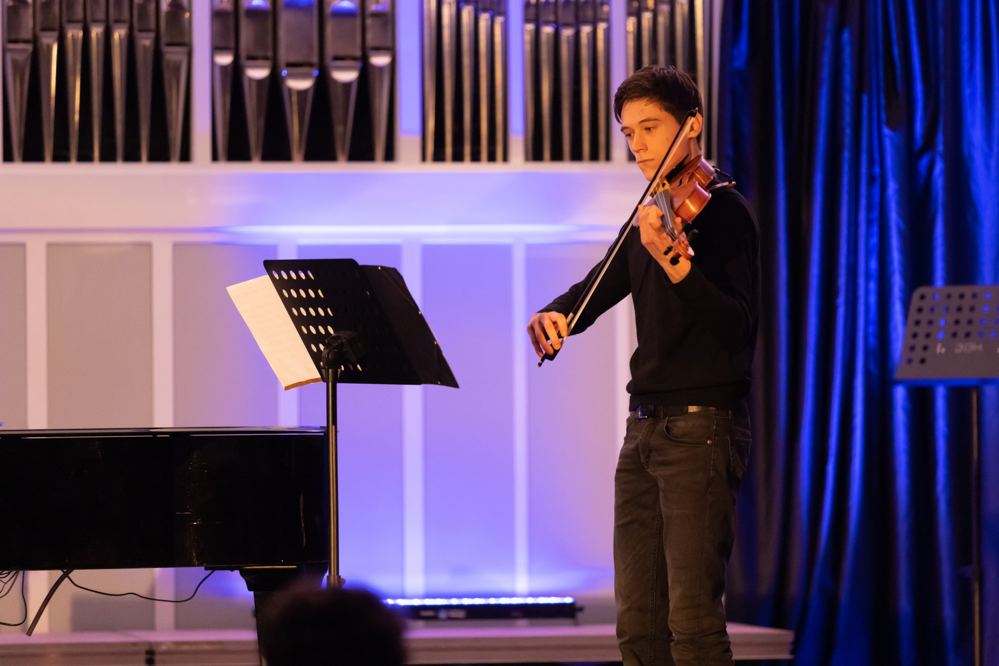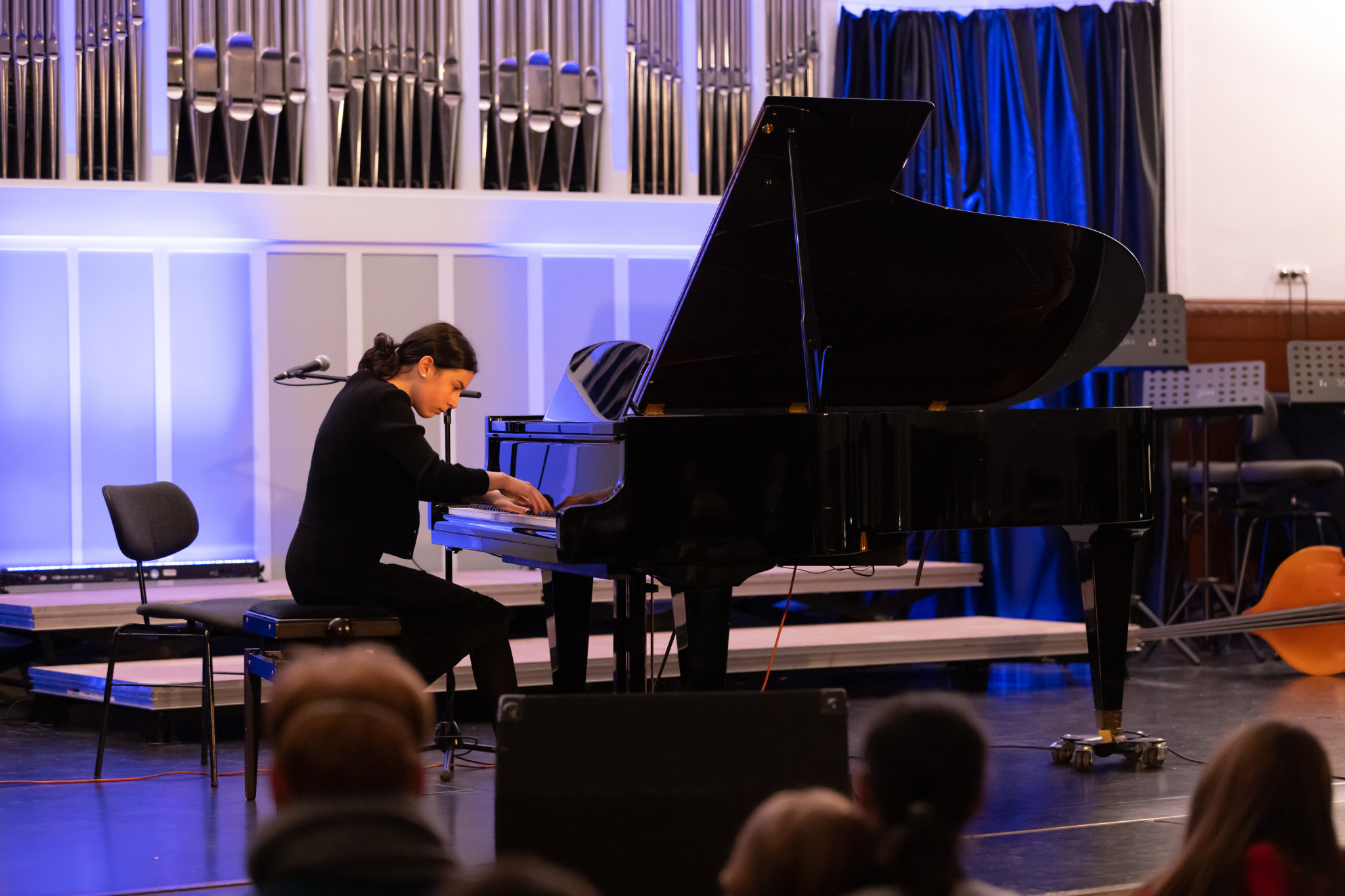 Langsam betreten die ersten Leute das Gebäude und bleiben gespannt vor der Aula stehen. Laute Stimmen reden, verschiedene Instrumente spielen und die Vorfreude auf den „Musikalischen Abend der Schüler“ ist groß. Nun ist es so weit, und die Aulatüren öffnen sich. Die Leute nehmen ihre Plätze ein und mitten drin sitzen die Musiker:innen mit ihren Instrumenten. Max Henkel aus der 9d, der zusammen mit seinen Mitschüler:innen aus dem Wahlpflichtkurs Musik den Abend organisiert hat, kommt auf die Bühne und erzählt uns, was uns an diesem Abend erwarten wird. Dann werden alle leise.
