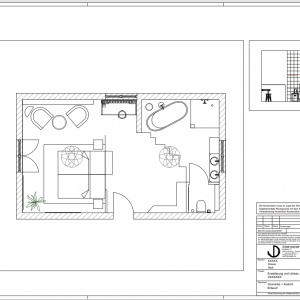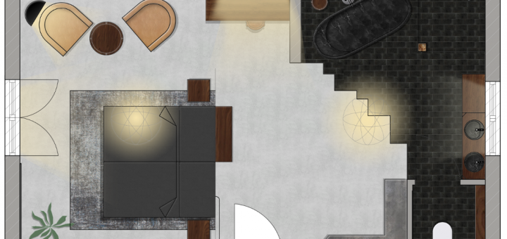 Am Hauptbahnhof angekommen, geht es erst einmal mit Sack und Pack die Treppen hoch, am Blumenstand vorbei und wieder Stufen hinunter, einmal rechts, bis es nicht mehr weiter geht und erneut hinunter, sodass ich schließlich wieder am Bahnsteig stehe. Das Quietschen der Gleise hört man schon, bevor die U-Bahn mit Waggons voller Menschen an der Haltestelle eintrifft. Die Türen öffnen sich mit einem Zischen und es schieben sich Fahrgäste hinaus, bevor wir anderen nachrücken. Die Bahn fährt an und ruckelt mich weiter bis zu meiner Haltestation, an der ich aussteige und mich zu Fuß auf die letzten Meter mache. Im Büro angekommen, gehe ich sofort an meinen Platz im ersten Stock, nachdem ich Schal und Mantel losgeworden bin. Meine Tischnachbar:innen begrüßen mich freundlich und ich lasse mich in meinen Schreibtischstuhl fallen. Dann drücke ich auf die Powertaste meines Computers. Heute steht das kolorieren meines Grundrisses mit Powerpoint an. Die ersten Tage im Praktikum hatte ich mir ein Zimmer in dem ehemaligen Wohnhaus, in dem nun JOI-Design eingezogen ist, ausgesucht, das ich in ein Hotelzimmer umgestalten sollte. Das Innenarchitektur-Büro selbst ist vor allem auf die Hotellerie spezialisiert, weshalb ich auch für diesen Bereich gestalten würde. Zunächst per Hand und später mit AutoCAD, einem Computerprogramm für die Erstellung von Grundrissen, visualisierte ich meine Ideen, was Raumaufteilung und Möbelentscheidungen anbelangte. Dabei war es wichtig, sich für einen Stil zu entscheiden, der in meinem Fall „Industrial Design“ war. Hierfür stellte ich mithilfe von Pinterest eine Pinwand zusammen, um mir über konkrete Ideen klarer zu werden. Der Beruf des:der Innenarchitekt:in hat ebenfalls viel mit dem Erläutern der eigenen Ideen zu tun – ob vor dem:der Kund:in oder anderen Personen. Daher ging es anschließend für mich daran, eine Präsentation zu erstellen, in der ich den Standort meines fiktiven Hotels vorstellte – Berlin – und in Folge darauf einging, welche Besonderheiten dieser Umgebung sich inwiefern in meinem Design widerspiegeln sollten.