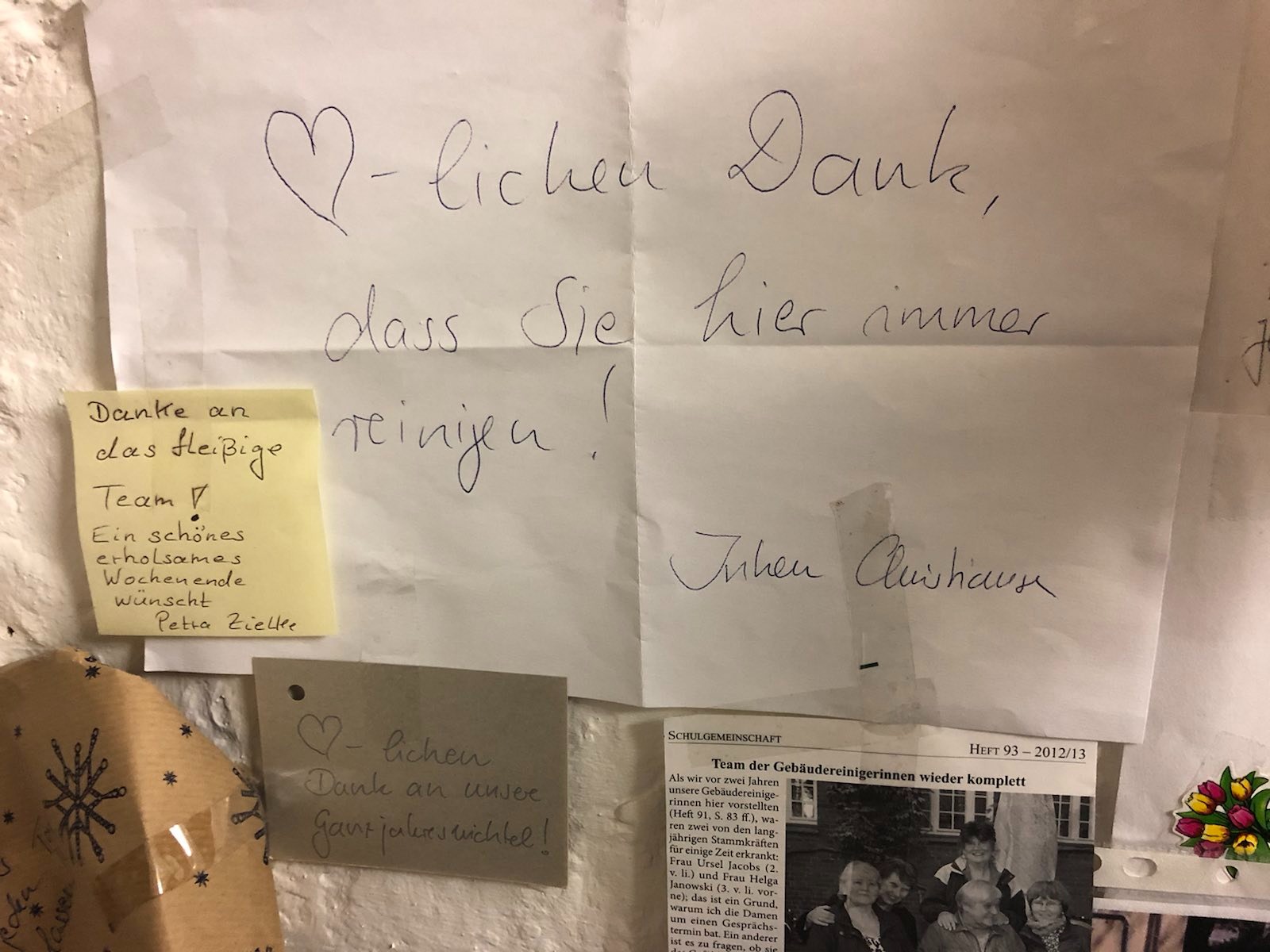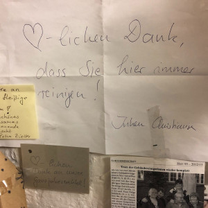 Habt ihr euch schonmal gefragt, was hinter der Tür unter der Treppe kurz vor dem Kellerflur ist? Die meisten von uns gehen daran einfach vorbei, ohne diese Tür wirklich wahrzunehmen. Was also die meisten von uns nicht wissen: Das ist der Raum der Reinigungskräfte an unserer Schule. Wie Frau Backhaus, eine der sieber Reinigungskräften, uns in einem Interview erzählte, ist dieser Raum bzw. die Schule für sie schon fast wie ein zweites Zuhause, das sie nun nach 25 Jahren verlässt.