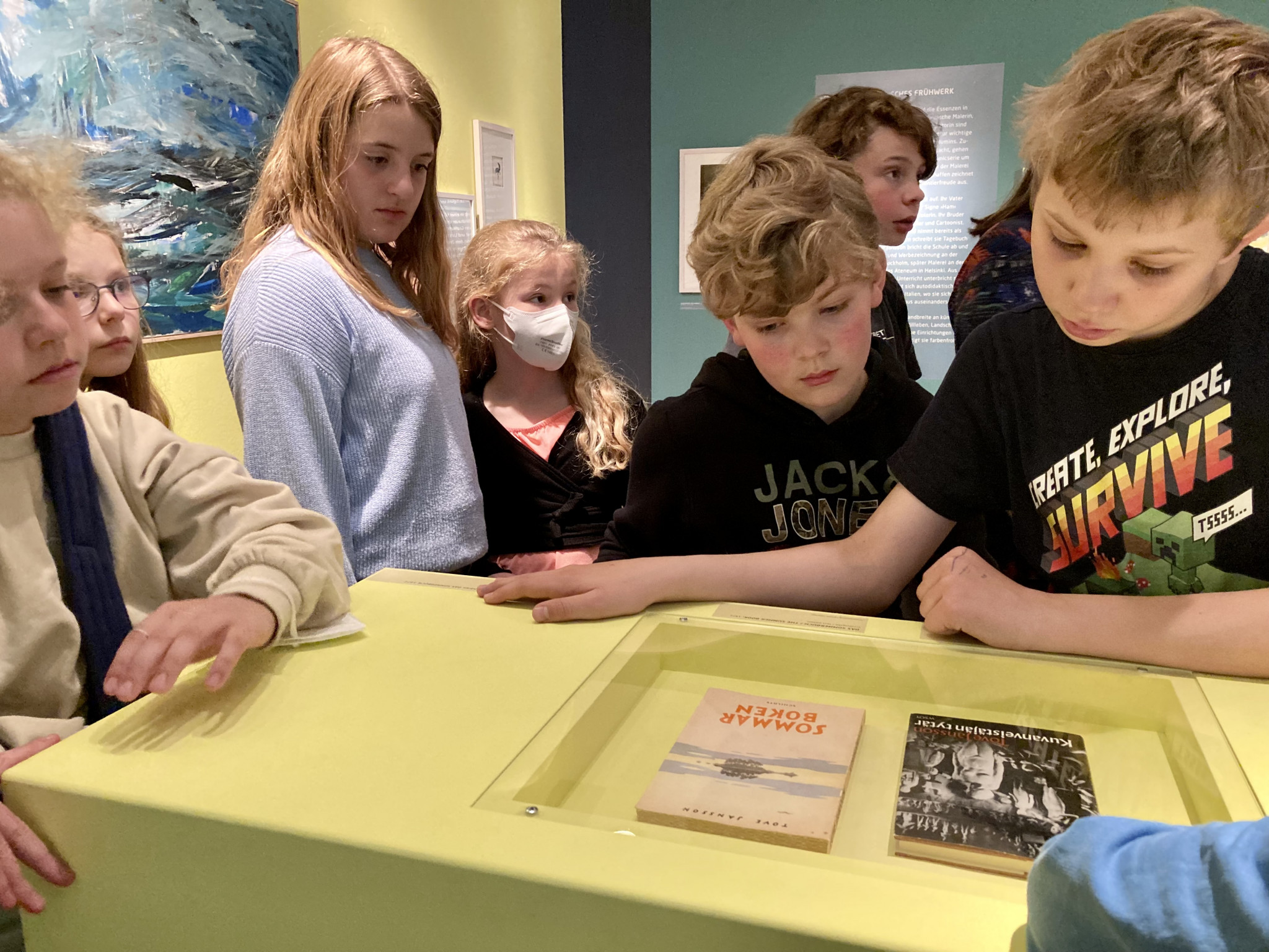 Warum ist Klein-Mü eigentlich so kratzbürstig? Und warum verbreitet die Morra, wo immer sie ist, eine schlechte Stimmung? Warum sitzt der Mumin-Papa so oft an seinem Schreibtisch? Und warum muss man einen so guten Freund, wie es der Schnupferich ist, auch wieder gehen lassen können? Die 5b hatte viele Fragen, als sie am vergangenen Freitag die Sonderausstellung „Die fantastische Welt der Tove Jansson“ des Günter-Grass-Hauses besuchte. Zum Glück konnten sie alle von der überaus engagierten Museumsführerin, Verena Holthaus, beantwortet werden.