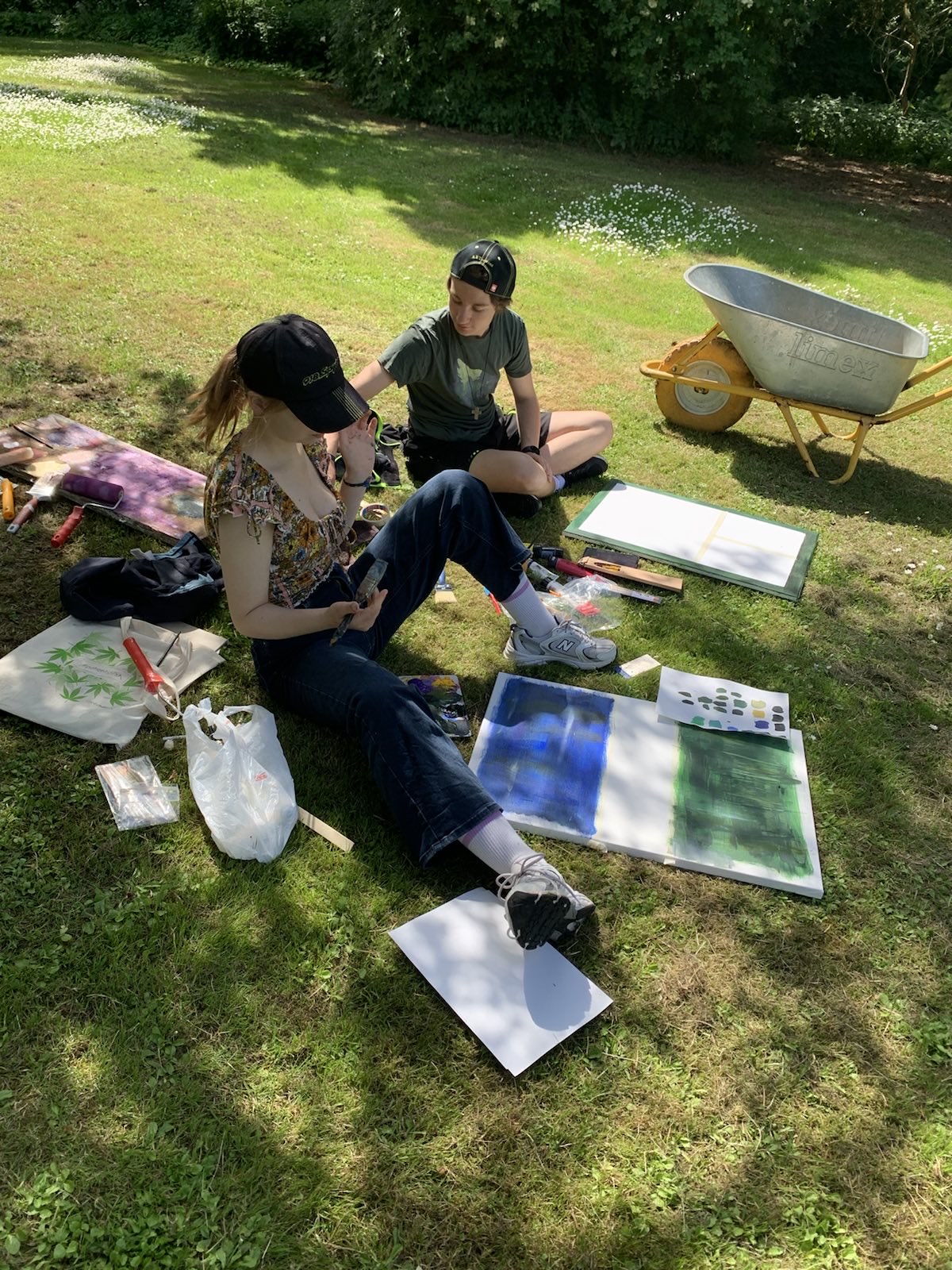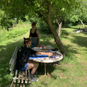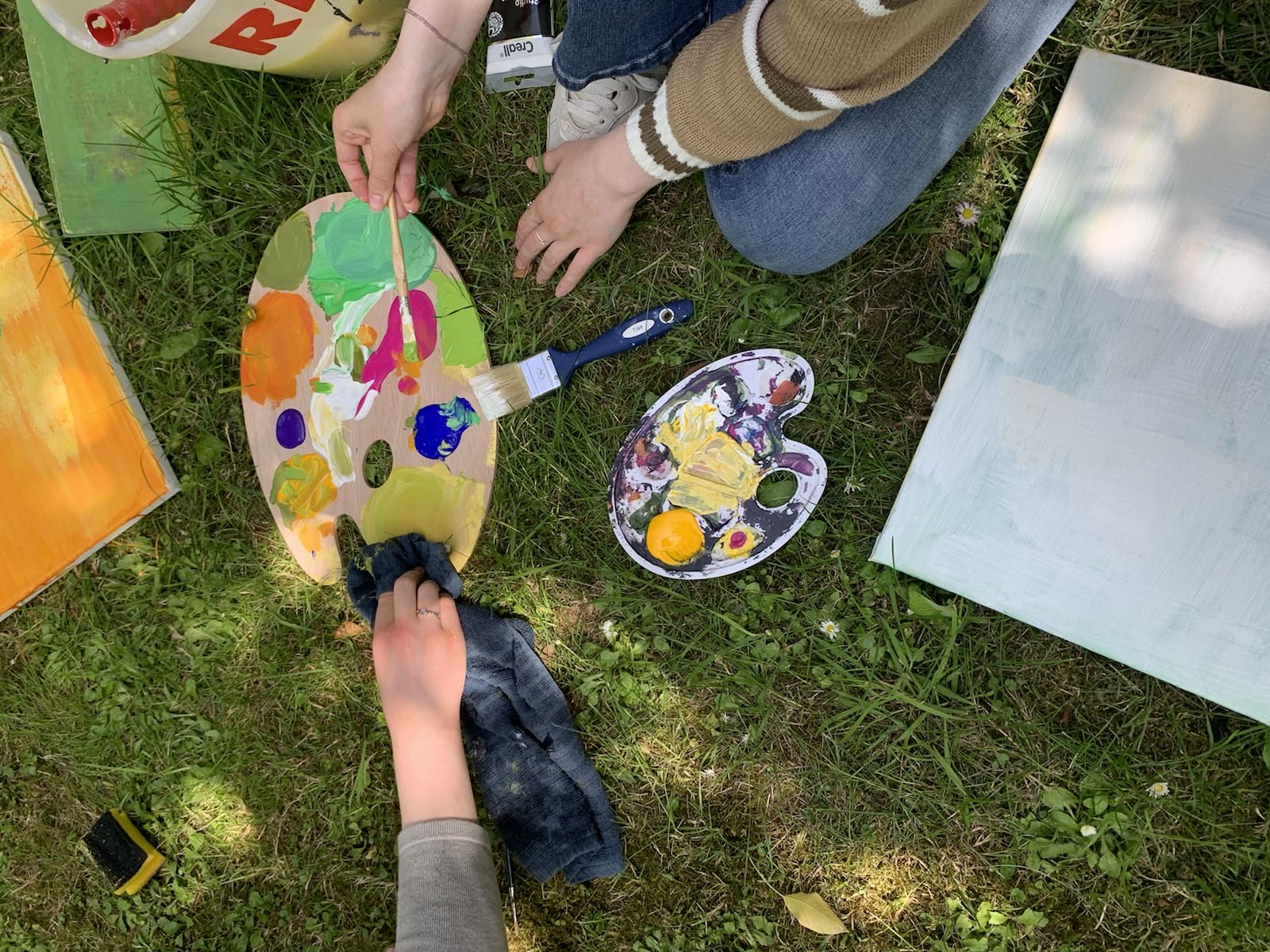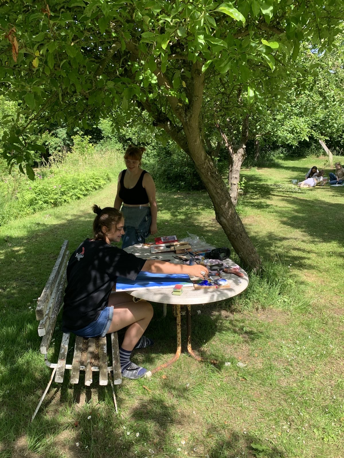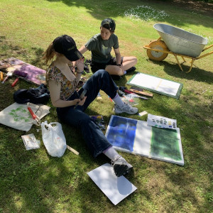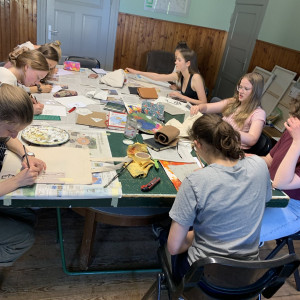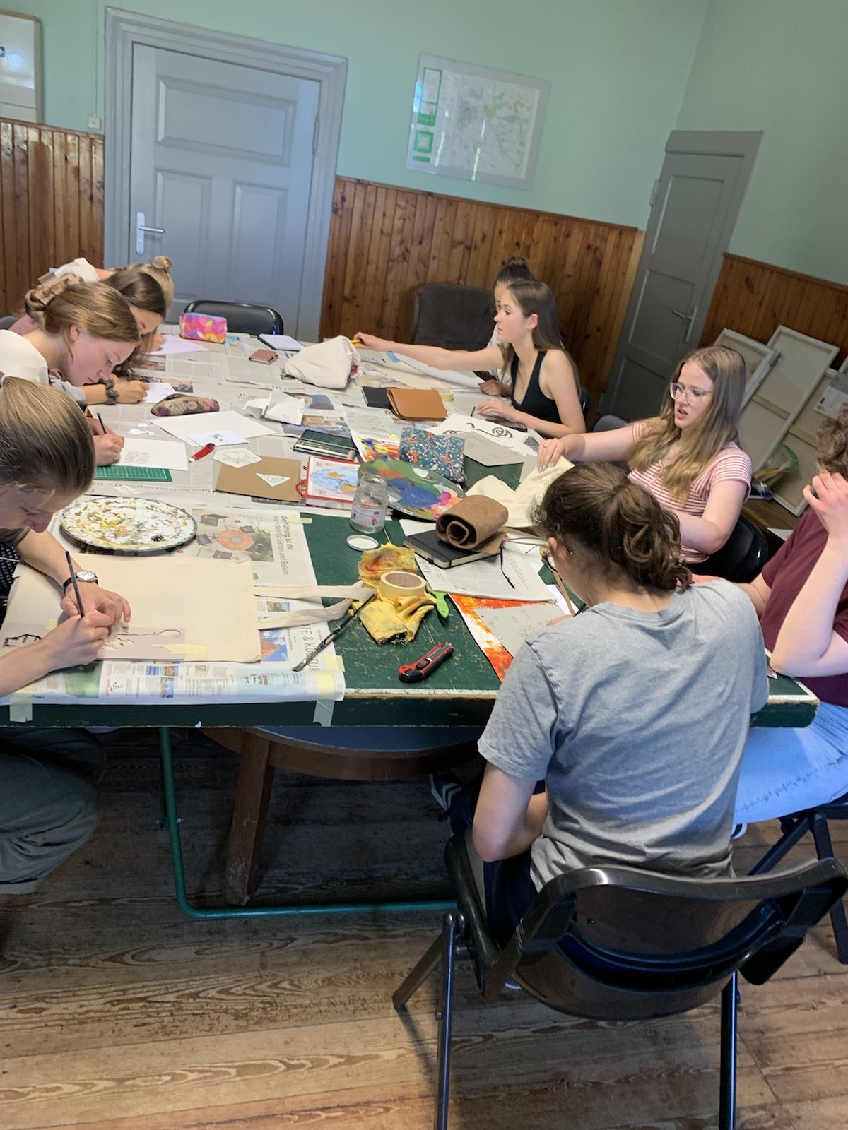 Das Abendessen wurde schließlich von einem unserer Küchenteams zubereitet, die wir aufgrund des Selbstversorger-Prinzips eingeteilt hatten. Anschließend fanden wir uns alle in der hintersten Ecke des großen Gartens wieder, in der wir nach einigen Versuch schließlich ein großes Lagerfeuer entzünden konnten, an dem wir noch bis in den späten Abend saßen. Am nächsten Morgen ging es mit der Kunst schließlich richtig los. So begannen wir mit einer Achtsamkeitsmeditation, zu der wir uns im Garten versammelten und durch die wir Impulse und Inspirationen für unser abstraktes Gemälde, das auf den noch weißen Leinwänden entstehen sollte, fanden. Gleich darauf begannen die Pinsel, Malerrollen oder Spachtel über die leeren Maluntergründe zu fliegen und aus toten Fläche eine lebendige Verwirklichung unser Idee zu schaffen. So arbeiteten wir fast den gesamten Vormittag, bis wir uns schließlich nach dem Mittagessen auf einen kleinen Spaziergang begaben, der uns über eine Ausstellung hin zu Frau Ponomarew-Johns Haus führte, in dessen Garten wir Holunderblüten-Brause tranken und die Pause genossen. Zurück in unserer Unterkunft ging es nun allerdings weiter mit der Kunst, wobei im späteren Verlauf die Arbeiten auf die Baumwollbeutel oder aber unsere eigenen Skizzenbücher ausgeweitet wurden. Nach der letzten Abendmahlzeit versammelten wir uns in dem kleinen selbsternannten Atelier unserer Unterkunft, in dem wir unsere erschaffenen abstrakten Malarbeiten betrachteten, ebenso wie die Baumwollbeutel und uns über Erfahrungen aus dieser Art, Kunst zuerschaffen, austauschten.