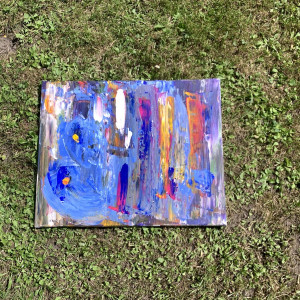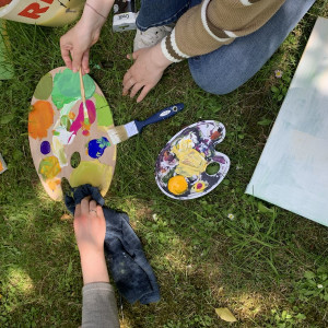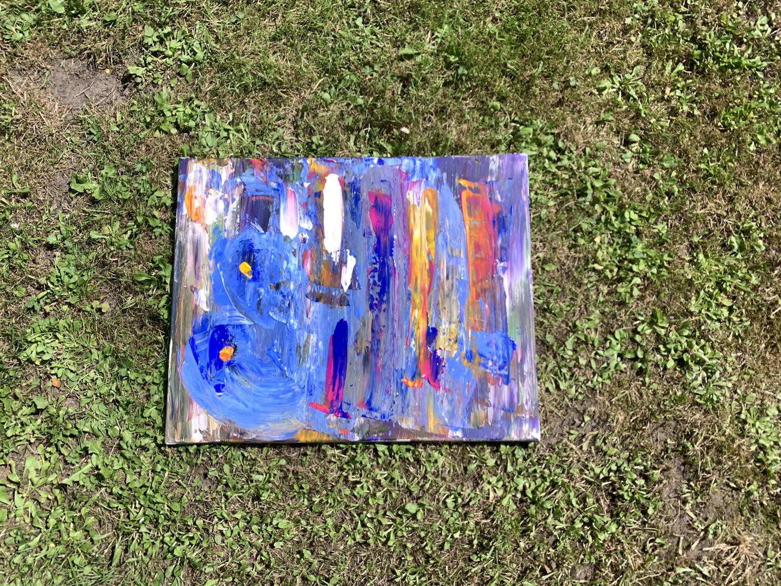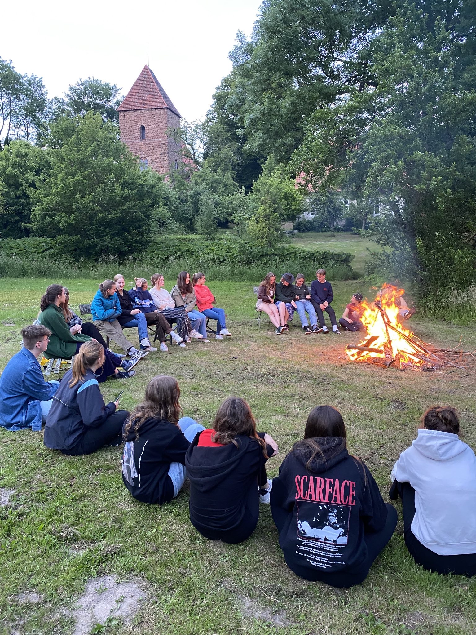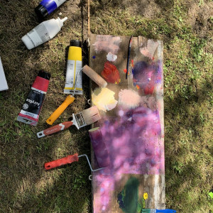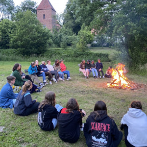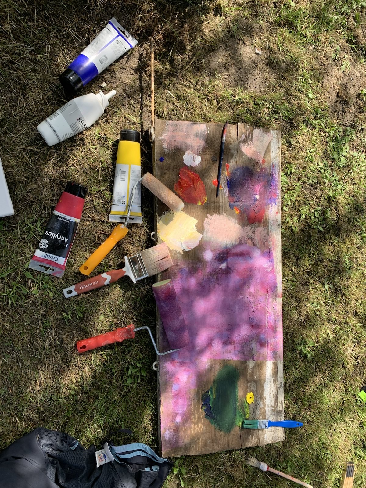Das Abendessen wurde schließlich von einem unserer Küchenteams zubereitet, die wir aufgrund des Selbstversorger-Prinzips eingeteilt hatten. Anschließend fanden wir uns alle in der hintersten Ecke des großen Gartens wieder, in der wir nach einigen Versuch schließlich ein großes Lagerfeuer entzünden konnten, an dem wir noch bis in den späten Abend saßen. Am nächsten Morgen ging es mit der Kunst schließlich richtig los. So begannen wir mit einer Achtsamkeitsmeditation, zu der wir uns im Garten versammelten und durch die wir Impulse und Inspirationen für unser abstraktes Gemälde, das auf den noch weißen Leinwänden entstehen sollte, fanden. Gleich darauf begannen die Pinsel, Malerrollen oder Spachtel über die leeren Maluntergründe zu fliegen und aus toten Fläche eine lebendige Verwirklichung unser Idee zu schaffen. So arbeiteten wir fast den gesamten Vormittag, bis wir uns schließlich nach dem Mittagessen auf einen kleinen Spaziergang begaben, der uns über eine Ausstellung hin zu Frau Ponomarew-Johns Haus führte, in dessen Garten wir Holunderblüten-Brause tranken und die Pause genossen. Zurück in unserer Unterkunft ging es nun allerdings weiter mit der Kunst, wobei im späteren Verlauf die Arbeiten auf die Baumwollbeutel oder aber unsere eigenen Skizzenbücher ausgeweitet wurden. Nach der letzten Abendmahlzeit versammelten wir uns in dem kleinen selbsternannten Atelier unserer Unterkunft, in dem wir unsere erschaffenen abstrakten Malarbeiten betrachteten, ebenso wie die Baumwollbeutel und uns über Erfahrungen aus dieser Art, Kunst zuerschaffen, austauschten.