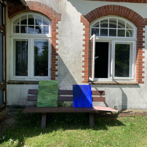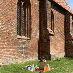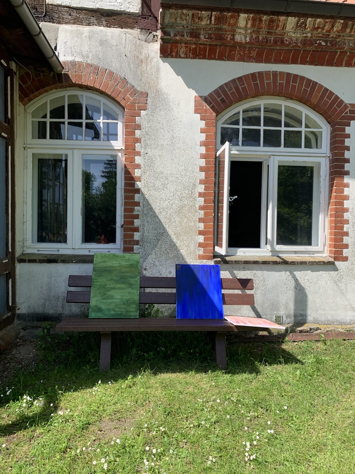 Es war eine merkwürdige Reisegruppe, die sich dort am Lübecker Hauptbahnhof kurz vor vier versammelte. Mit riesigem Gepäck und vor allem noch größeren Leinwänden oder Malpappen bepackt standen ungefähr zwanzig Jugendliche in der Eingangshalle des Gebäudes und warteten auf die letzten Eintreffenden. Mit dem Zug sollten wir selbstständig von hier bis zu dem eingleisigen Bahnsteig in Plüschow fahren, wo uns Frau Ponomarew-John bereits erwarten würde. Hierbei war vermutlich nicht das rechtzeitige Drücken der „Haltewunschtaste“ die größte Herausforderung, sondern wohl eher das Stehen oder mit etwas Glück auch Sitzen in einem viel zu überfüllten Zug. Dementsprechend groß war schließlich auch die Erleichterung nach dem erlösenden Ausstieg. Während unser Gepäck nun von zwei Autos zu unserer Unterkunft einen Ort weiter transportiert wurden, machten wir uns zu Fuß auf den Weg, der uns zwischen Feldern hindurch in die winzige Ortschaft Friedrichshagen führte. Direkt neben einer kleinen Kirche befand sich das ehemalige Pastorat, das inzwischen in eine Unterkunft umfunktioniert worden war und für die nächsten zwei Nächte unsere Bleibe sein sollte. Nach dem Einrichten unserer Zimmer begannen wir schon bald mit unserer Arbeit. Zunächst stand das Erstellen eines sogenannten Stencils, eine Art Schablone für Textildrucke auf Stoff, auf dem Plan. Diese sollten im Zuge unseres Schulfestes angefertigt werden, um schließlich auf Baumwollbeuteln ihre Anwendung zu finden. Doch auch hier wurde bereits mit dem Malen von Farbstudien oder anderer Kunst begonnen.