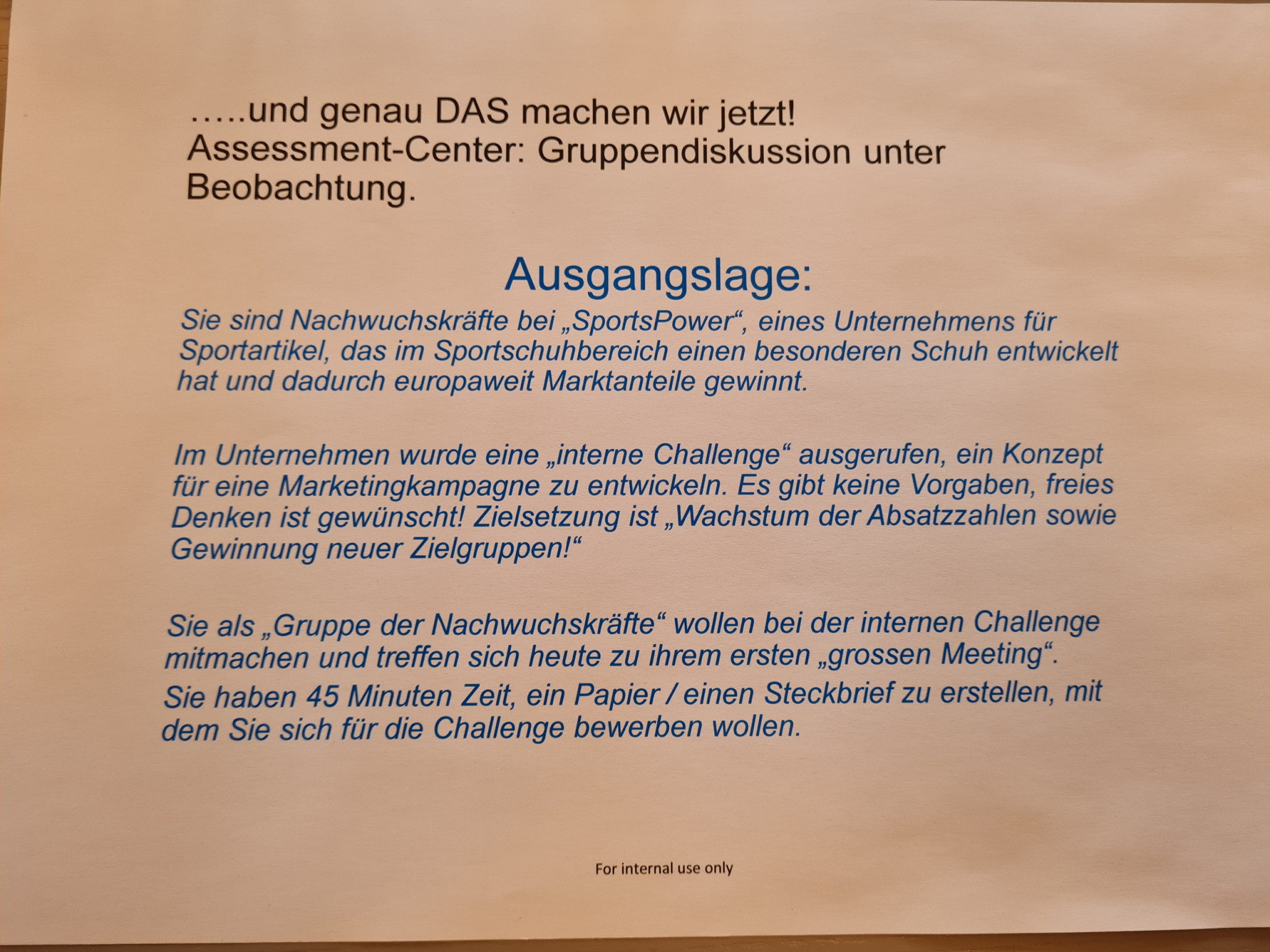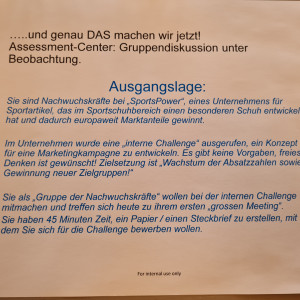 Dabei sollten wir einen Sportschuh so gestalten, dass der Absatz gesteigert würde und wir nun statt nur in Deutschland in ganz Europa den Verkauf starten. Dabei stand es uns frei, den Schuh so zu entwerfen, wie wir es möchten; einziges Ziel war, ein Positionspapier zu gestalten. Die Diskussion war frei und ohne Eingriffe seitens der „Prüfungskommission“. In der Diskussion sollte deutlich werden, worin die Stärken und Schwächen jeder einzelnen Person liegen.