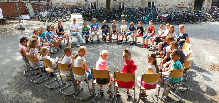 Hanna: Wir haben ganz viele Kennenlernspiele gespielt zum Namenmerken. Da hat mir das Spiel „Obstsalat“ gefallen. Bei diesem Spiel haben wir uns in einem Kreis hingesetzt. Dann musste einer in die Mitte gehen, hat etwas gesagt, zum Beispiel, was er gerne macht oder was er schon einmal gemacht hat, und wer das Gleiche auch mag oder das Gleiche auch schon einmal gemacht hatte, musste aufspringen und sich einen neuen Platz suchen, und wer keinen neuen Platz gefunden hat musste in die Mitte gehen und eine neue Frage stellen.
