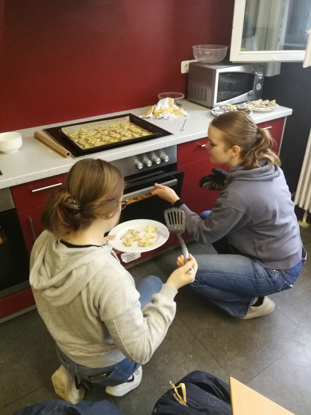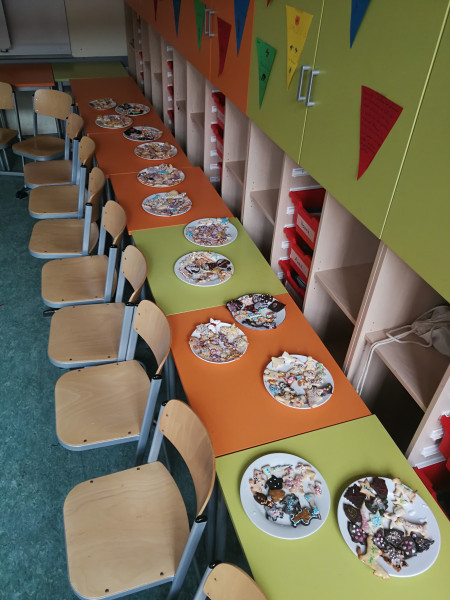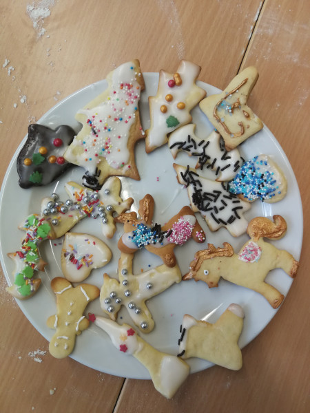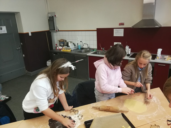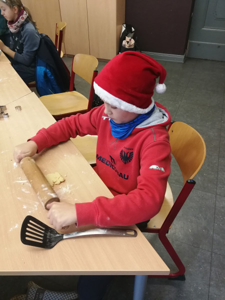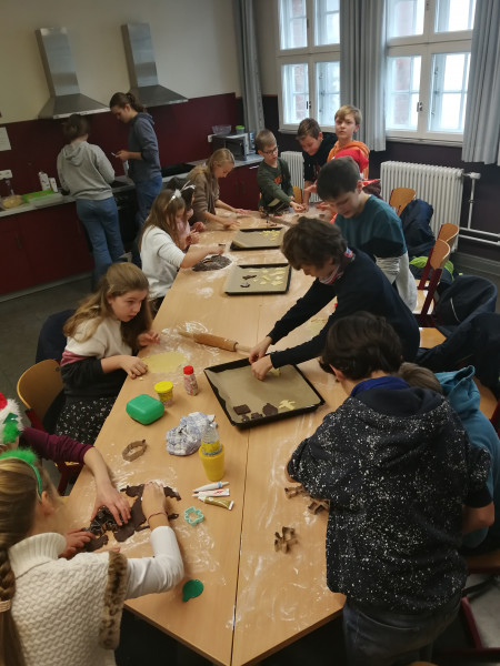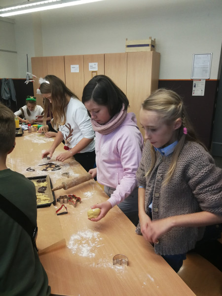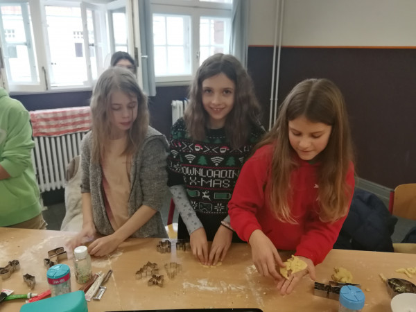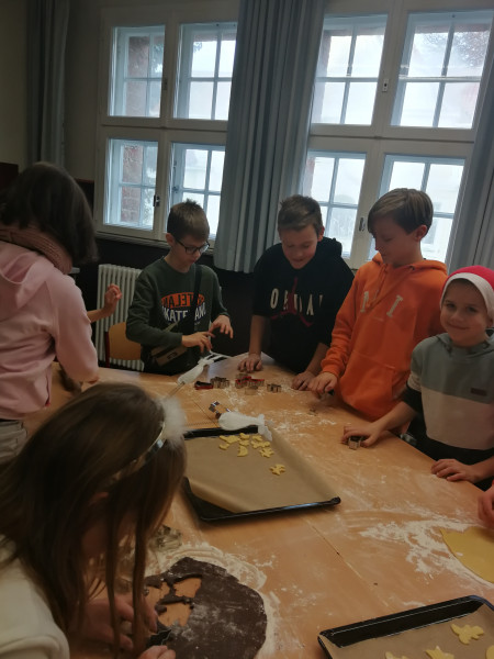 Nach einigen organisatorischen Absprachen im Klassenrat wurden dann am 7.12. Teig, Ausstechformen sowie Dekoration für die Plätzchen mit in die Schulküche gebracht. Unsere Patinnen Annika, Greta, Anneke und Katharina hatten dann noch die tolle Idee, den Raum zu diesem Anlass weihnachtlich zu dekorieren. So haben wir den Schultag genutzt, um zu backen und parallel zu basteln. Während sich die eine Hälfte der Klasse dem Basteln widmete und von Annika und Greta unterstützt wurde, hat der Rest der Klasse in der Schulküche gerollt, ausgestochen, gebacken und dekoriert. Einhörner, Weihnachtssterne und Ampelmännchen – alles war dabei. Nach 90 Minuten wurde dann für die zweite Runde getauscht. Am Ende des Vormittages hatten wir einen toll dekorierten Raum für unsere Weihnachtsfeier!