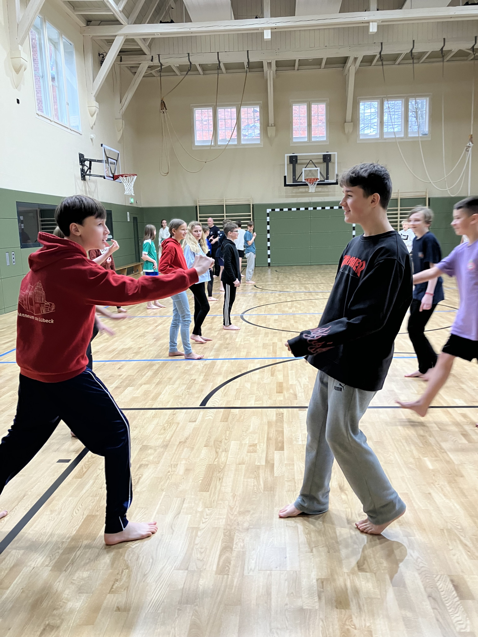 Der Kurs wurde im Rahmen des Präventionscurriculum von PiT (Prävention im Team) durchgeführt. Unter Anleitung des lizensierten Trainers Torsten vom TuS Lübeck 93, der bereits an vielen Schulen Selbstverteidigungskurse anbietet, wurden verschiedene Verhaltensweisen und Befreiungsgriffe gelernt. Unterstützt wurde er freundlicherweise von unserem Oberstufenschüler Lukas (Ec), der bereits seit mehreren Jahren im Kampfsportbereich trainiert. Noch einmal ein riesiges Dankeschön dafür!