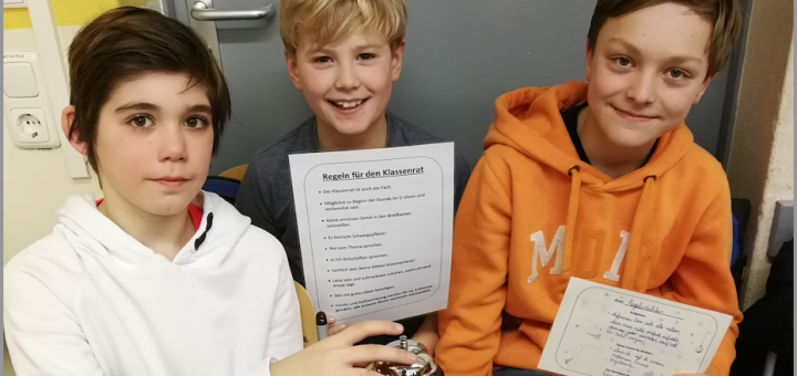 Der Klassenrat der 5c ist besonders. Dort leitet nicht die Klassenlehrerin die Themen, sondern der alle zwei Wochen neu gewählte Vorsitz. Er oder sie verteilt dann die Ämterkarten, z.B. den Regelwächter, der dafür zuständig ist, das Gesprächsregeln eingehalten werden oder die Zeitwächterin, die darauf achtet, dass die Themen der Tagesordnung nicht zu lang behandelt werden. Es gibt außerdem noch Dienständerungsbeauftragte, Protokollanten, die Themen und Ergebnisse aufschreiben, und den Briefleser.