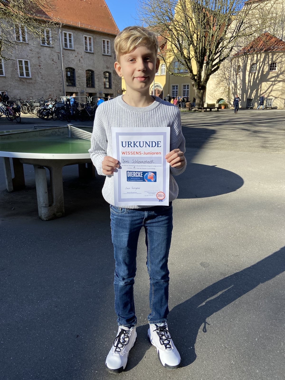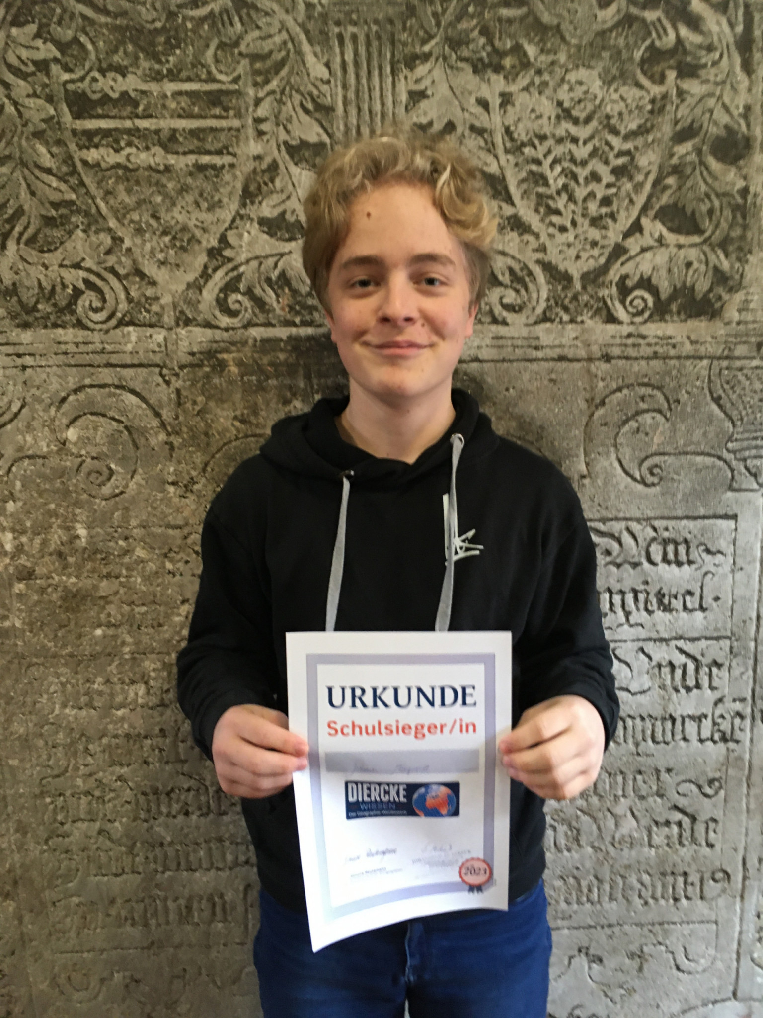 Welche Form hat Indien? Fragen dieser Art gab es im diesjährigen Diercke-Wissen-Geographie-Schulwettbewerb, an dem viele Klassen teilgenommen haben. Die jeweiligen Klassensiegerinnen und Klassensieger haben sich  am 20. März in der Aula getroffen, um gegeneinander anzutreten. In der Klassengruppe 7-10 hat Johannes aus der Ed die meisten Punkte erreicht, in der Klassengruppe 5 Joris aus der 5b. Herzlichen Glückwunsch an unsere Schulsieger!