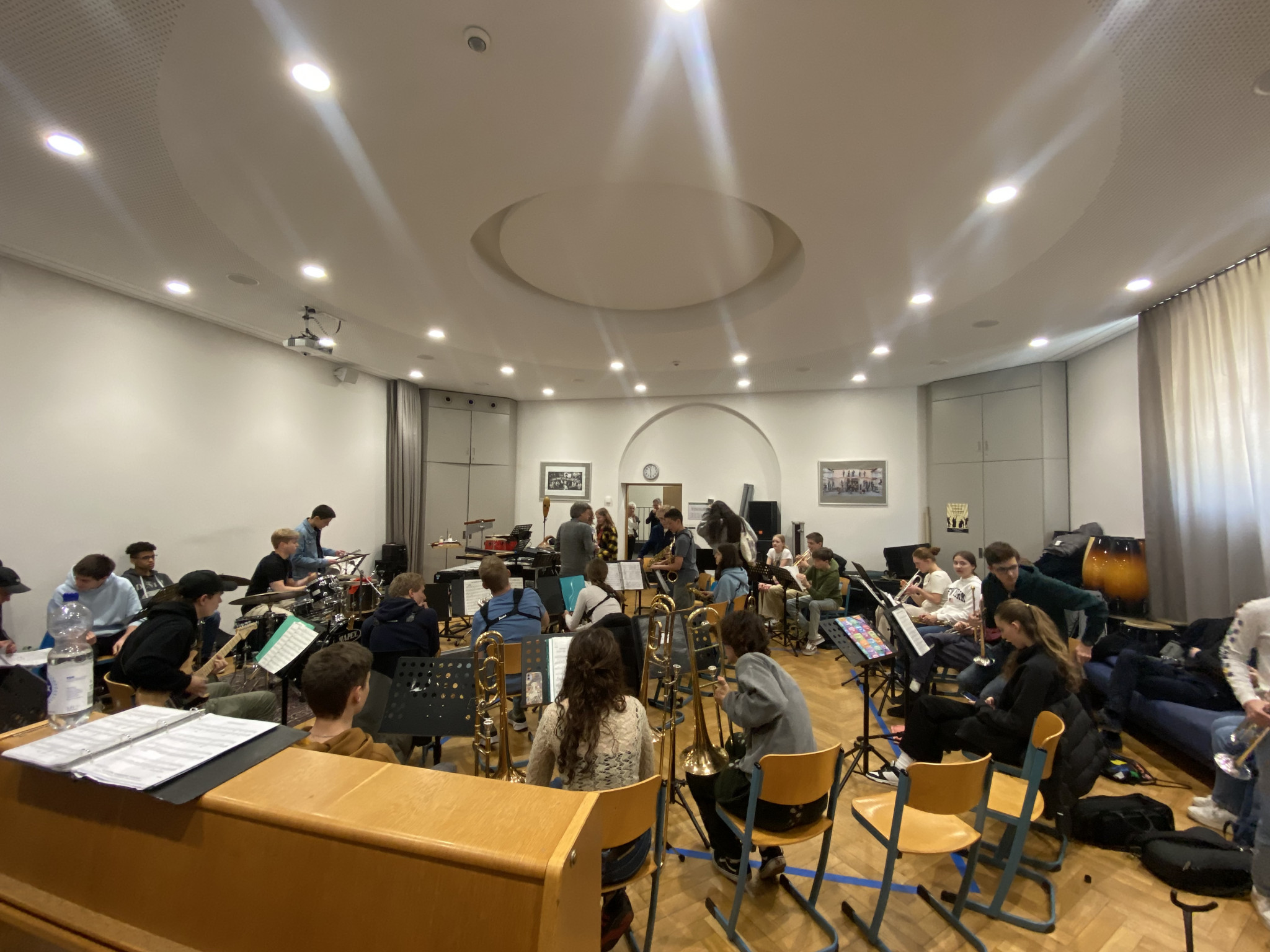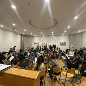 Am Dienstag- und Mittwochabend stand jeweils für die beiden Orchester und die Bands ein Konzert an. Während die beiden Schulorchester in der Stadtkirche spielen durften, sorgten die Bands in der Aula der Partnerschule, dem Goethe-Gymnasium, für ordentlich Stimmung. Bei beiden Konzerten fand eine Vereinigung der Schulen statt: In der Stadtkirche performten zum krönenden Abschluss knapp 70 Mitglieder, zusammengelegt aus dem Schul- und Sinfonieorchester, Brahms Ungarische Tänze. Die beiden Leiter der Ensembles, Herr Maetzel und Herr Vennefrohne aus Ludwigsburg, teilten sich beim Dirigieren auf und brachten den Saal in Stimmung. Während das Sinfo dem Schloss einen Besuch abstattete, probte die BigBand zusammen mit der Band des Goethe-Gymnasiums fleißig. Die Ergebnisse der Arbeiten wurden uns mit einem tollen Konzert präsentiert, dass der Boden gemeinsam mit den Leitern Herr Jung und Herr Heinzelmann bebte.