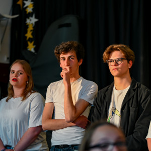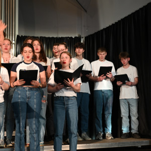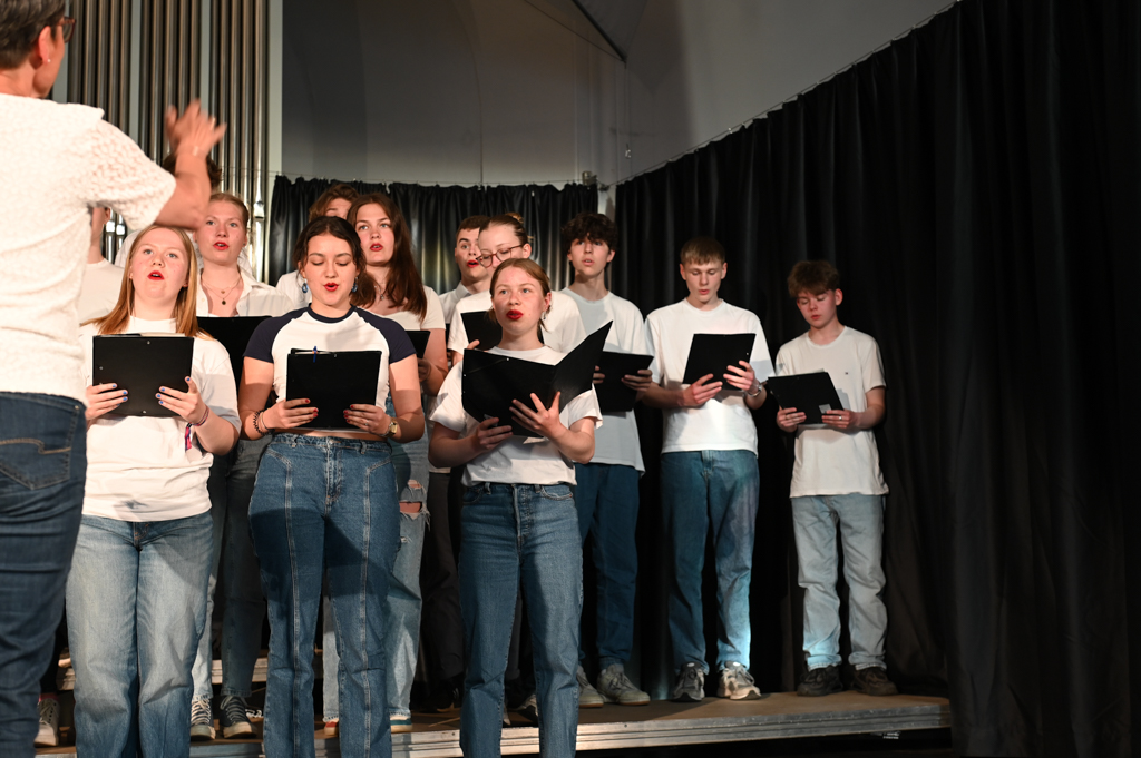 Als Abschluss und stimmungsvollen Höhepunkt sangen wir zusammen das englische Stück „Evening rise“. Dazu verließen wir die Bühne und standen in einem großen Kreis im Zuschauerraum verteilt. So füllten all unsere Stimmen die ganze Aula mit dem Klang dieses Klassikers, der diese Veranstaltung abrundete.
