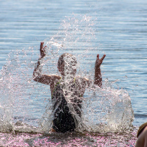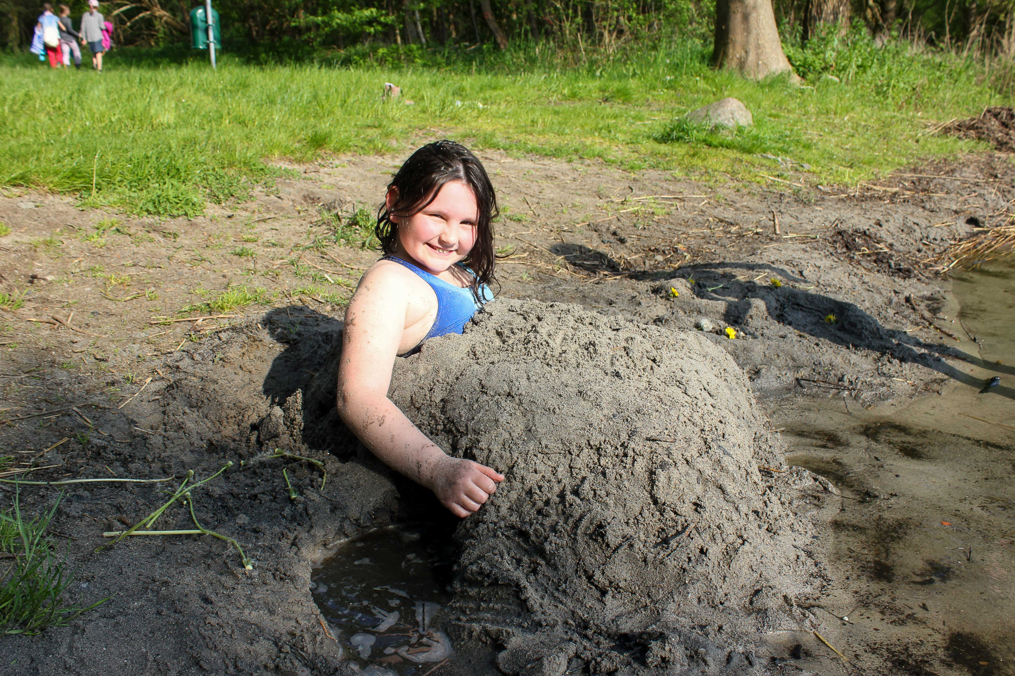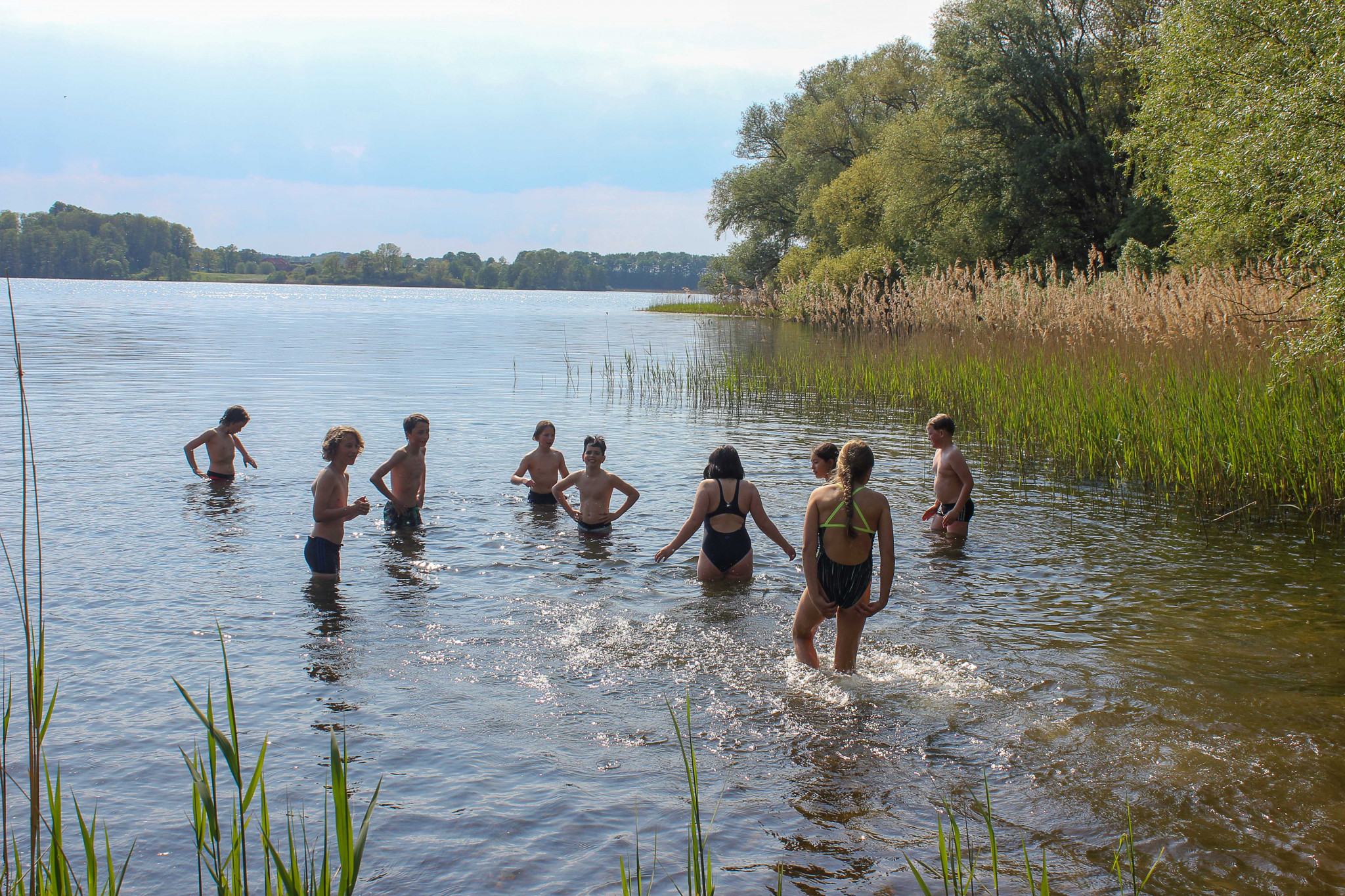 An der Unterkunft angekommen wurden wir erstmal mit den Hausregeln vertraut gemacht. Als wir uns in Zimmergruppen aufgeteilt und uns eingerichtet hatten, erkundeten wir das Gelände der Begegnungsstätte: Ein großzügiges Areal mit Bänken und Feuerstelle, einem Volleyballfeld, einer großen Wiese zum Fußballspielen, die von riesigen Bäumen (darunter auch ein Mammutbaum) umgeben war. Anschließend gab es ein deftiges Mittagessen in der Mensa. Wir erkundeten auch das Gelände, das die Begegnungsstätte umgab. Zwischen den Bäumen erblickten wir das Glitzern des Goldensees in der Nachmittagssonne. Darin badeten wir ausgiebig. Als wir uns ausreichend abgekühlt hatten, machten wir uns auf den Rückweg zur Unterkunft. Nach dem Abendessen entfachten wir ein Lagerfeuer an der Feuerstelle. Wir aßen Marshmallows, während wir „Werwolf“ spielten. Nach einem tollen, aufregenden und sehr langen Tag zogen wir uns auf unsere Zimmer zurück.