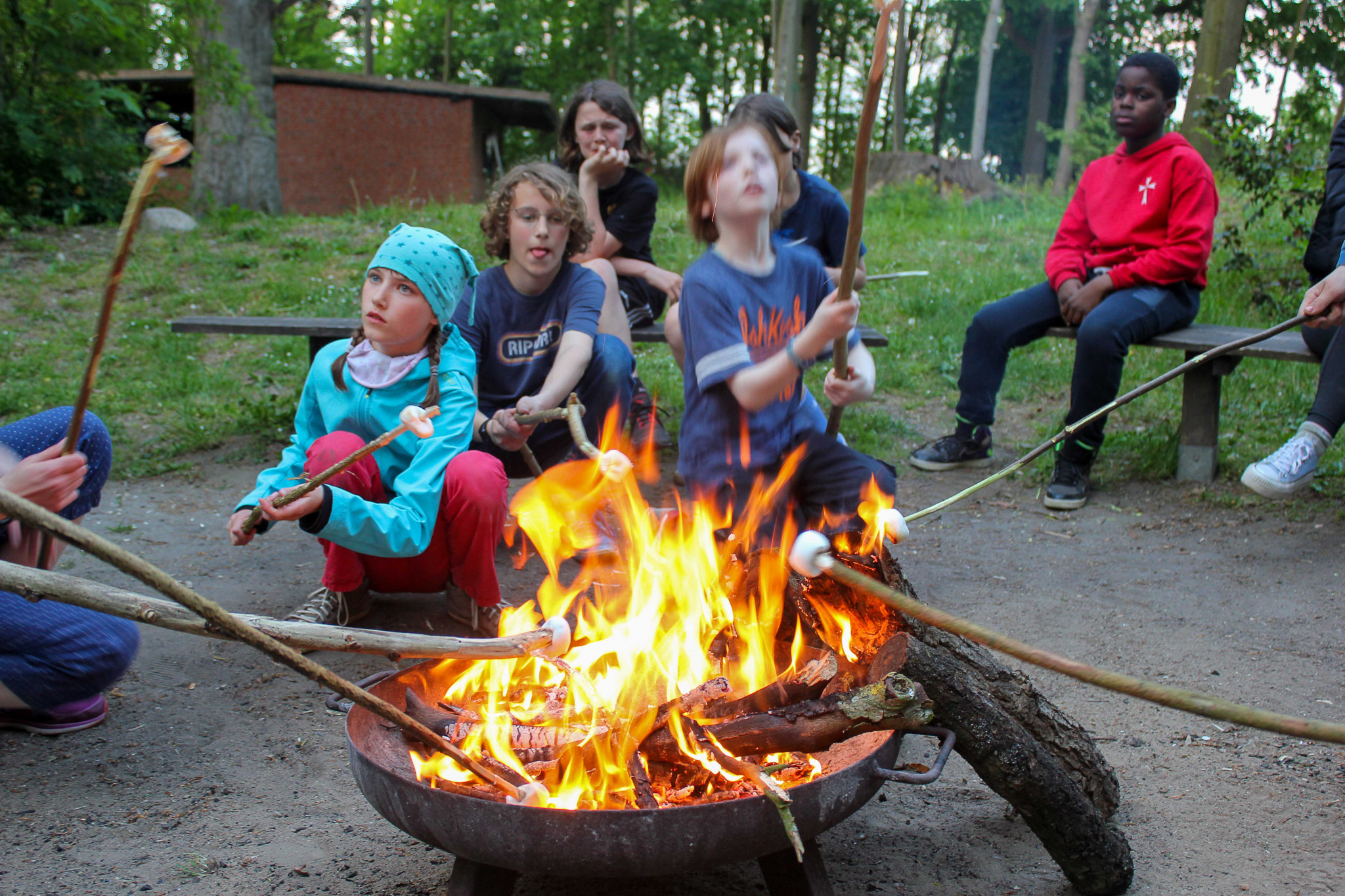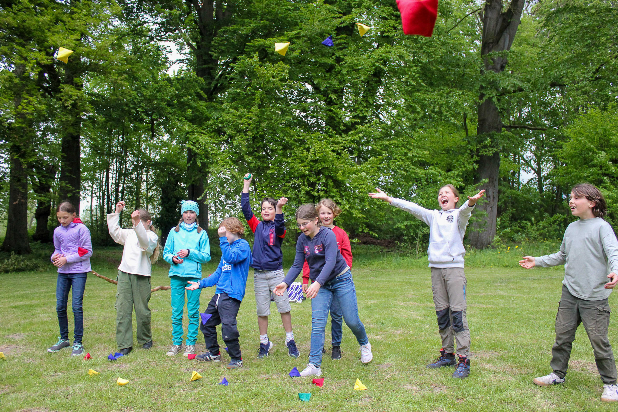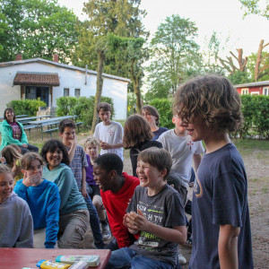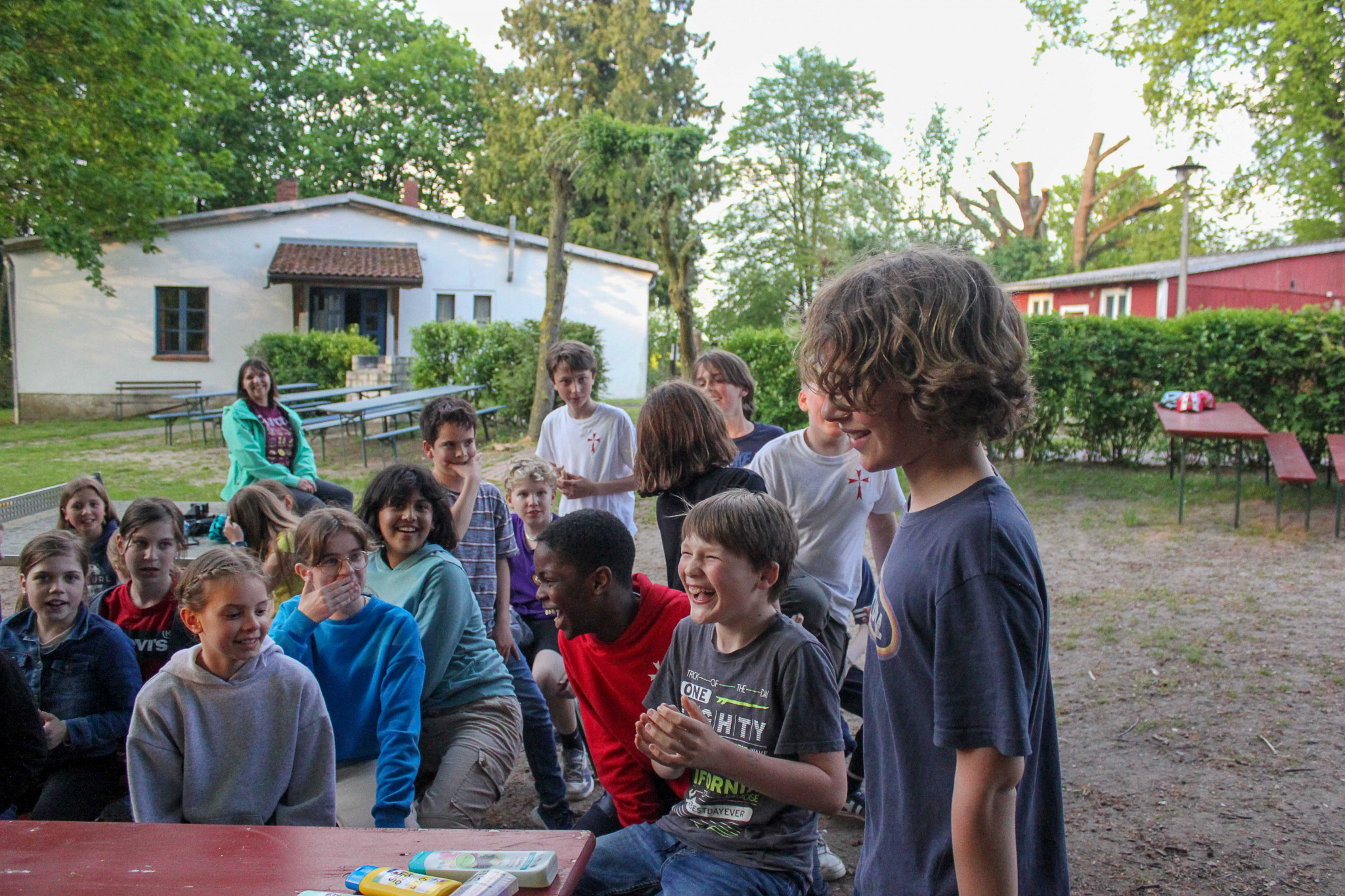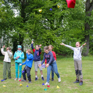 Der nächste Tag startete mit einem Frühstück. Danach haben wir Vertrauensübungen (unter der Anleitung der Begegnungsstättenleiterin) durchgeführt. Das war eine tolle Möglichkeit, die anderen Kinder von ganz anderen Seiten kennenzulernen. Anschließend spielten wir noch einige Spiele und Fußball. Während einige Fußball spielten, spielten parallel andere aus unserer Klasse mit einem Bumerang, der blöderweise in einen der großen Bäume flog und sich dort verhedderte. Wir versuchten tatkräftig den Bumerang wieder vom Baum herunter zu befördern. Doch leider ergebnislos! Sogar der Ball, mit dem wir versuchten den Bumerang herunter zu holen, blieb ausgerechnet auch noch im Baum hängen. Wir warfen mit Stöcken und Bällen, doch es war nichts zu machen. Wir beschlossen es am nächsten Tag erneut zu versuchen. Danach machte unser Klassenlehrer einen Jonglier-Workshop mit uns. Und haltet euch fest: Als eine kleine Windböe am Baum schnupperte, fielen auf einmal der Ball und der Bumerang aus dem Baum heraus. Was für ein Glück!