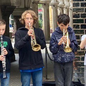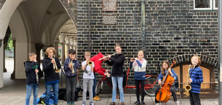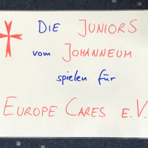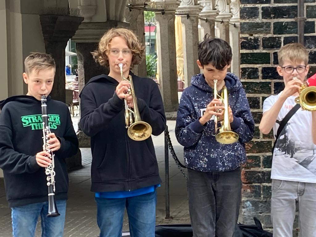 Ende Juni haben die JuniorS ihr Programm bei den Juniorkonzerten in der Aula präsentiert, am Mittwoch danach zogen sie bei sonnigem, aber stürmischen Wetter in die Fußgängerzone, um Spenden für Europe Cares e.V. zu sammeln.