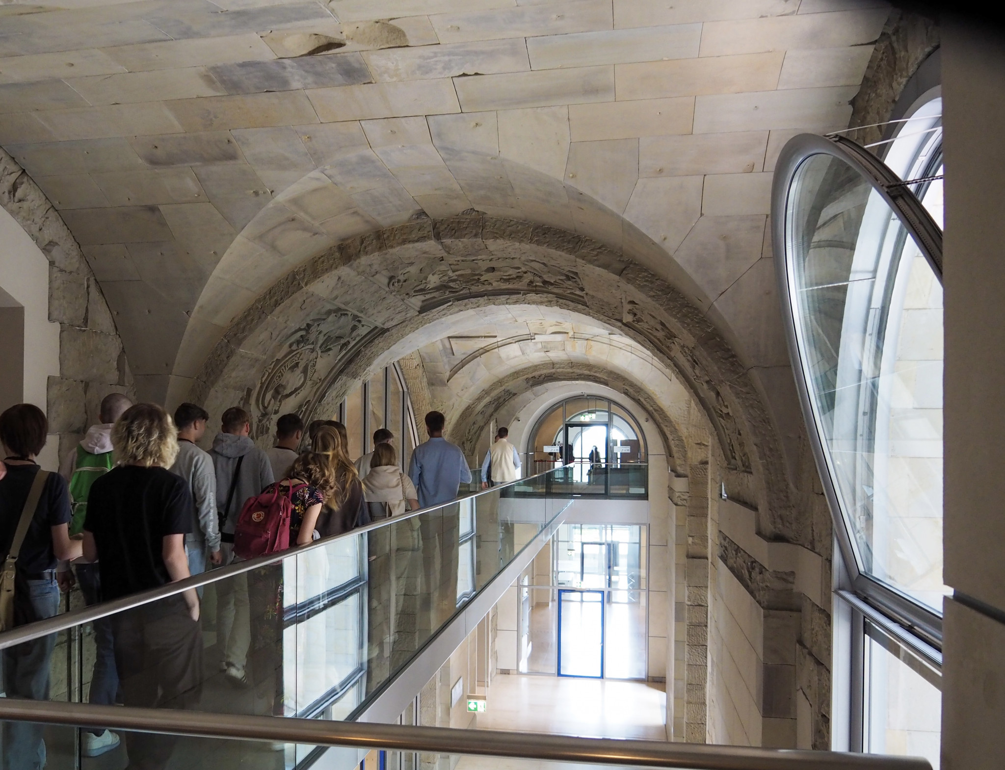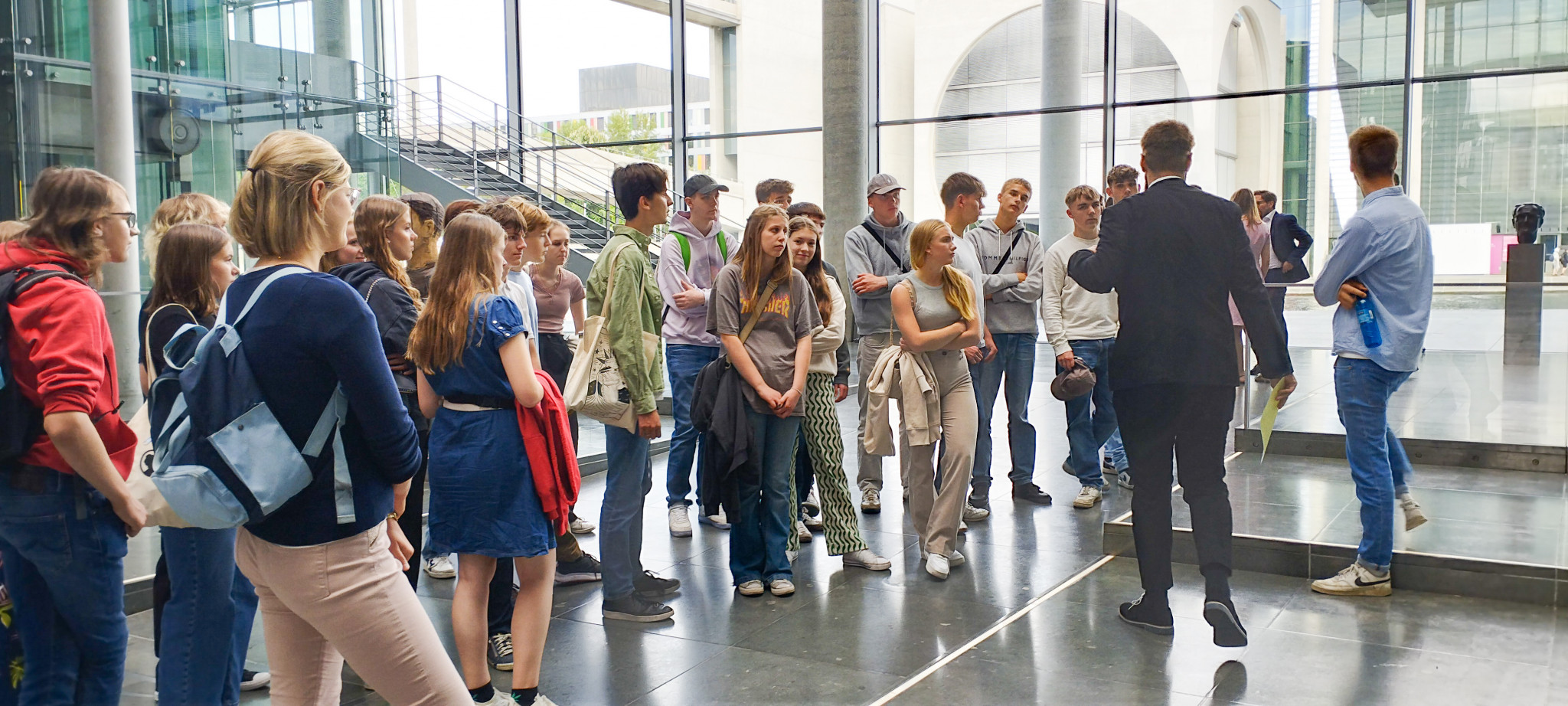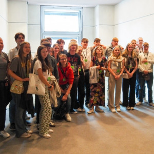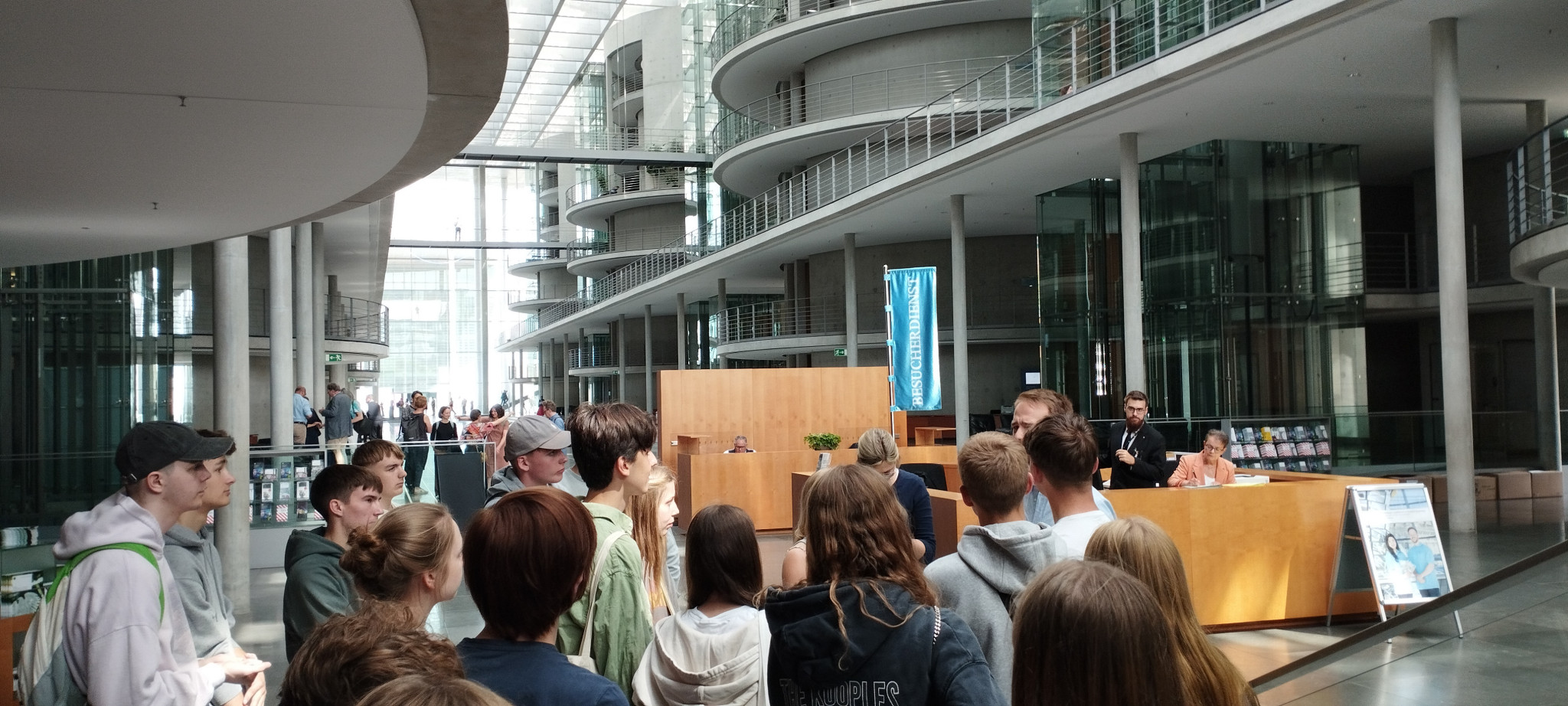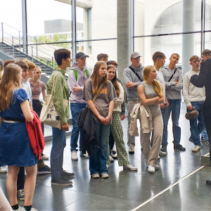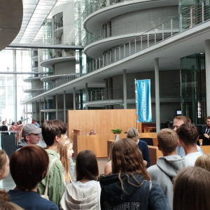 Am nächsten Tag sollte es auch schon los in den Bundestag gehen. Nach einem kurzen Stopp bei der bekannten Weltzeituhr standen wir vor dem Reichstagsgebäude und waren erstaunt, durch wie viele Sicherheitskontrollen man als Besucher:in gehen muss. Danach wurden wir von einem Assistenten von Tim Klüssendorf, dem Abgeordneten der SPD aus Lübeck, zur Plenarsitzung begleitet, in der hitzig diskutiert wurde. Es war ein wirklich spannendes Erlebnis, zu sehen, wie die verschiedenen Politiker:innen live miteinander debattierten und politische Abstimmungen nicht nur von zu Hause aus im Fernsehen mitzubekommen. Vor allem da wir im Profilfach auch schon selbst Planspiele durchgeführt hatten, die einer kleinen Plenarsitzung ähnelten. Auch anschließende Interviews mit Politiker:innen wurden geführt und wir konnten live bei den Befragungen auf den Fluren zusehen. Als Abschluss unseres Bundestagsbesuches konnten wir dann noch in der Bundstagskantine essen, von der aus man einen schönen Blick auf das Regierungsviertel und das Wasser hatte.