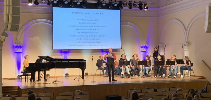 Diesmal fand das Zusammentreffen, anders als sonst nicht in der Musik und Kongresshalle, sondern im Kolosseum statt. Vielleicht erinnert ihr euch ja selber daran, wie aufgeregt ihr in der vierten Klasse „Brüderchen, komm tanz mit mir“ oder „Ein Schneider fing ne Maus“ lauthals beim Volksliedersingen mitgesungen habt. Denn seit vielen Jahren treffen sich Kinder, um gemeinsam Volkslieder  zu singen und das Sinfonieorchester begleitet, abwechselnd mit Frau Maetzel am Klavier, die Stücke dabei mit einem Kammerorchester.