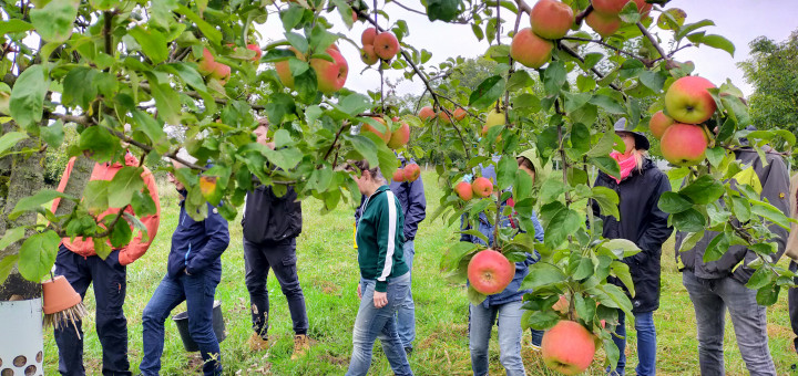 Als mehrere Kisten beisammen waren, wurden sie von einem kleinen Team zur Mosterei gebracht, so dass es jetzt im Lehrerzimmer selbst geernteten Apfelsaft geben kann. Das gibt sicherlich guten Schwung und Energie für den Unterricht!