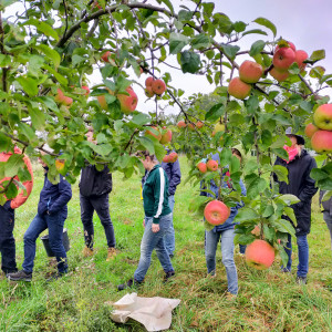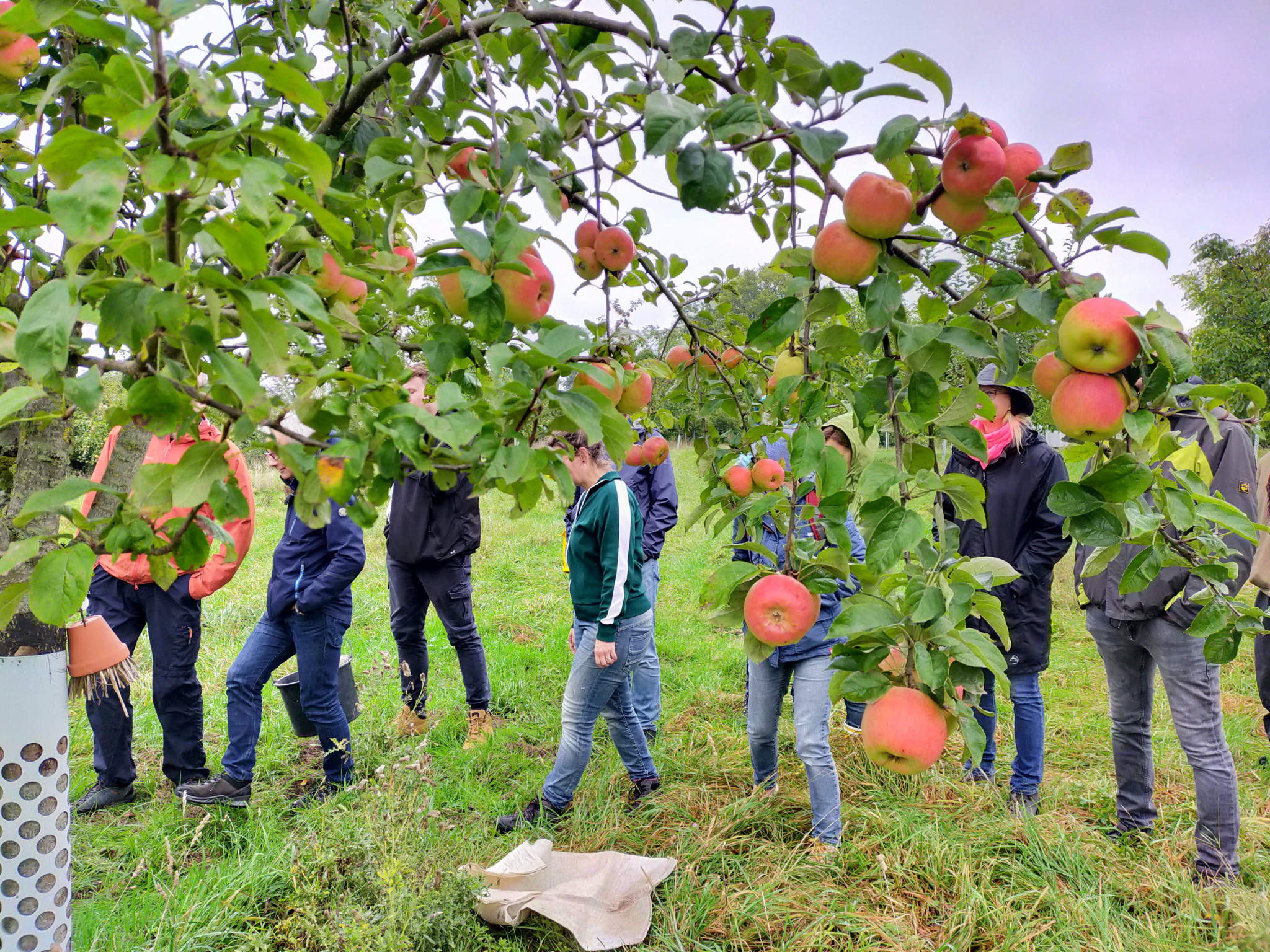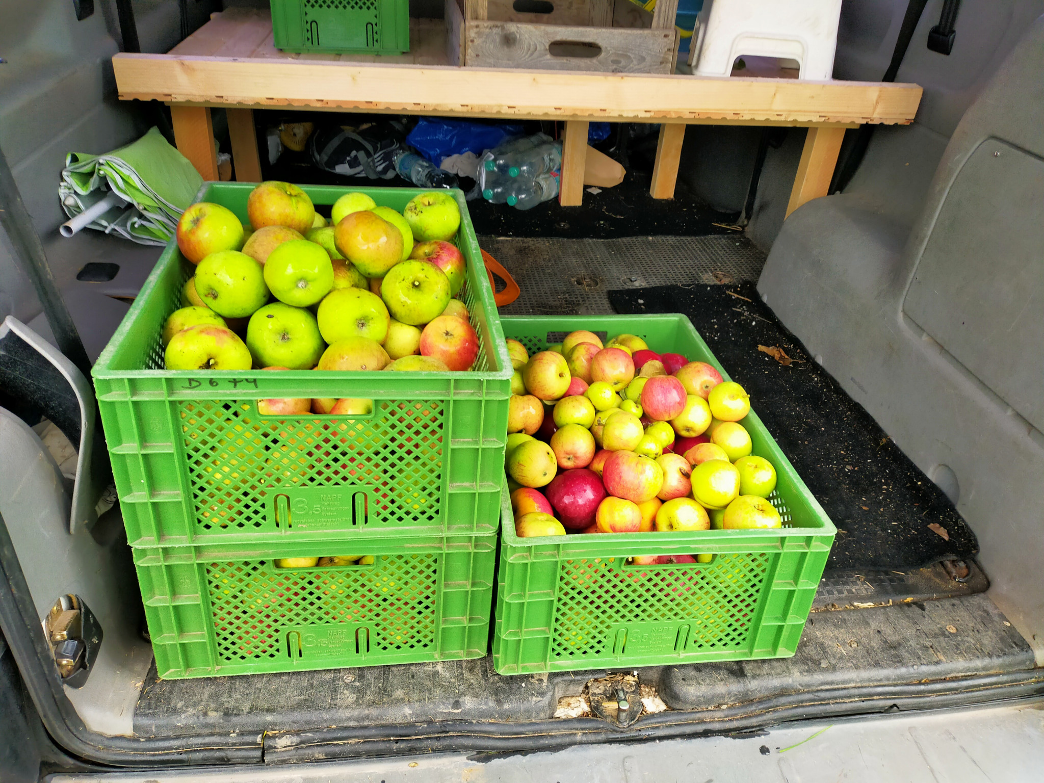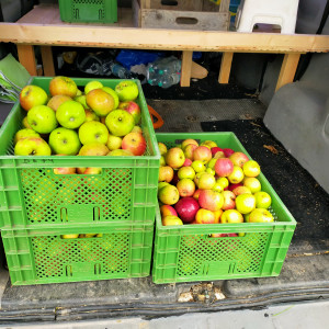 Als mehrere Kisten beisammen waren, wurden sie von einem kleinen Team zur Mosterei gebracht, so dass es jetzt im Lehrerzimmer selbst geernteten Apfelsaft geben kann. Das gibt sicherlich guten Schwung und Energie für den Unterricht!