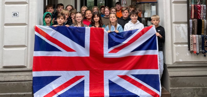 Vor den Ferien hatte Frau Strehl die Idee, ob wir die Flaggen für unsere Klasse haben könnten. Daraufhin schickten wir eine E-Mail an die Veranstalter, erhielten eine freundliche Antwort, und nach ein paar E-Mails waren Datum und Uhrzeit für die Abholung festgelegt. Nun also waren wir auf dem Weg, um Andreas Pahlke zu treffen und die Flaggen abzuholen, um in unseren Klassenraum eine britische Atmosphäre zu bringen. Als wir ankamen, wurden wir freundlich begrüßt, doch statt der Wimpel bekamen wir zwei unglaublich große Flaggen. Es ist zwar nicht das, was wir erhofft hatten, aber wir freuen uns mega über die Flaggen.