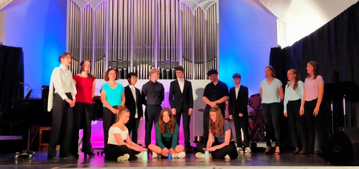 Schon vor den Sommerferien hatte die Klasse mit Frau Maetzel die Idee, die alte Tradition eines Konzertabends des Musikprofils wieder aufleben zu lassen. Viele gute Gründe sprachen sofort dafür: So kann deutlich werden, wie vielfältig musikalisch begabt die Schüler:innen sind, die Abikasse lässt sich bestens füllen, natürlich kann man an einem solchen Projekt lernen, was alles zur Organisation eines Konzerts dazugehört und dazu auch noch in einer zusammengewachsenen Klassengemeinschaft Spaß haben. Mit einer Probenwoche und einem Fachtag gelang dies absolut überzeugend! Durch Tim Burhorns und Dorian Greens Engagement am Technikpult gab es festliches Licht und guten Ton.