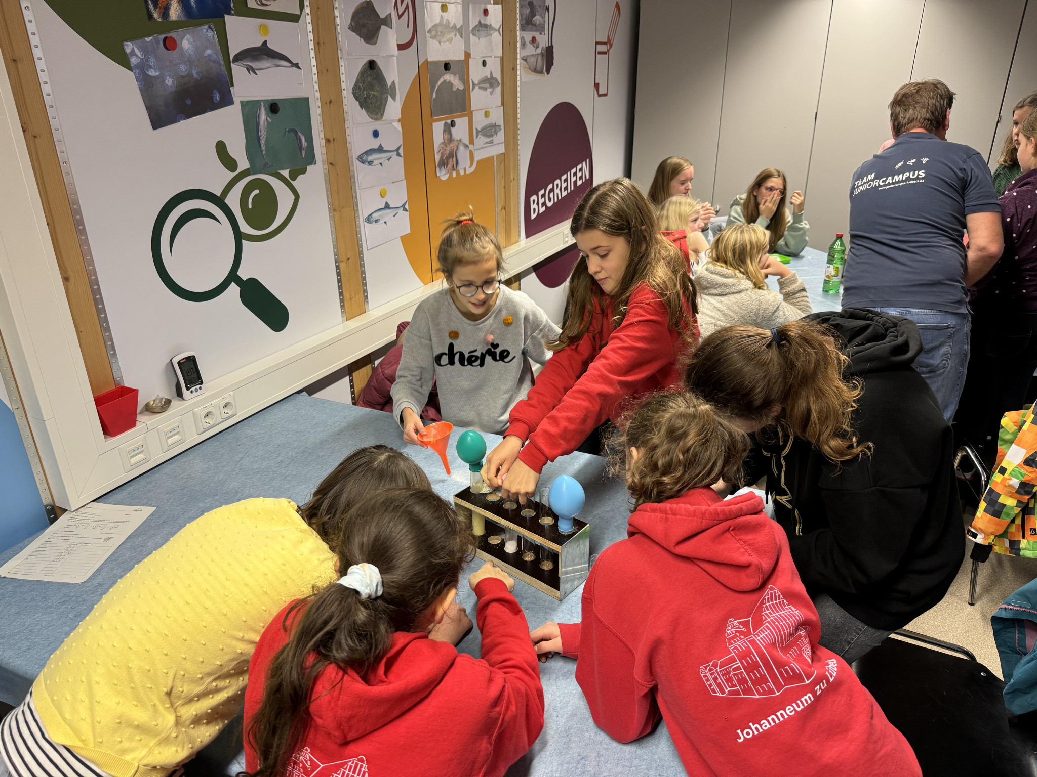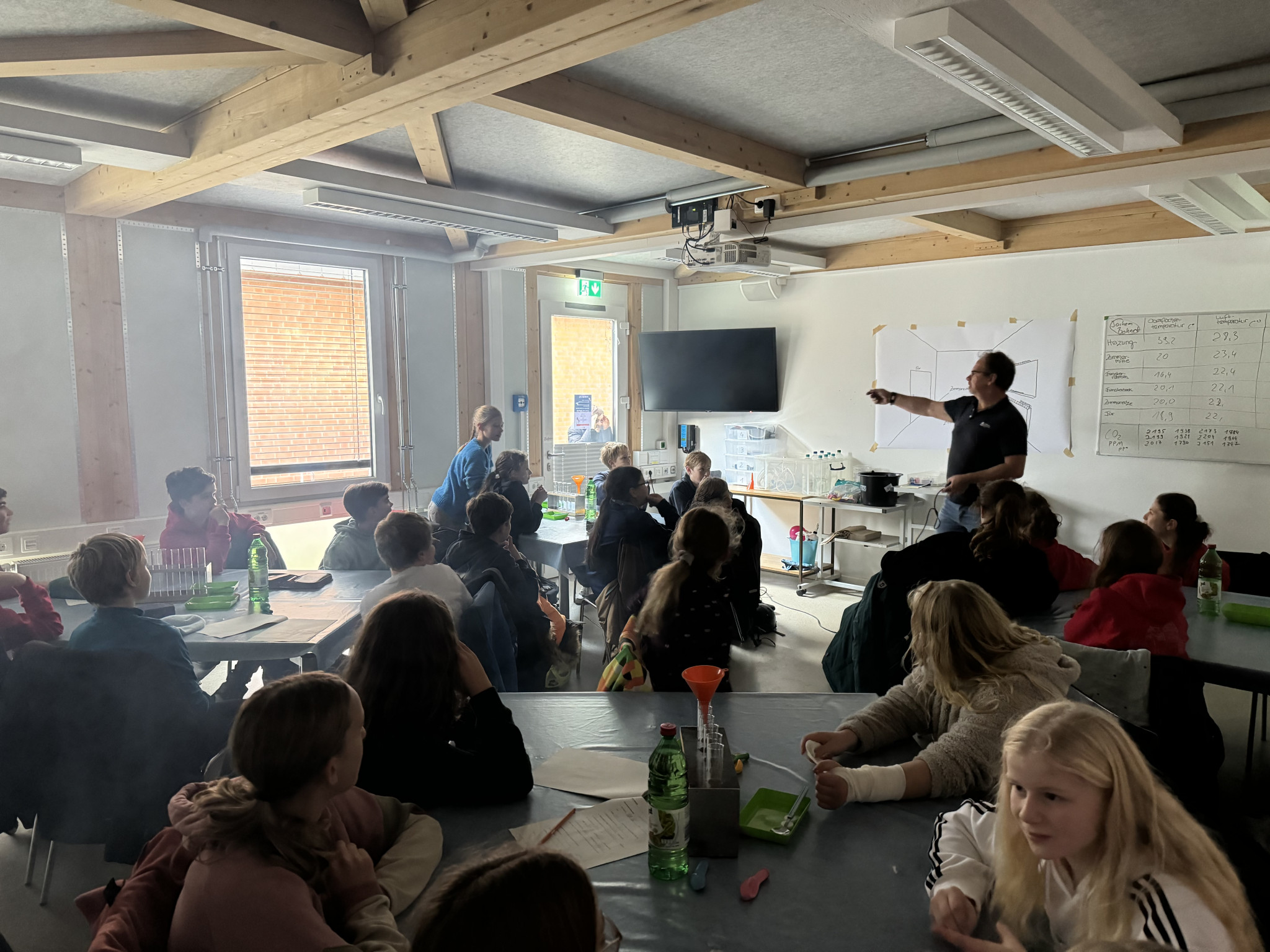 Unsere Klasse 6a war am 14. November mit Herrn Fromme beim Junior Campus. Wir sind nach einer 35-minütigen Busfahrt herzlich von Herrn Jochim in Empfang genommen worden. Alle waren schon aufgeregt. Als erstes lernten wir die Parameter für Luft kennen. Zum einen spielen die Oberflächentemperatur, die Lufttemperatur, die Luftfeuchtigkeit und die Anzahl der ppm (Parts per Million) an CO² in der Luft eine große Rolle. Zum anderen erforschten wir die Werte der Parameter in unserem Raum. Somit wussten wir, wie „gut“ unsere Luft im Raum war. Danach kam mit Abstand das beste und coolste Experiment des Tages.
