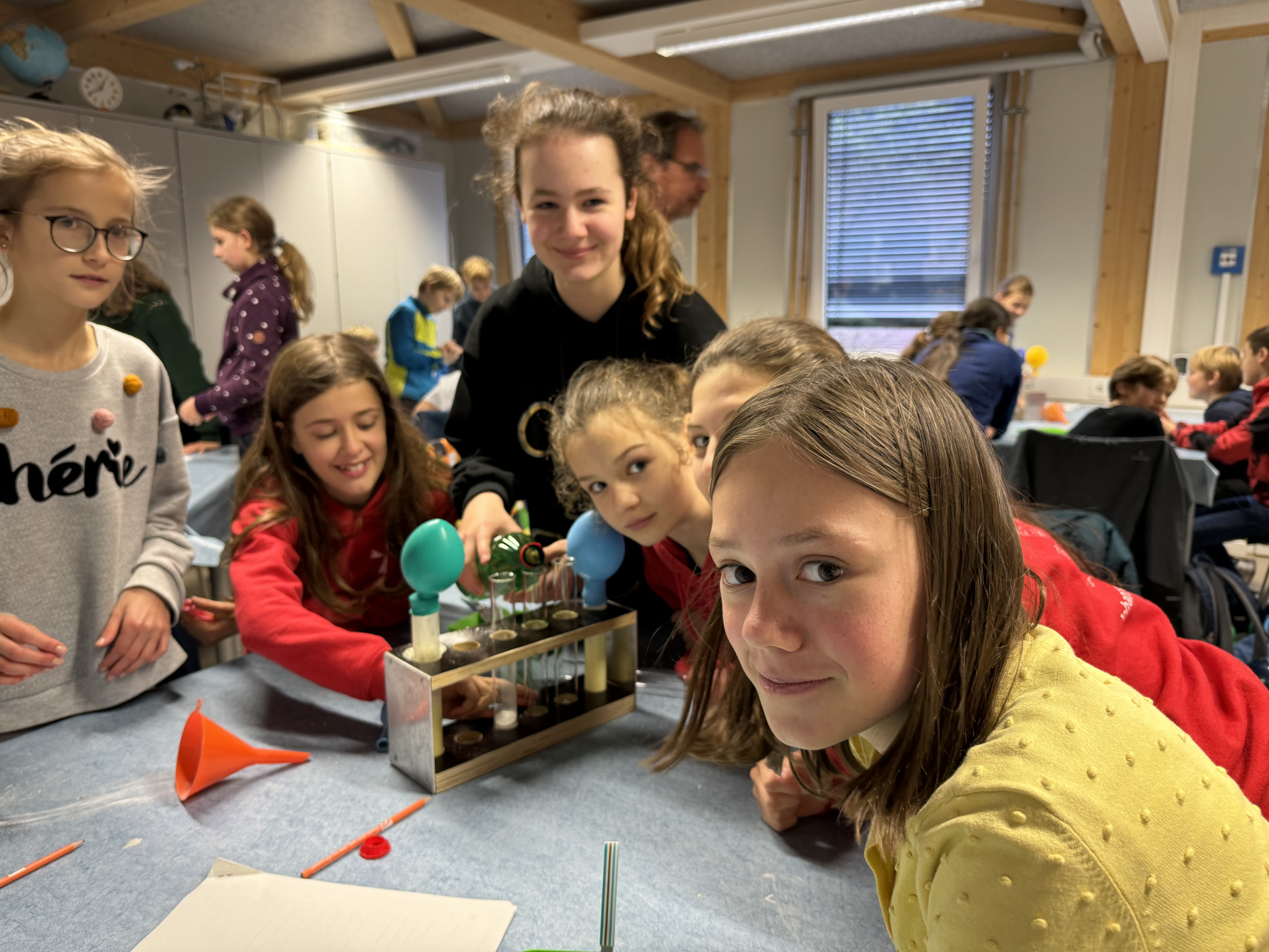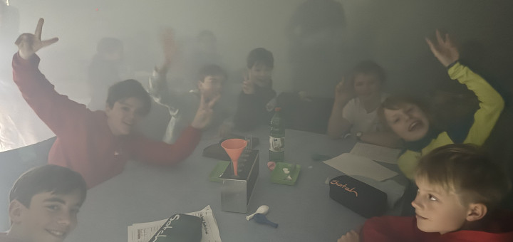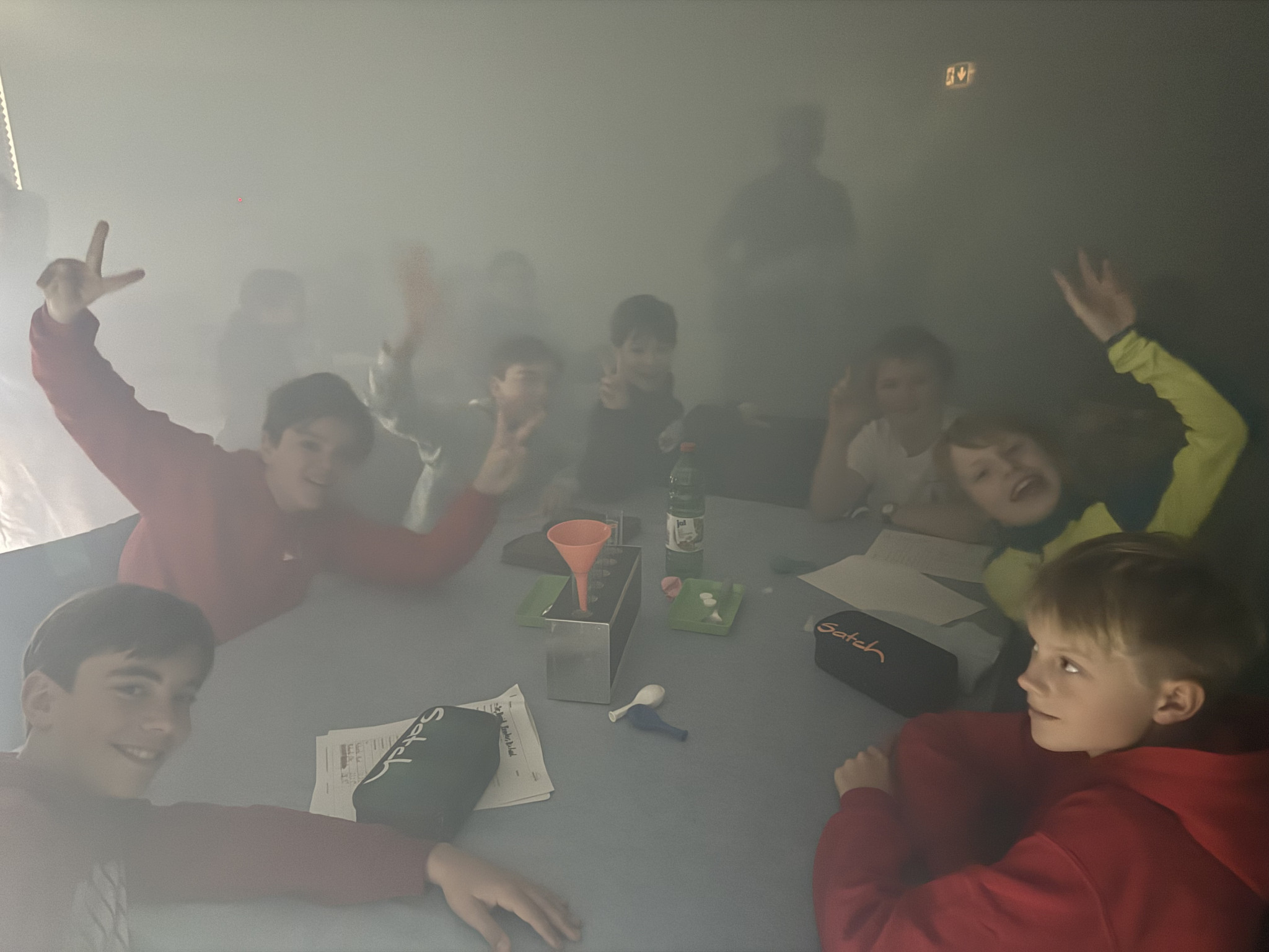 Wir riefen bei der Feuerwehr-Leitstelle an, um darüber zu informieren, dass wir ein Rauchexperiment starten wollen. Darauf wurde der ganze Raum in einen besonderen Dampf eingetaucht. Damit war die Luft sehr stickig. Es war fast so, als stünde man in einem Rauch, wenn es brennt, deshalb der Anruf. Dann lernten wir noch, welche Methode am besten funktioniert, um diesen Dampf loszuwerden, also im Normalfall die stickige Luft, und zwar mit Querlüften. Das letzte Experiment diente der Messung des Gewichts von CO². Wir erzeugten mit Brausepulver in Essig durch eine chemische Reaktion CO² und füllten es in einen Luftballon. Einen weiteren Ballon füllten wir mit Luft. Wir ließen beide von gleicher Höhe fallen und stellten fest, dass der CO²-Ballon schneller als der luftgefüllte Ballon zu Boden fiel. Das heißt, CO² ist schwerer als Luft. Deshalb ist die Luft am Boden schlechter als an der Decke. Nach diesen tollen Spektakeln gingen wir wieder zurück zur Schule.
