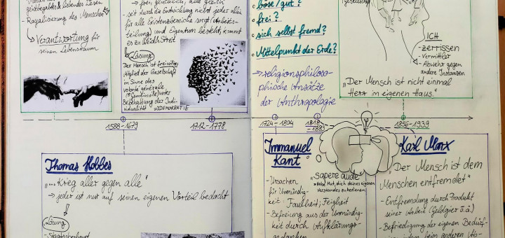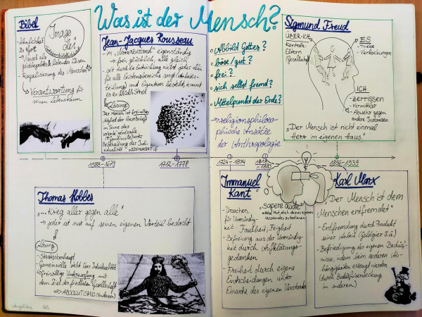Auch in unserem jetzigen und letzten Schuljahr haben wir bereits die Möglichkeit gehabt, ansprechende Doppelseiten zu gestalten. Nachdem das Semester Q2.1. fast vorüber ist, haben wir den Unterrichtsstoff mit den Themen Religion und Gesellschaft sowie Staatstheorie künstlerisch anreichern können. Auch über ein Jahr nach dem Beginn unseres Projekts können sich die Ergebnisse sehen lassen.