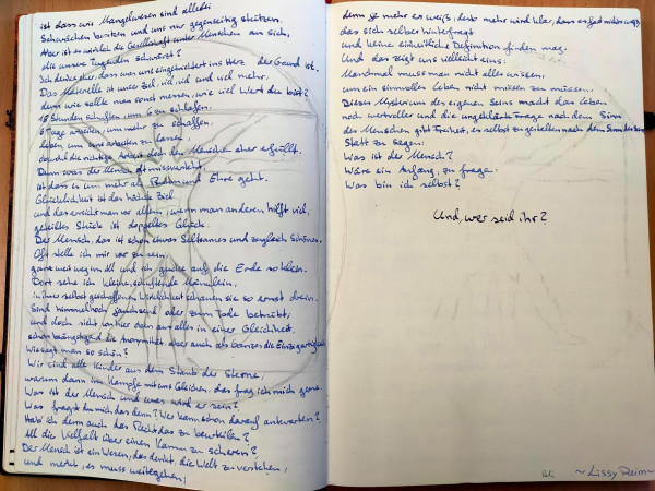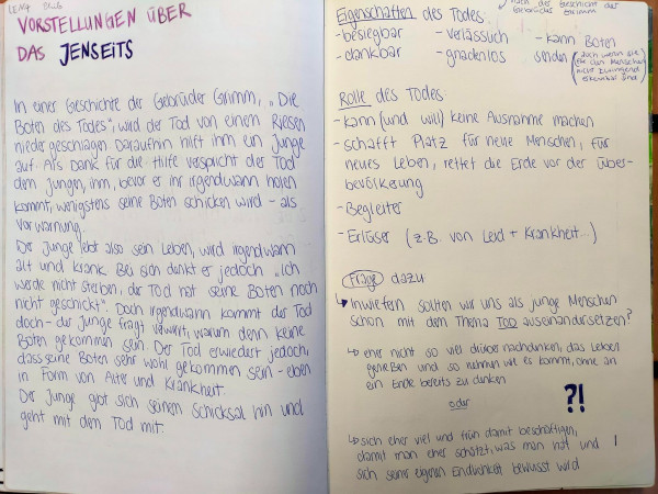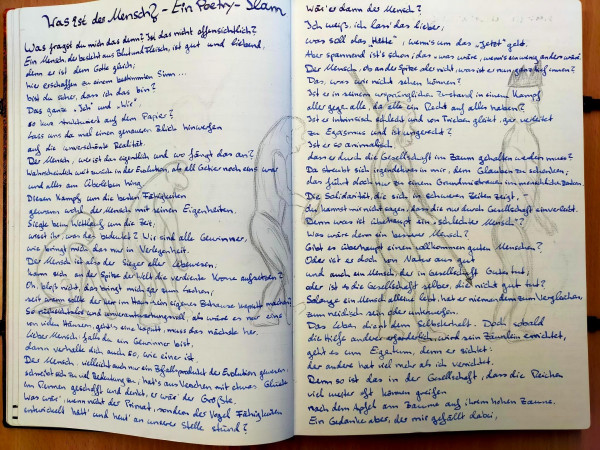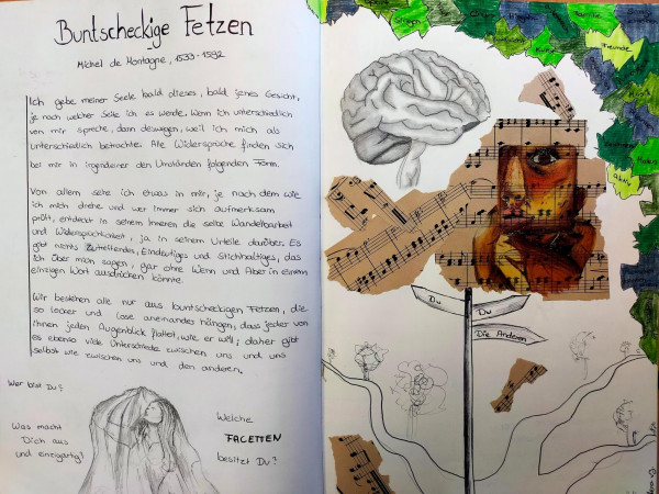 Ein gemeinsames „Tagebuch“, das immer wieder abwechselnd beschrieben und an den jeweils anderen Kurs zurückgegeben wird, sodass wir einen Eindruck der vielseitigen Unterrichtsinhalte erhalten und gleichzeitig gestalterisch kreativ werden können, hat den jeweilig anderen Unterricht greifbarer dargestellt.