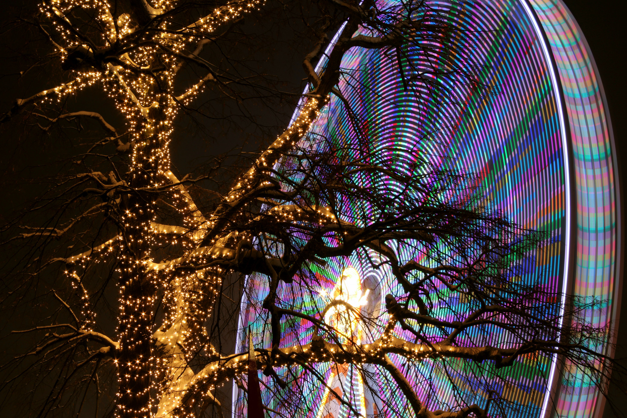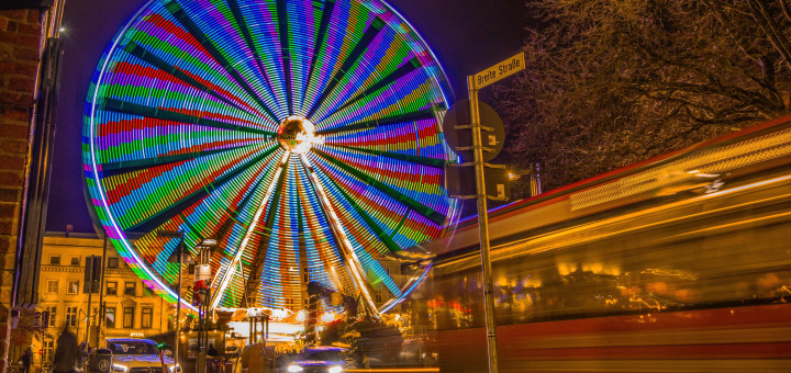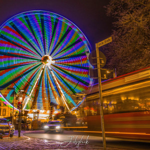 Besonders stimmungsvoll wird es, wenn nicht mehr das Tageslicht, sondern die bunten Lichter der Weihnachtszeit dominieren. Mit der Kamera auf dem Stativ sind wir, die FotoAG, losgezogen und haben das aktive Treiben auf einem Weihnachtsmarkt in Lübeck festgehalten. Besonderes Ziel war das Riesenrad auf dem Koberg. Die „Blaue Stunde“als auch die Nacht verlangen längere Belichtungszeiten – die Menschen und bewegte Körper (Riesenrad, Karussell) erscheinen durch ihre Bewegung je nach Länge der Belichtungszeit mehr oder weniger stark verwischt, was die Bildaussage unterstreichen kann.