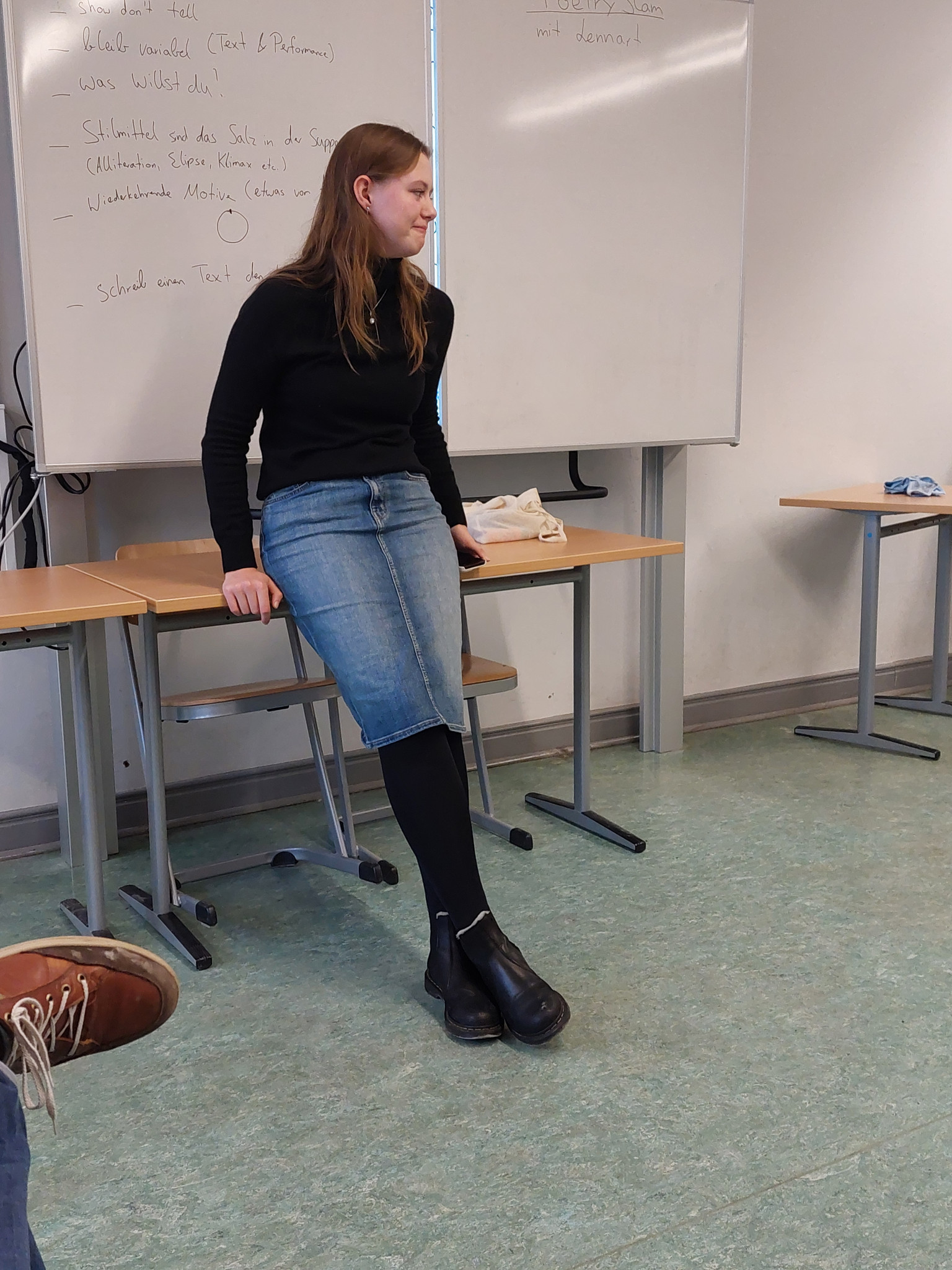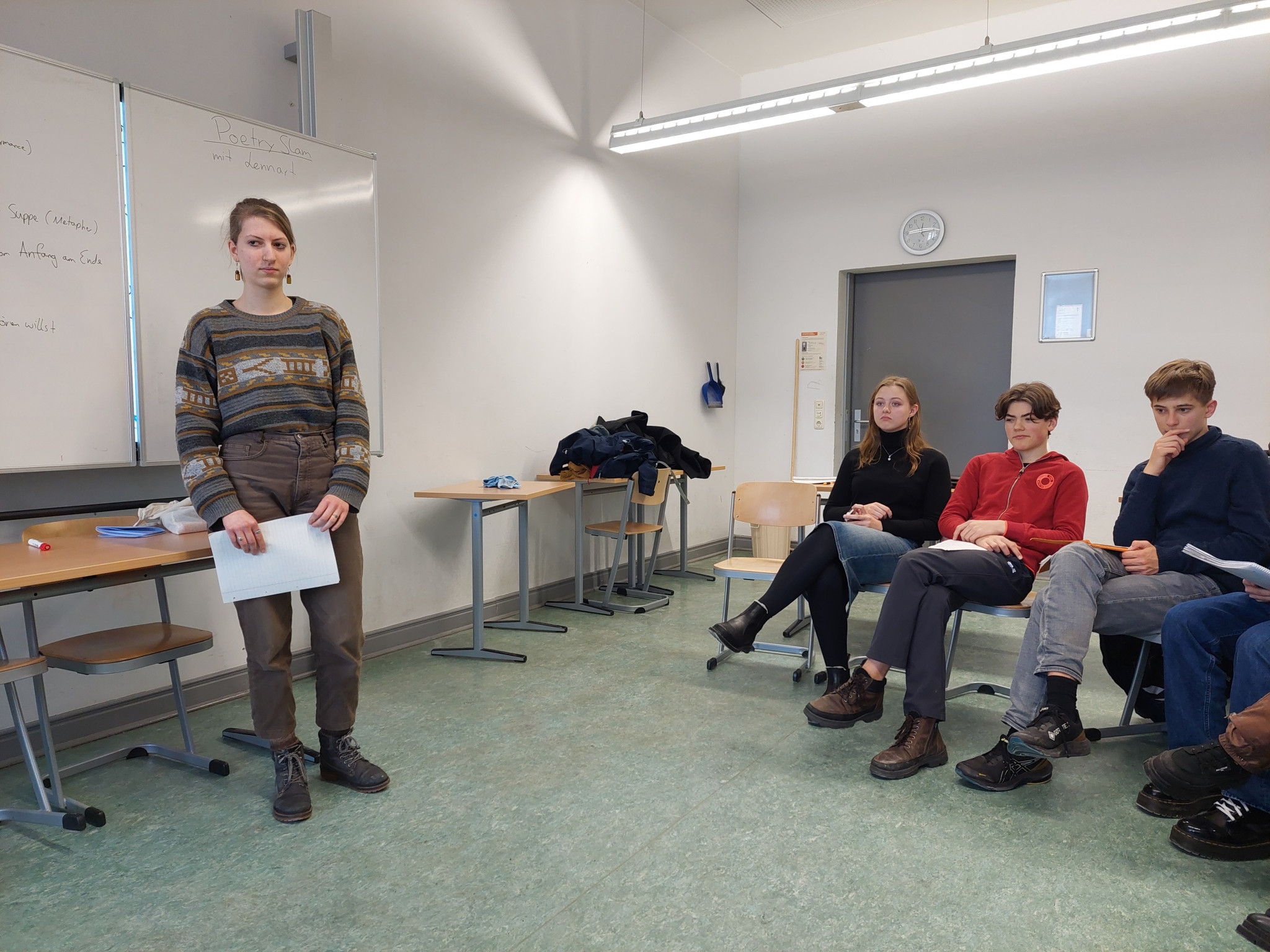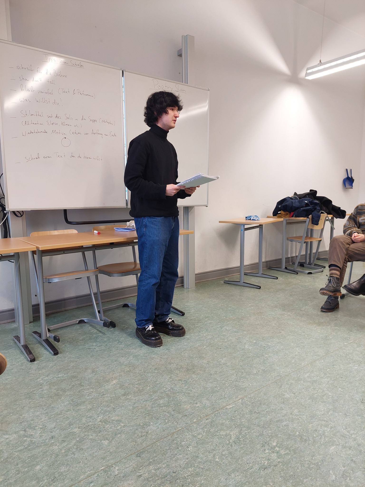 Worte können bewegen, belustigen und berühren. Was alles mit Worten möglich ist, haben einige interessierte Schüler:innen aus Klassenstufe 9, 10, Q1 und Q2 durch einen waschechten Poetry Slammer, nämlich Lennart Hamann aus Hamburg, in einem zweitägigen Workshop erfahren. Sie haben ausprobiert, wie man zu einem richtig guten Text kommt, den man bei einem Poetry Slam präsentieren kann.