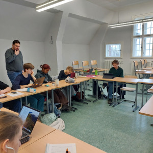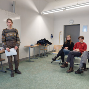 Aber wie schreibe ich denn nun so einen Text? Nach einem Begriffe-Brainstorming über das Thema „Winter“ ging es für alle ans Werk, einen Text über den nassen und stressigen, aber auch den glitzernden und gemütlichen Winter zu schreiben. Das große Aber kommt schließlich noch: Keiner der gesammelten Begriffe durfte verwendet werden, „Winter“ mit eingeschlossen. Nach Synonymen und anderen Formulierungen wurde angestrengt geknobelt, sodass Ausdrücke wie „das Ding nach dem Herbst“ zustande kamen. Das Umschreiben und Um-die-Ecke-Denken ist eine lohnende Strategie für Poetry Slam-Texte, um den Text bildlicher und interessanter wirken zu lassen. Gerade dieses Ausbrechen und Verfremden von Bekanntem kann ein Schlüssel zum Erfolg sein, um das Interesse des Publikums zu wecken und aufrecht zu erhalten. Die am Ende vorgestellten Texte bezeugten diese Versuche und haben gezeigt, mit wie viel Tiefgang, Mut und Kreativität die Teilnehmenden schreiben und präsentieren können. Am Ende des ersten Tages wurde sich schon fleißig Gedanken für einen längeren Text gemacht, der dann an Tag zwei verfasst und ausprobiert wurde.
