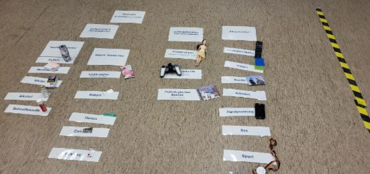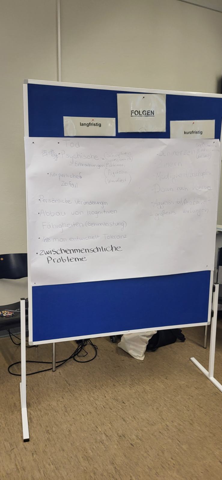 Wir haben an dem Tag einiges über verschiedene Süchte und Suchtmittel erfahren, z.B. dass es risikolosen Konsum von Alkohol nicht gibt und dass Alkoholkonsum von jungen Menschen im Alter zu Alzheimer, Demenz und Parkinson führen kann; oder dass Nikotin ein starkes Nerven- und Zellengift ist, an dem täglich 350 Menschen in Deutschland sterben, weil im Tabakrauch alleine schon über 400 chemische Stoffe enthalten sind, von denen etwa 40 krebserregend sind.